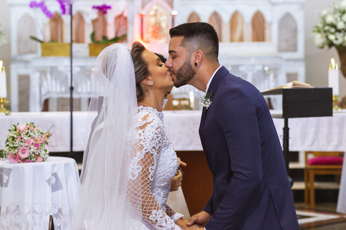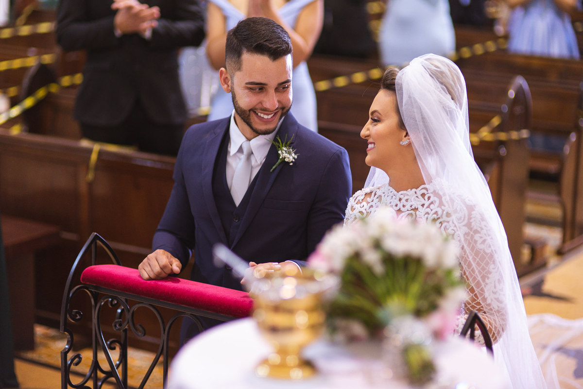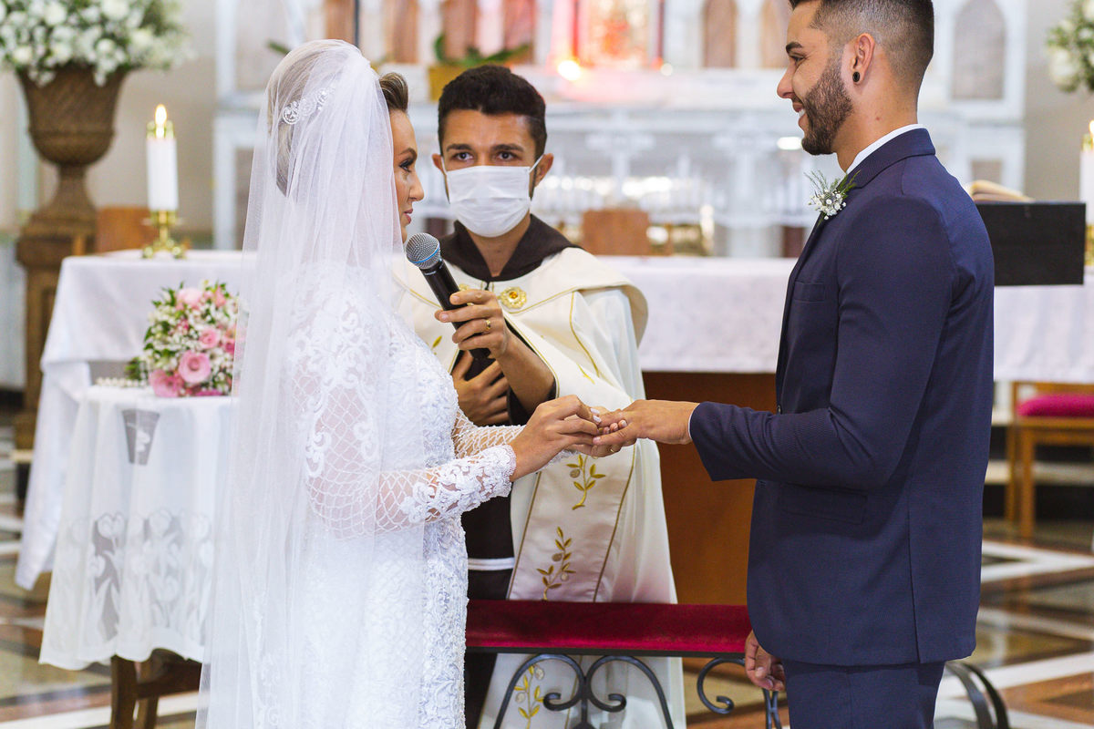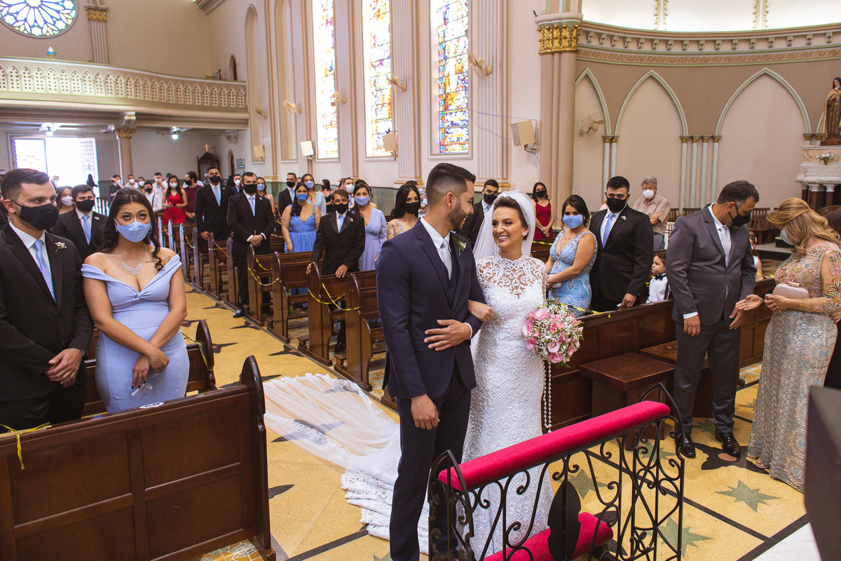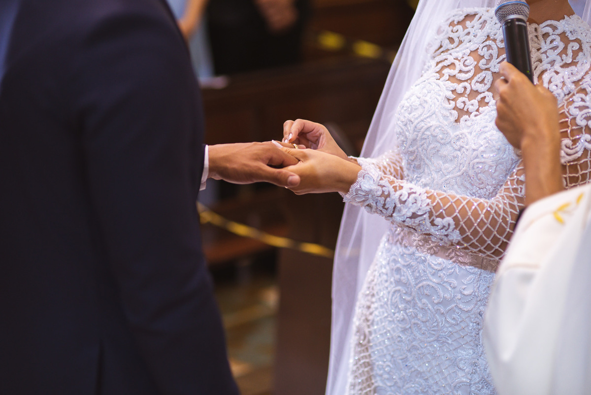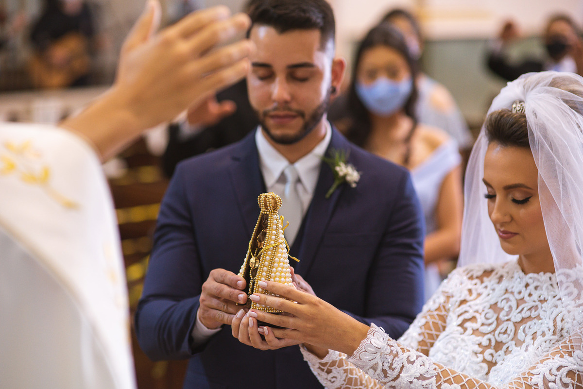 Em um encontro memorável, Fernanda despediu de seu pai que imediatamente entregou a mão de sua filha ao noivo. Fernanda e Erivelto trocaram olhares e sorrisos, o noivo beijou respeitosamente sua mão e posteriormente sua testa. Assim, agora juntinhos eles caminharam para a bênção religiosa. A leitura do versículo e a homilia foi linda. Com a equipe de Rejane Siqueira e banda, a cerimônia deu prosseguimento. Os dois trocaram as alianças e foram abençoados. Mediante o Padre, eles foram declarados casados diante da lei de Deus e também dos homens. Fizemos as fotografias de praxe e a cerimônia foi finalizada. Na saída, os padrinhos assopraram bolinhas de sabão enquanto aguardavam os noivos do lado de fora. Quando Fernanda e Erivelto chegaram, a comemoração foi intensa. Eles receberam o carinho dos convidados e partimos rumo à recepção.