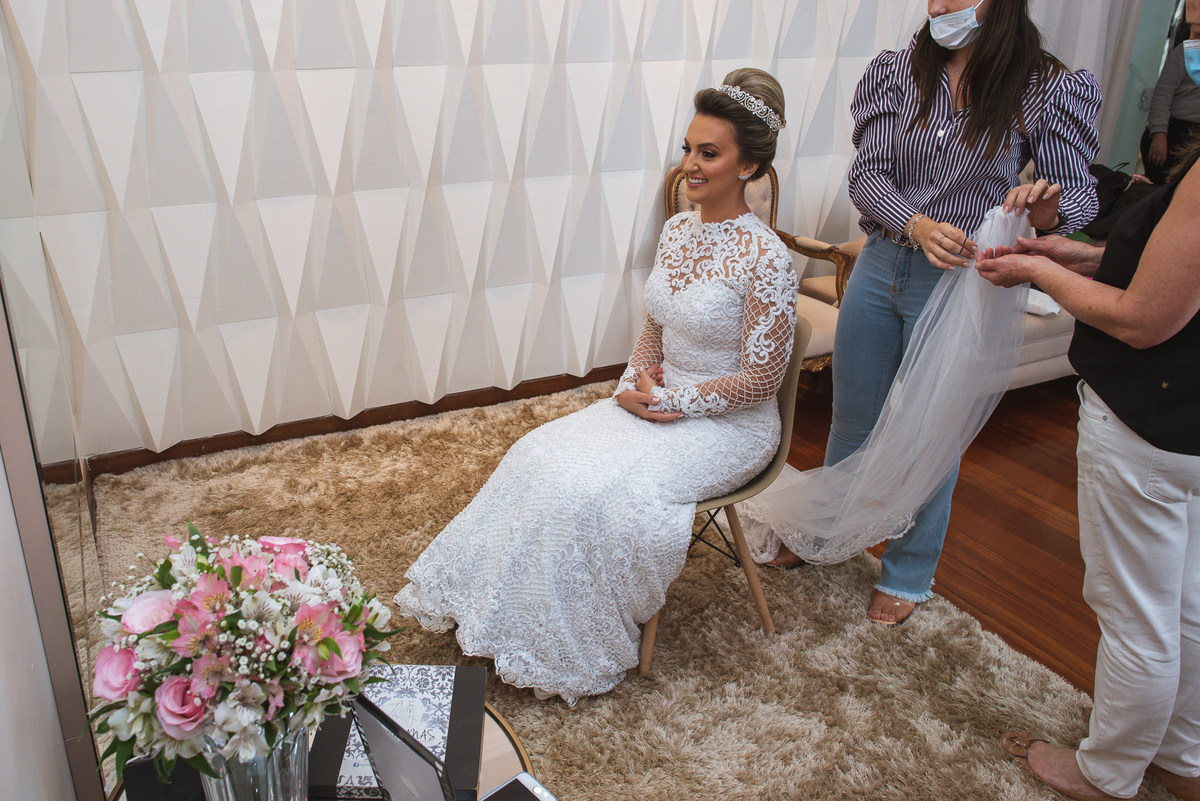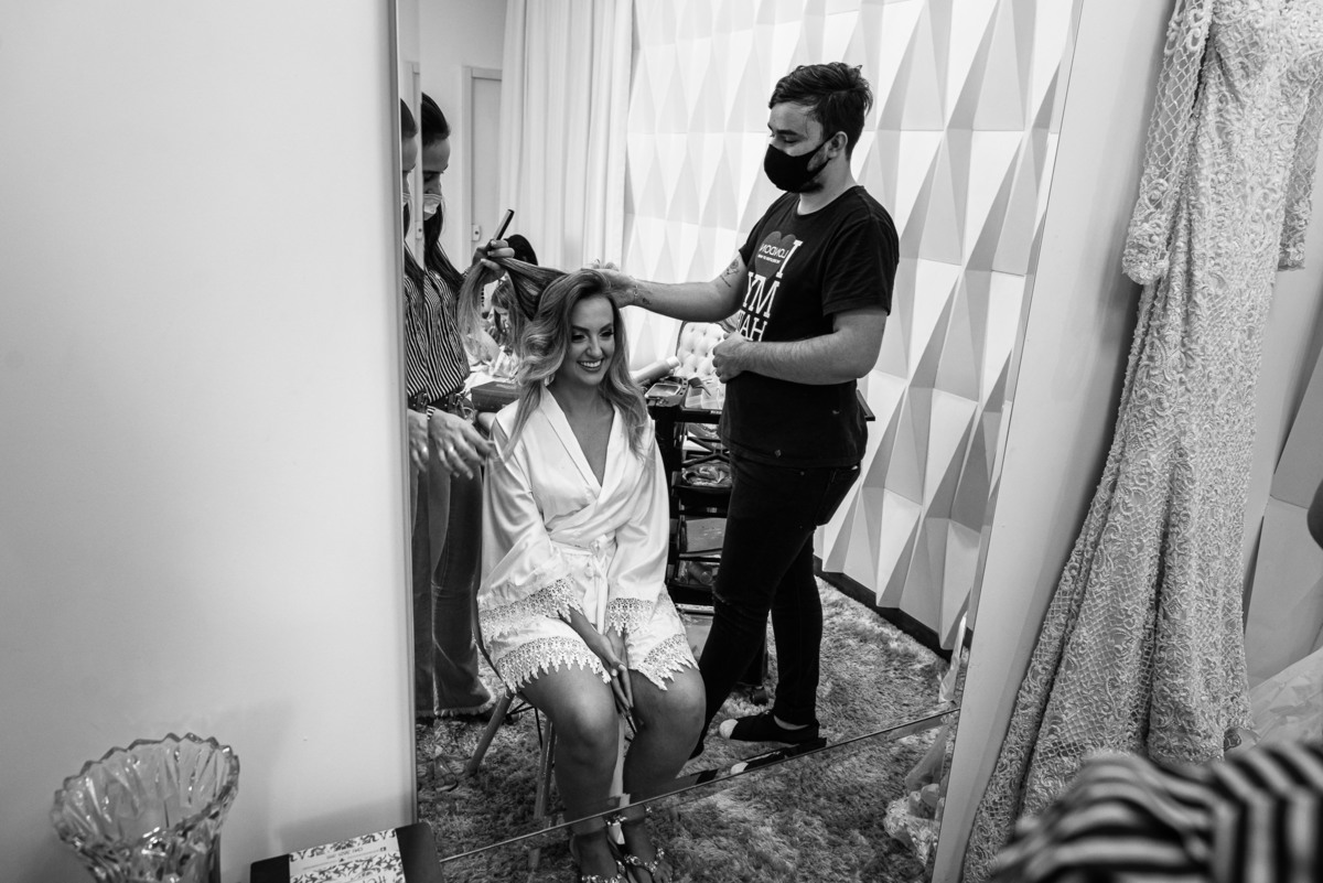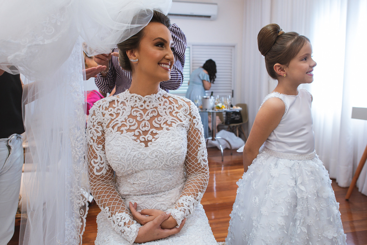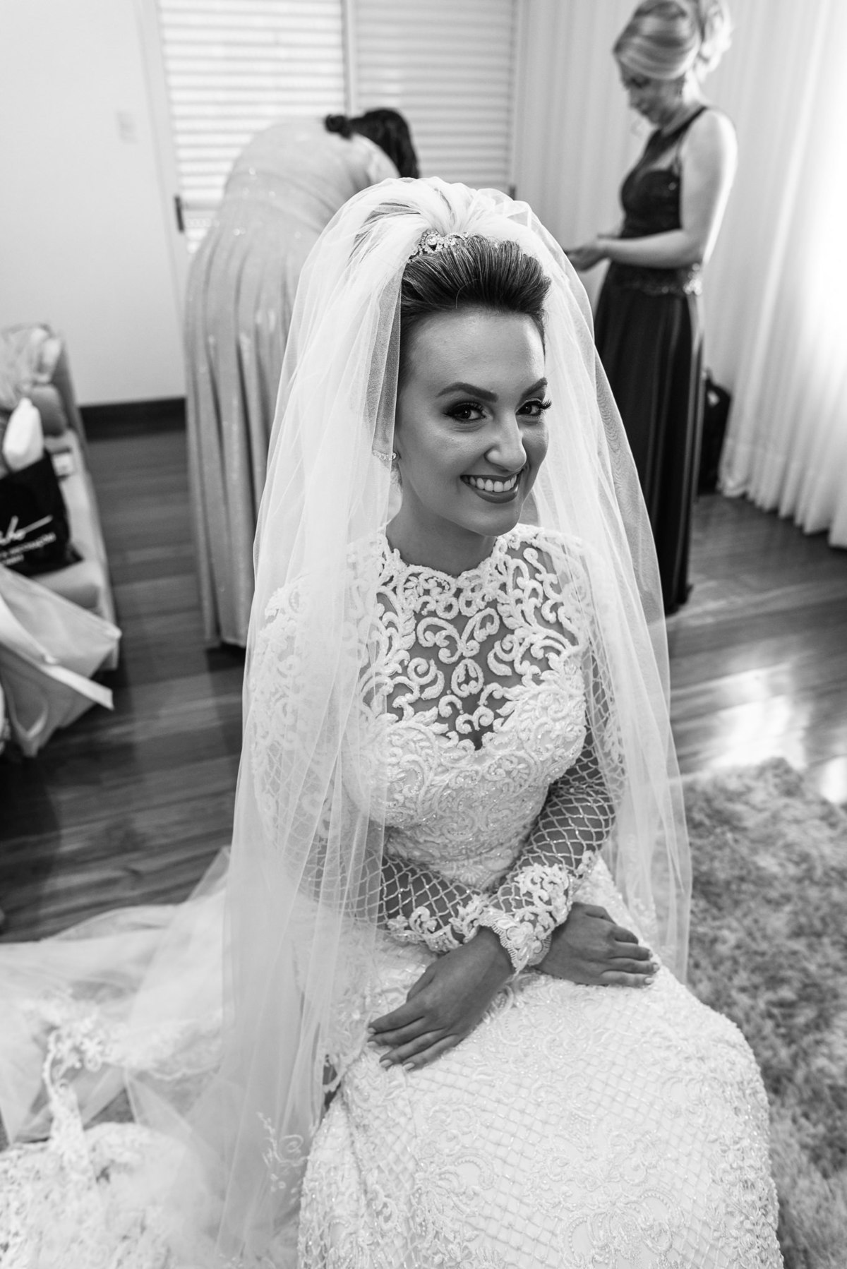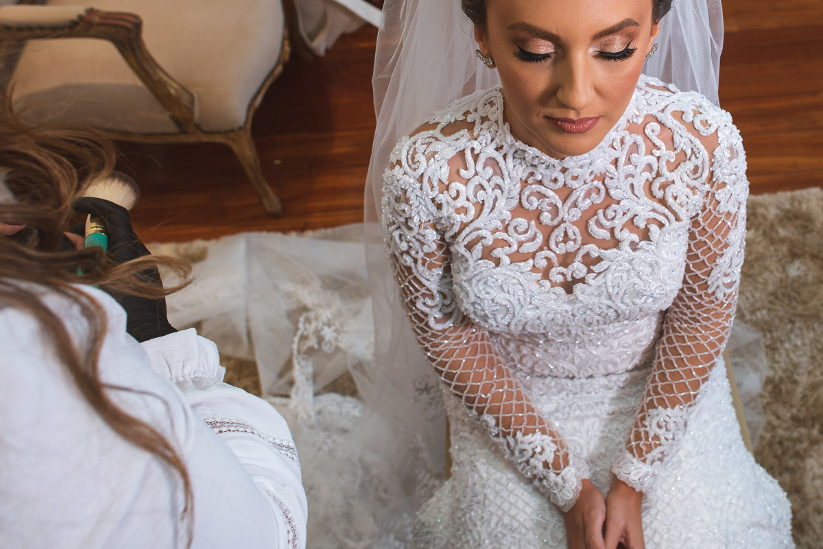 Começamos o making of dos noivos praticamente ao mesmo tempo. Enquanto o segundo fotógrafo foi acompanhar o noivo, eu fiquei junto com a Fernanda no salão. Assim que cheguei, já visualizei uma galera! Fernanda estava acompanha de algumas madrinhas, sua mãe, daminha de honra e até mesmo a mãe do noivo fizeram parte desse momento. O clima era de muita felicidade. A noiva estava radiante e com o coração super ansioso para que chegasse logo o momento do sim. Aos poucos, a make escolhida por ela estava ficando pronta. O penteado, assinado pela especialista Lara Marins, tomava forma e encantava a noiva. Quando finalmente ele ficou pronto, a noiva até suspirou... Pra completar o requinte do penteado, uma coroa de brilhantes impecável deu o toque final. Todos nós que vimos esse momento ficamos extasiados.