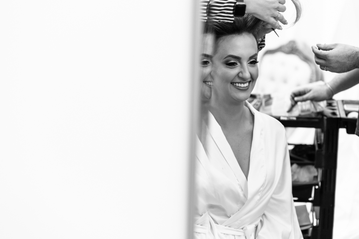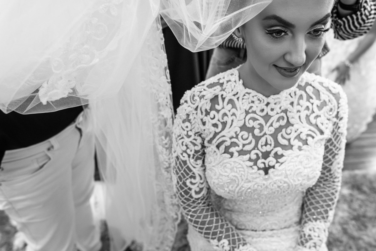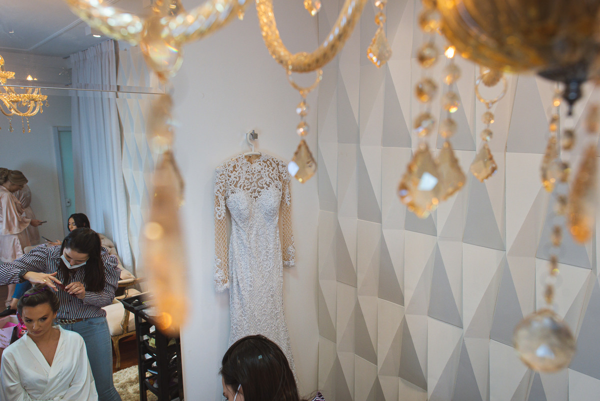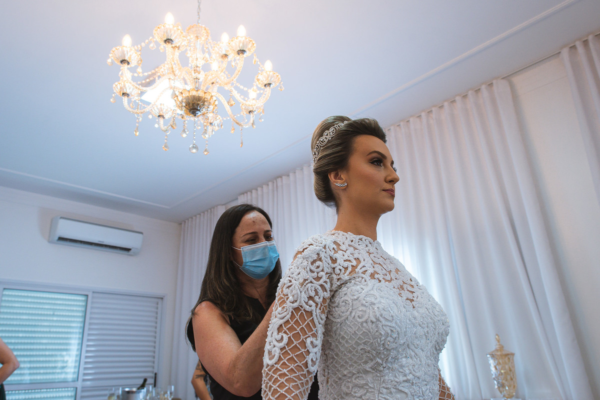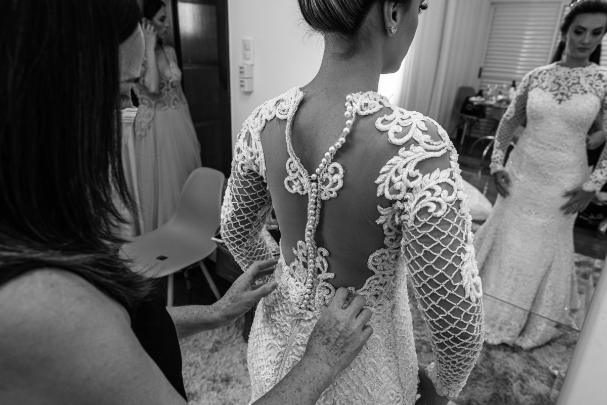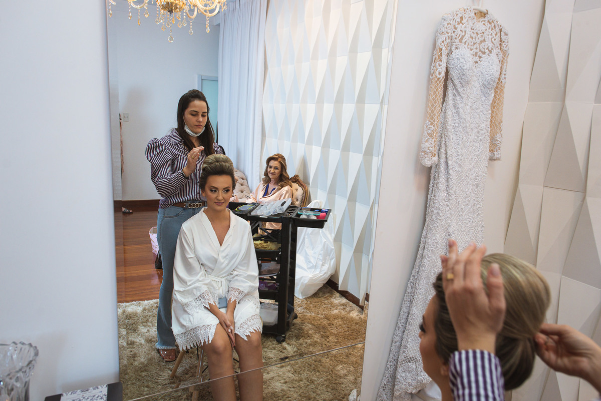 Começamos o making of dos noivos praticamente ao mesmo tempo. Enquanto o segundo fotógrafo foi acompanhar o noivo, eu fiquei junto com a Fernanda no salão. Assim que cheguei, já visualizei uma galera! Fernanda estava acompanha de algumas madrinhas, sua mãe, daminha de honra e até mesmo a mãe do noivo fizeram parte desse momento. O clima era de muita felicidade. A noiva estava radiante e com o coração super ansioso para que chegasse logo o momento do sim. Aos poucos, a make escolhida por ela estava ficando pronta. O penteado, assinado pela especialista Lara Marins, tomava forma e encantava a noiva. Quando finalmente ele ficou pronto, a noiva até suspirou... Pra completar o requinte do penteado, uma coroa de brilhantes impecável deu o toque final. Todos nós que vimos esse momento ficamos extasiados.