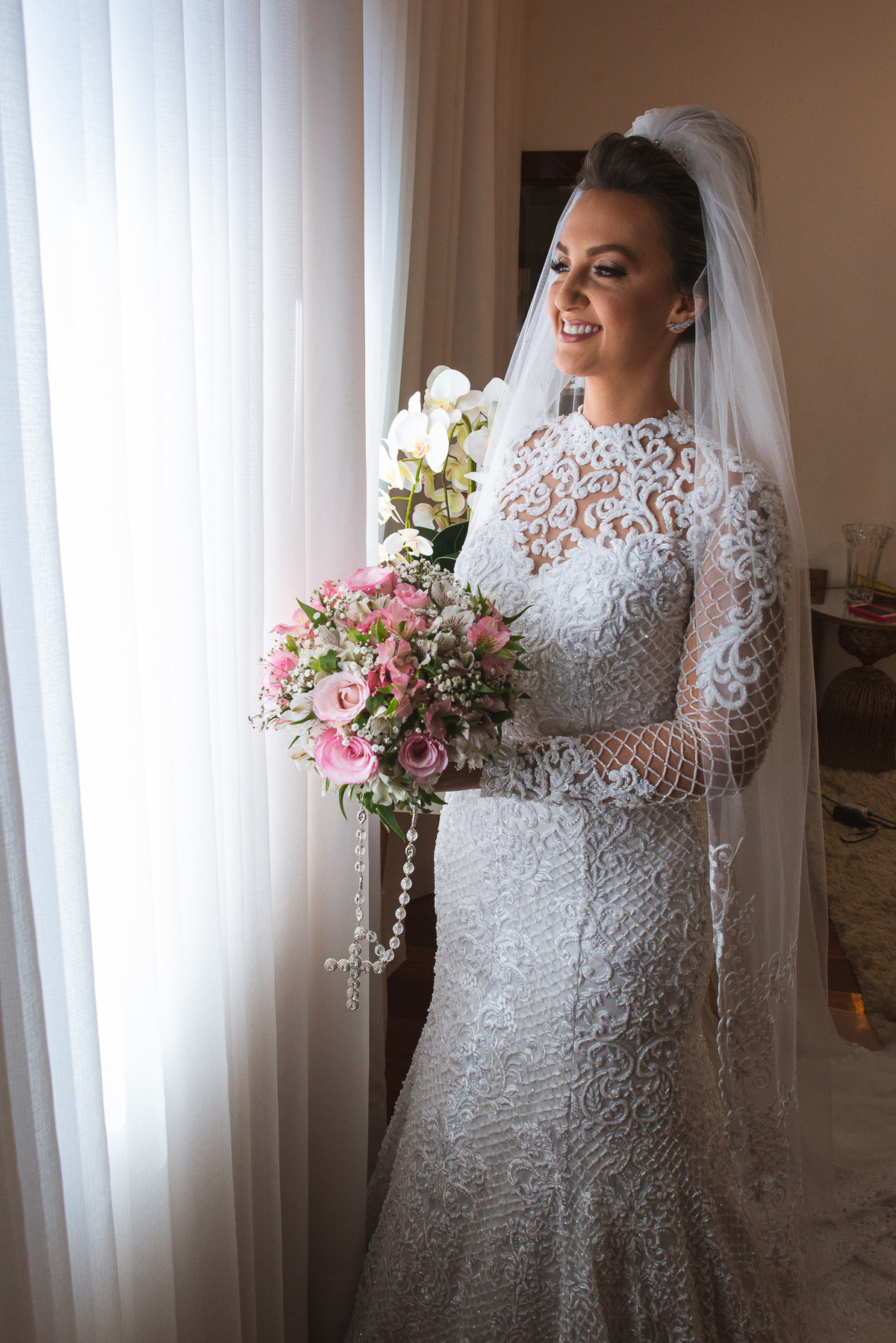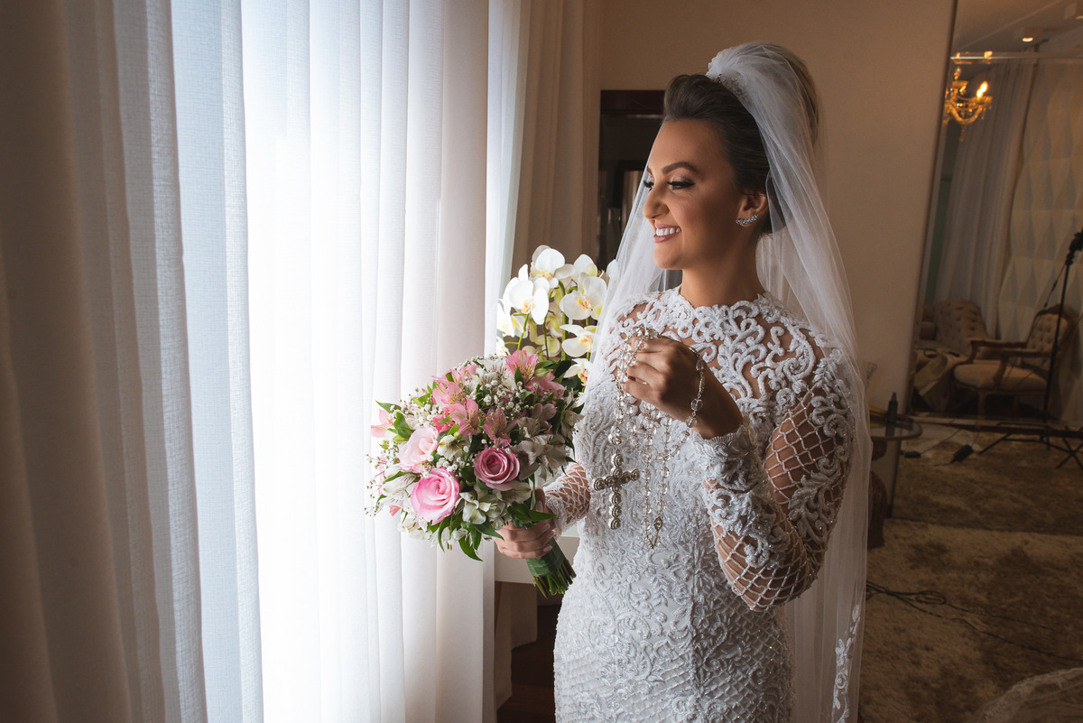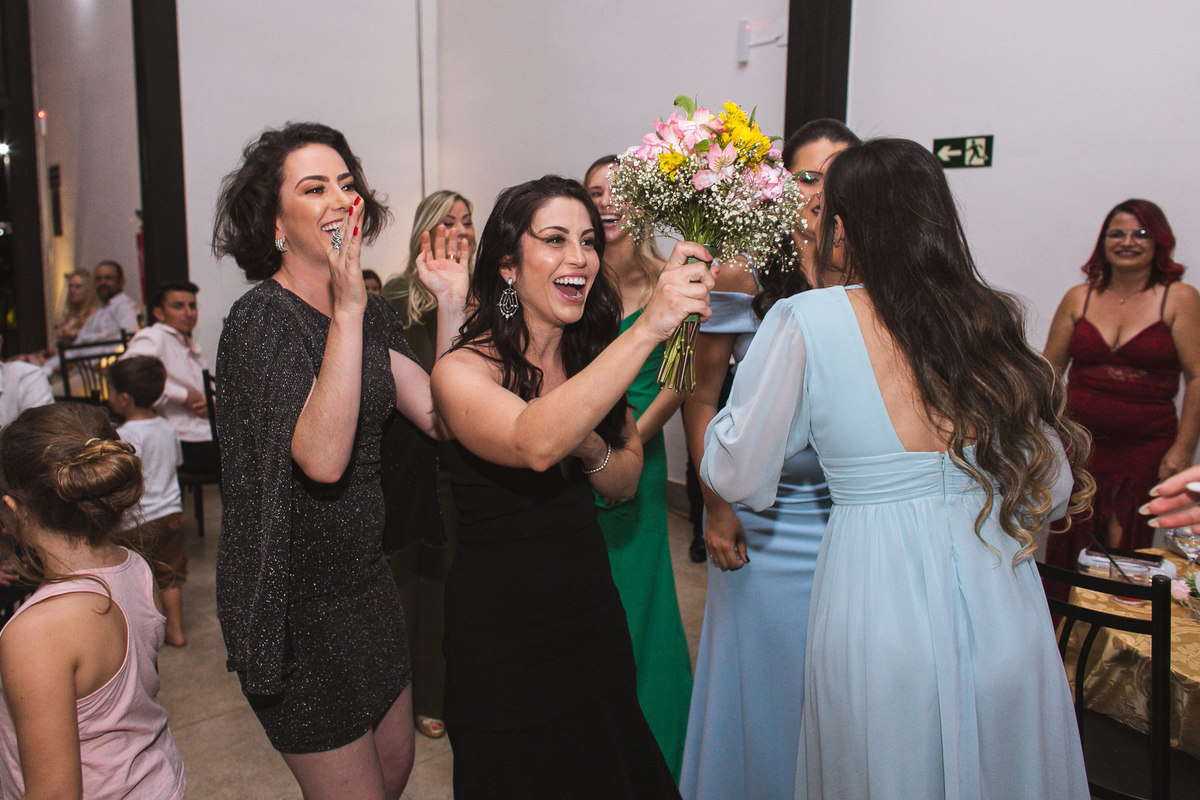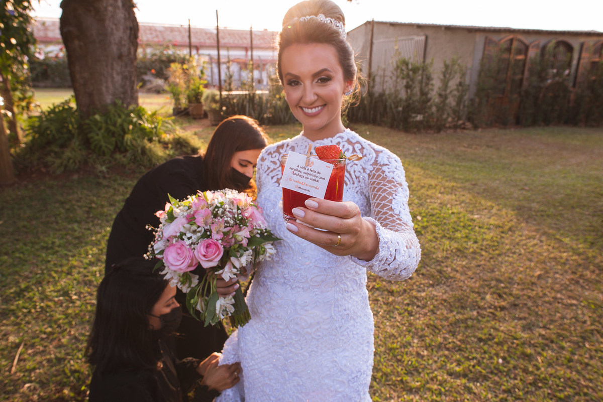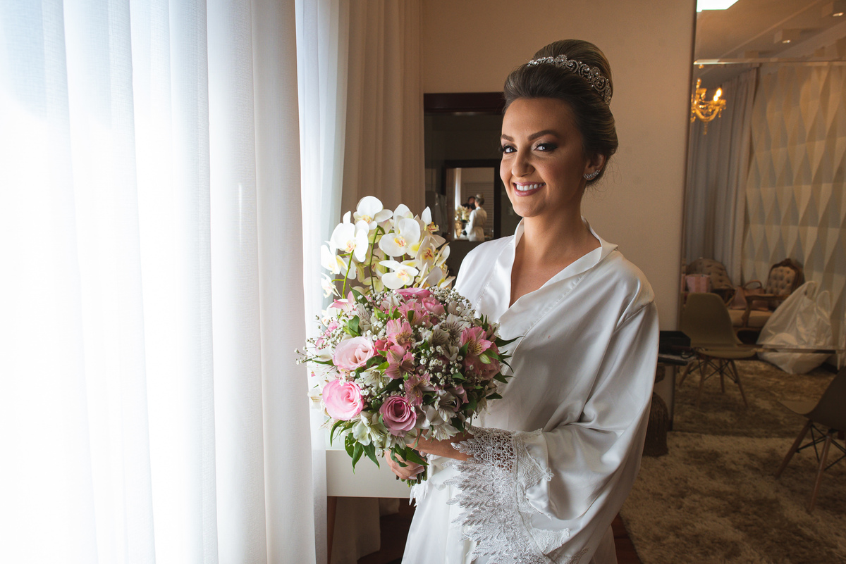 Fizemos um brinde muito festivo, suas madrinhas todas super felizes e empolgadíssimas com o casamento brindaram com a noiva. Logo, Erivelto fez uma surpresa incrível pra sua noiva. Um lindo buquê de flores foi enviado para ela durante o making of. Pensa na dificuldade da noiva em segurar a emoção. Ela mal conseguiu ler o cartão que o noivo enviou junto e já encheu os olhos. Foi incrível! Também pouco antes desse momento, ela recebeu das mãos da cerimonialista Rose Vieira o buquê que ela entraria na igreja. Sorriso? De canto a canto do rosto.