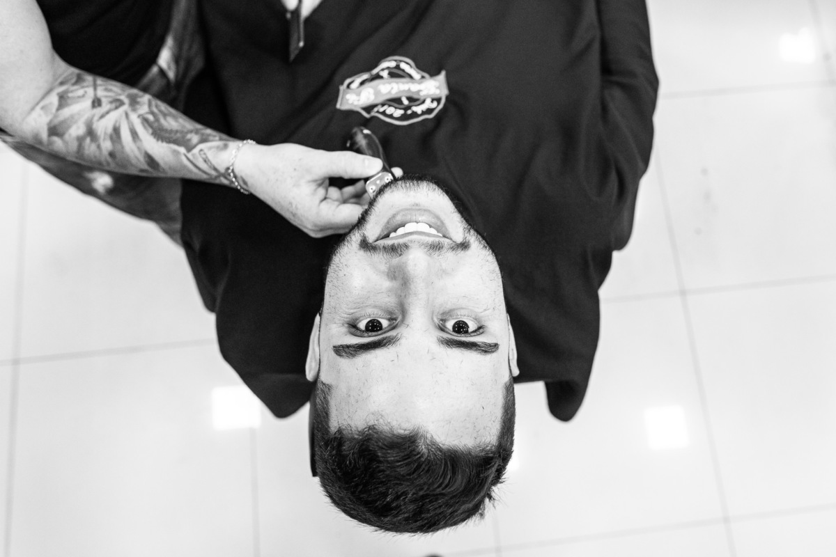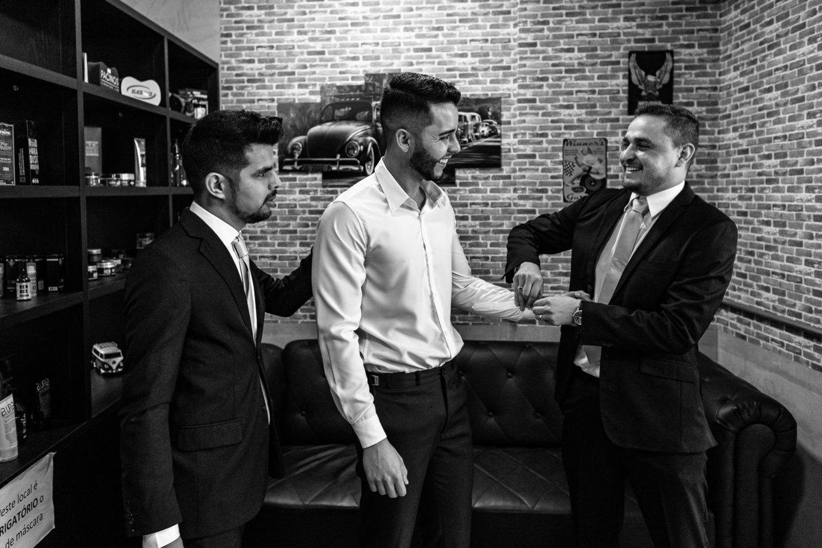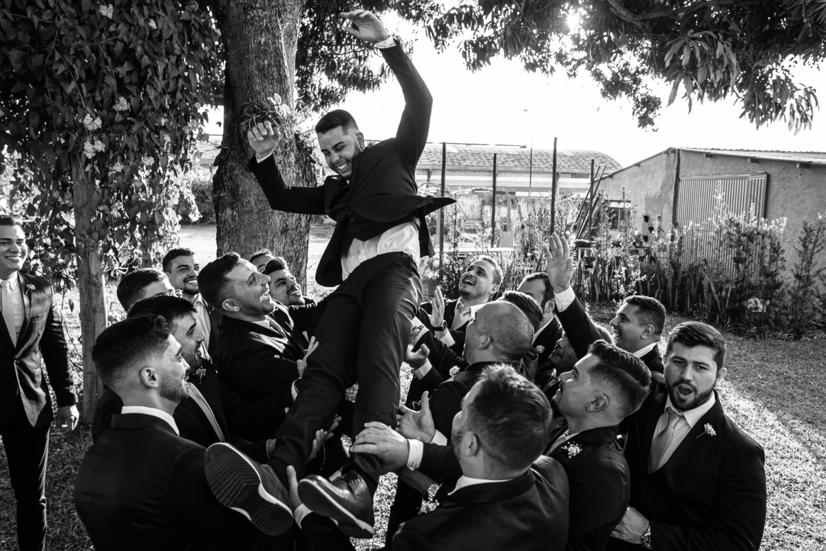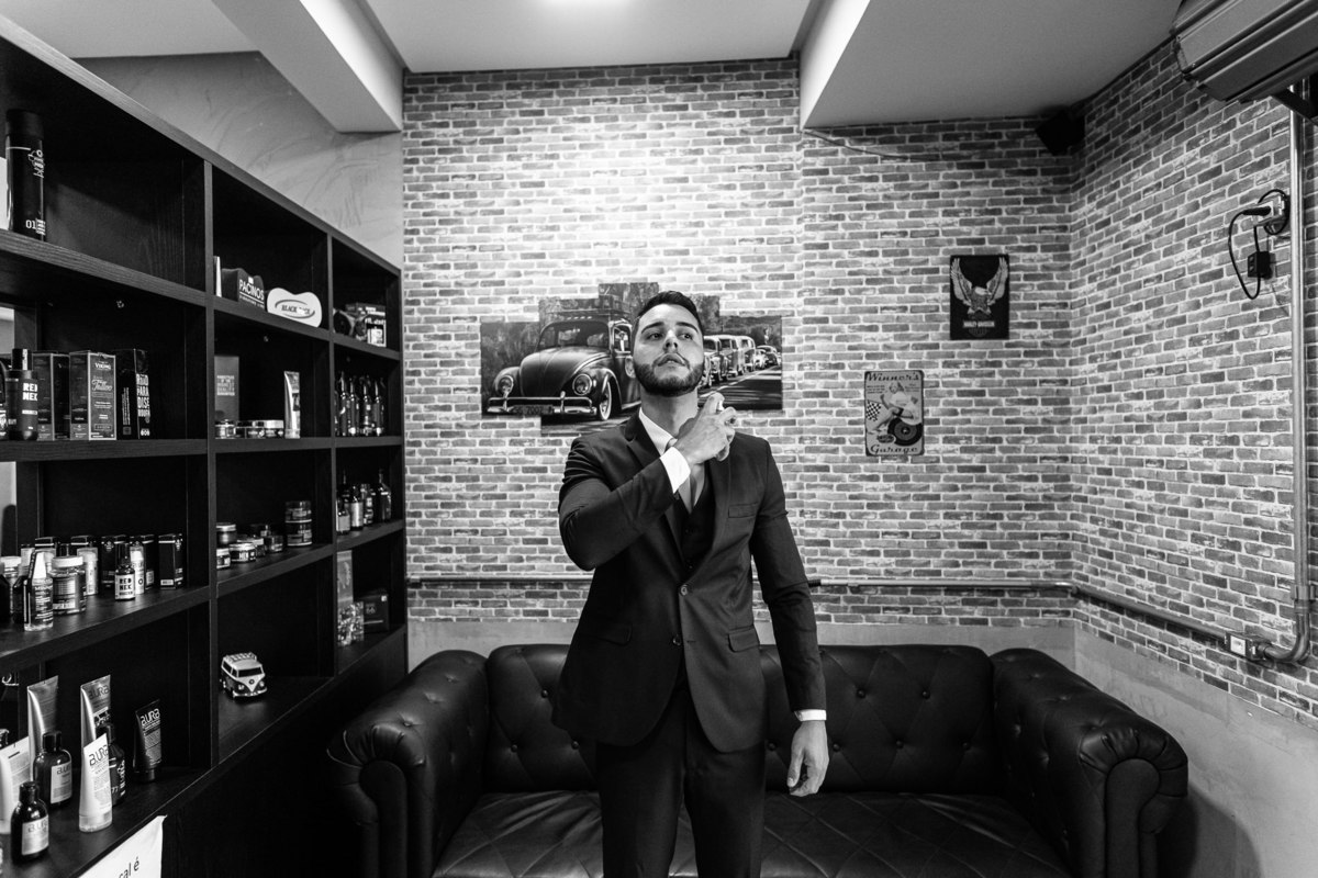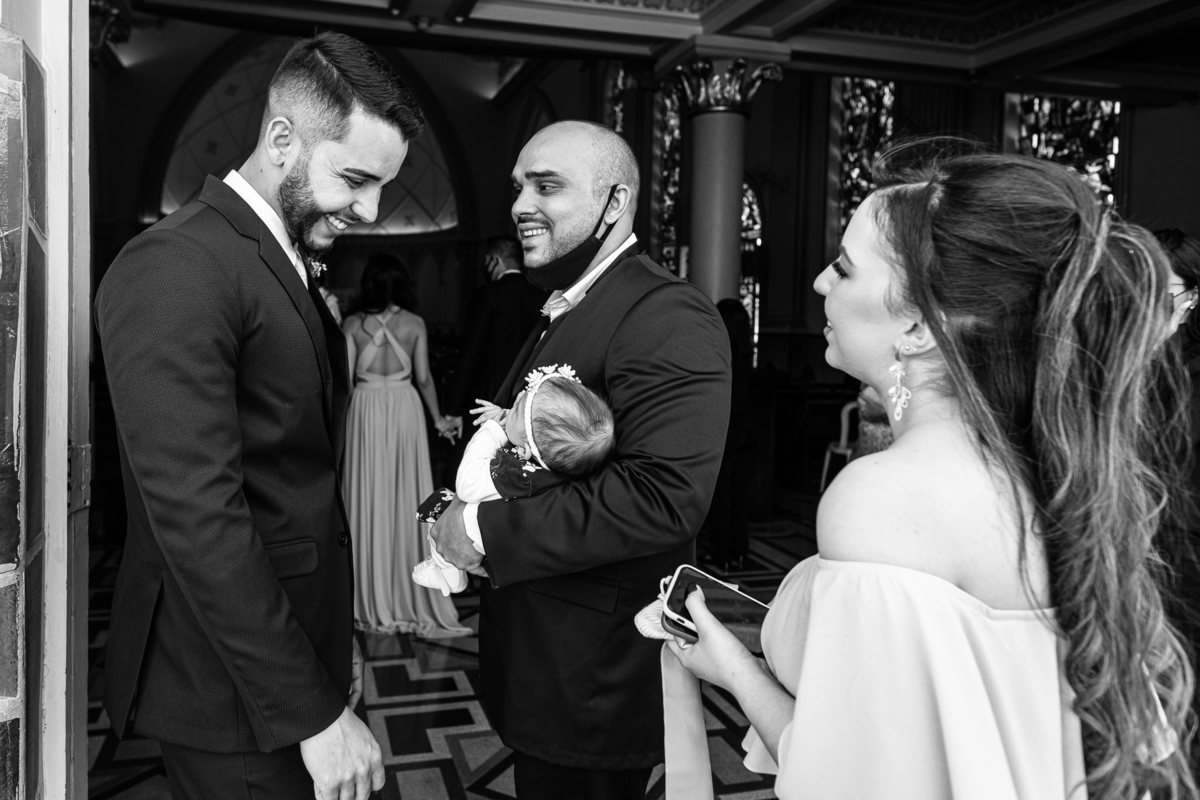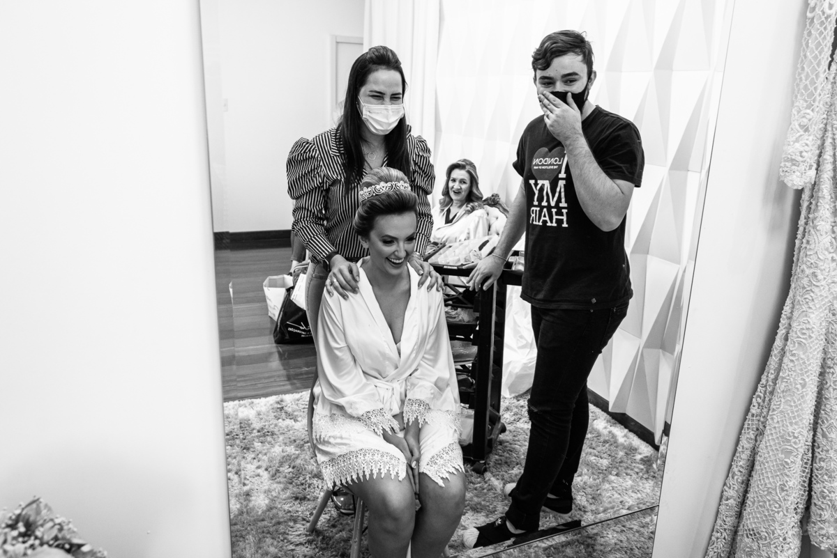 Fizemos um brinde muito festivo, suas madrinhas todas super felizes e empolgadíssimas com o casamento brindaram com a noiva. Logo, Erivelto fez uma surpresa incrível pra sua noiva. Um lindo buquê de flores foi enviado para ela durante o making of. Pensa na dificuldade da noiva em segurar a emoção. Ela mal conseguiu ler o cartão que o noivo enviou junto e já encheu os olhos. Foi incrível! Também pouco antes desse momento, ela recebeu das mãos da cerimonialista Rose Vieira o buquê que ela entraria na igreja. Sorriso? De canto a canto do rosto.