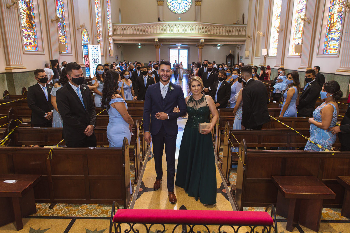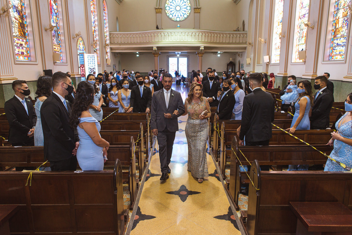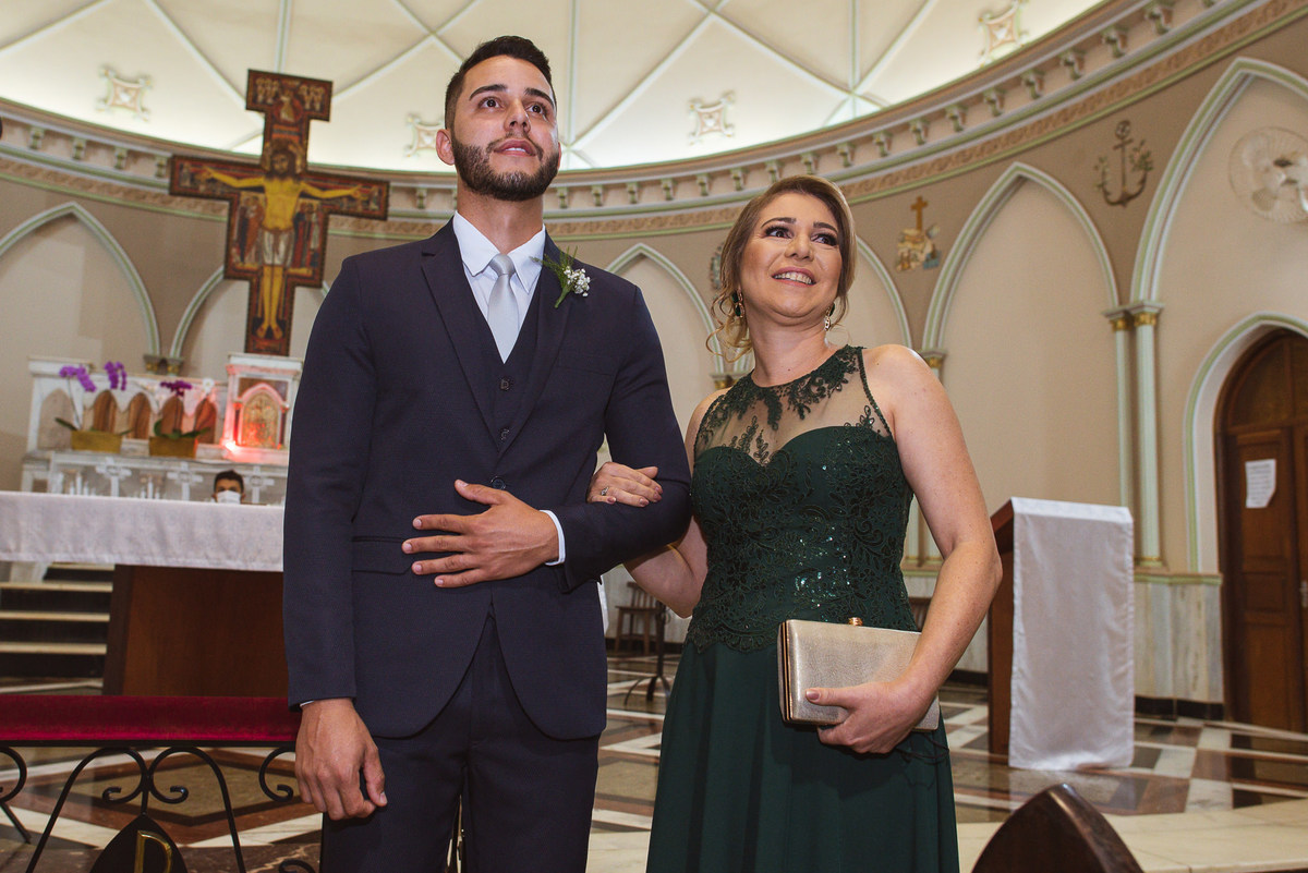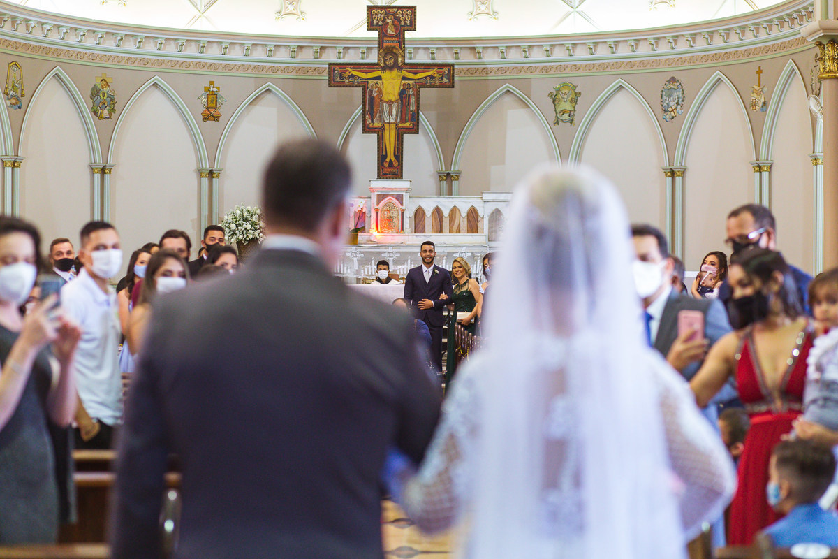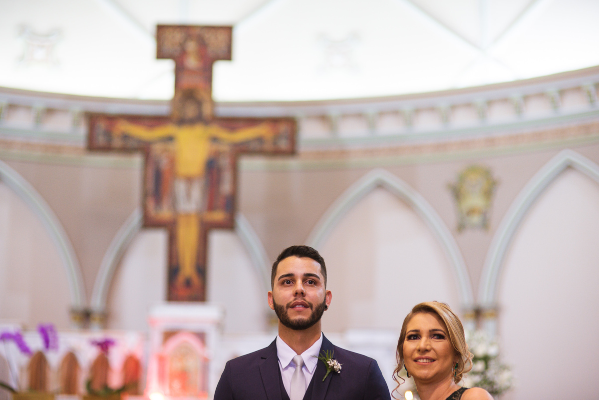 Enquanto os padrinhos adentravam, os pajens também faziam seu papel. Um deles disparou na frente e quando chegou no final, resolveu voltar. Coisa de criança né! É bom demais a alegria que elas trazem pro casamento. Finalmente, o noivo e sua mãe entraram caminhando rumo ao altar. Erivelto distribuiu sorrisos para todos os lados e todos os padrinhos. Agora, era a vez da noiva fazer sua entrada triunfal. Ao som do violino e com as portas da igreja fechadas, iniciava ali a sua entrada. Assim que as portas se abriram, a luz adentrou ao templo e criou uma cena de encher os olhos. O noivo abriu um mega sorriso ao ver sua noiva caminhar rumo ao altar.