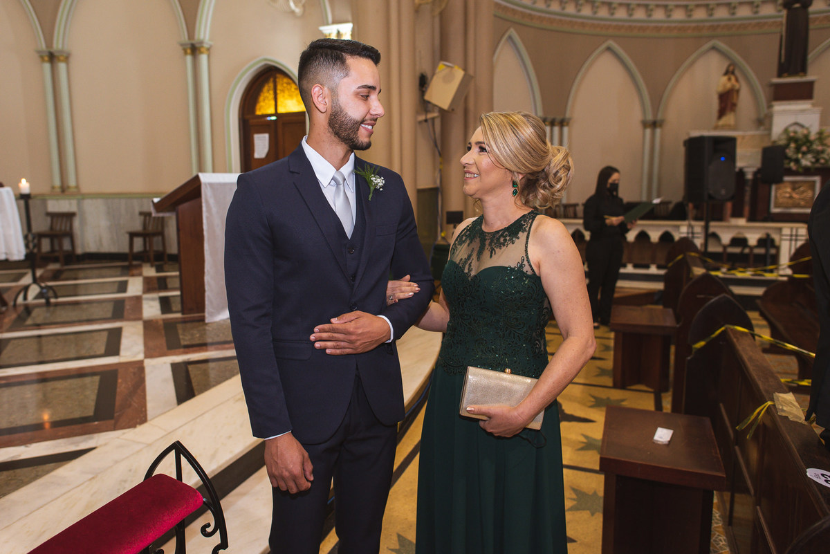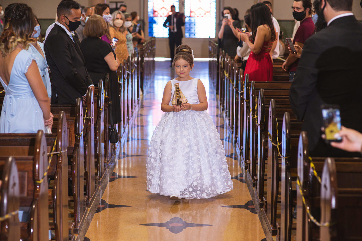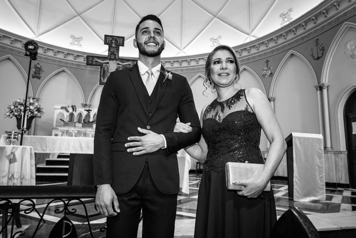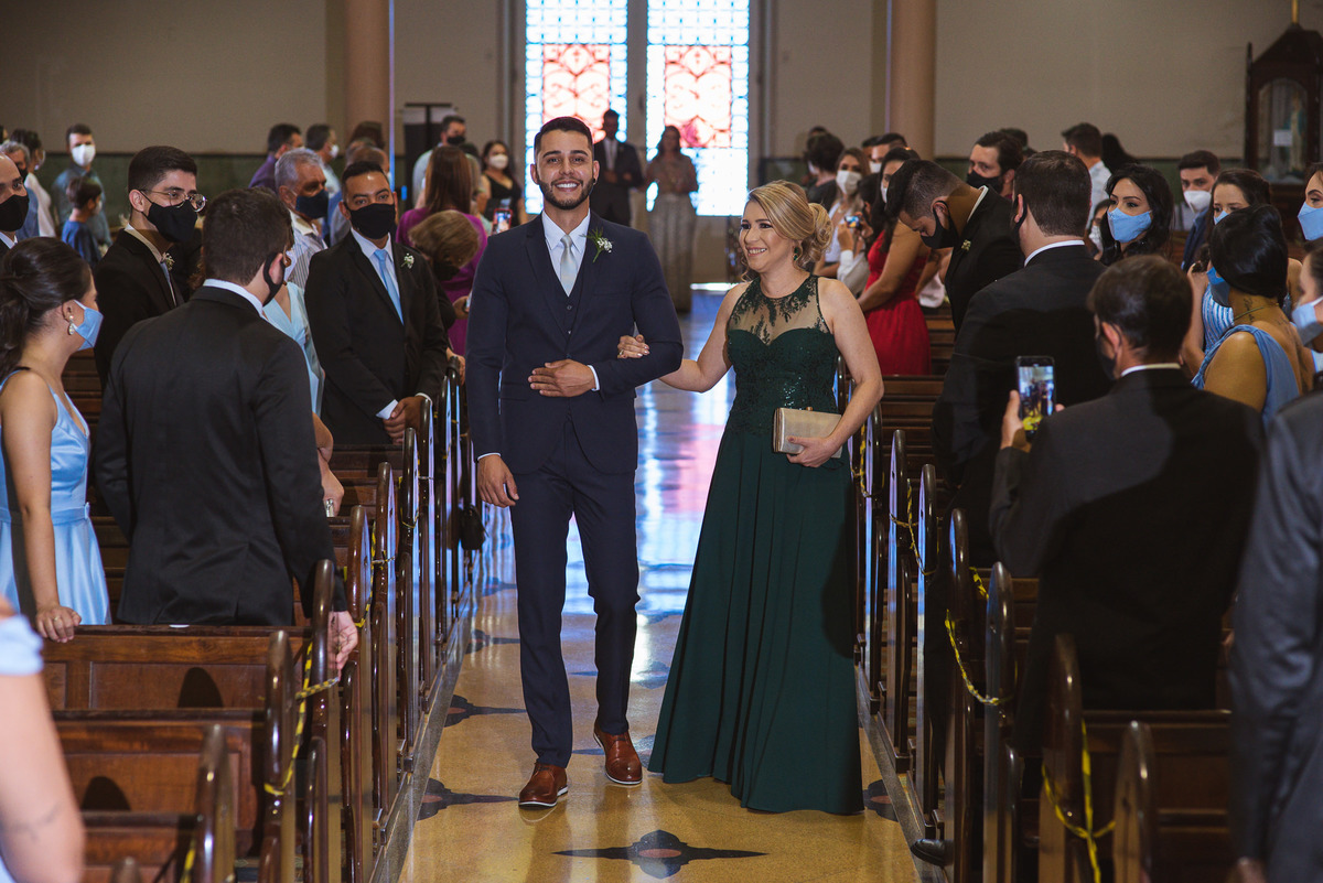 Enquanto os padrinhos adentravam, os pajens também faziam seu papel. Um deles disparou na frente e quando chegou no final, resolveu voltar. Coisa de criança né! É bom demais a alegria que elas trazem pro casamento. Finalmente, o noivo e sua mãe entraram caminhando rumo ao altar. Erivelto distribuiu sorrisos para todos os lados e todos os padrinhos. Agora, era a vez da noiva fazer sua entrada triunfal. Ao som do violino e com as portas da igreja fechadas, iniciava ali a sua entrada. Assim que as portas se abriram, a luz adentrou ao templo e criou uma cena de encher os olhos. O noivo abriu um mega sorriso ao ver sua noiva caminhar rumo ao altar.