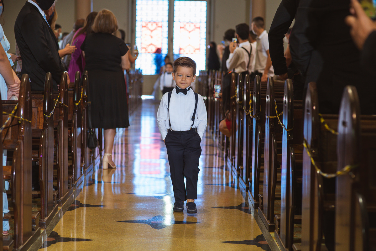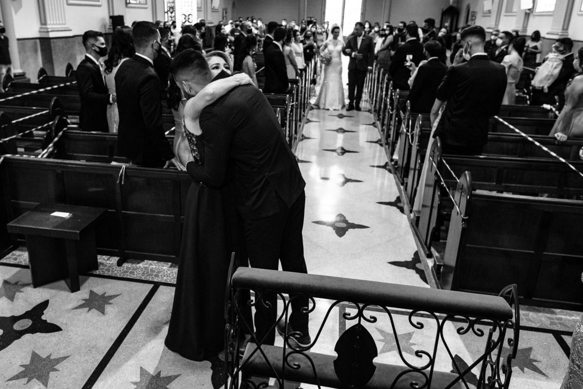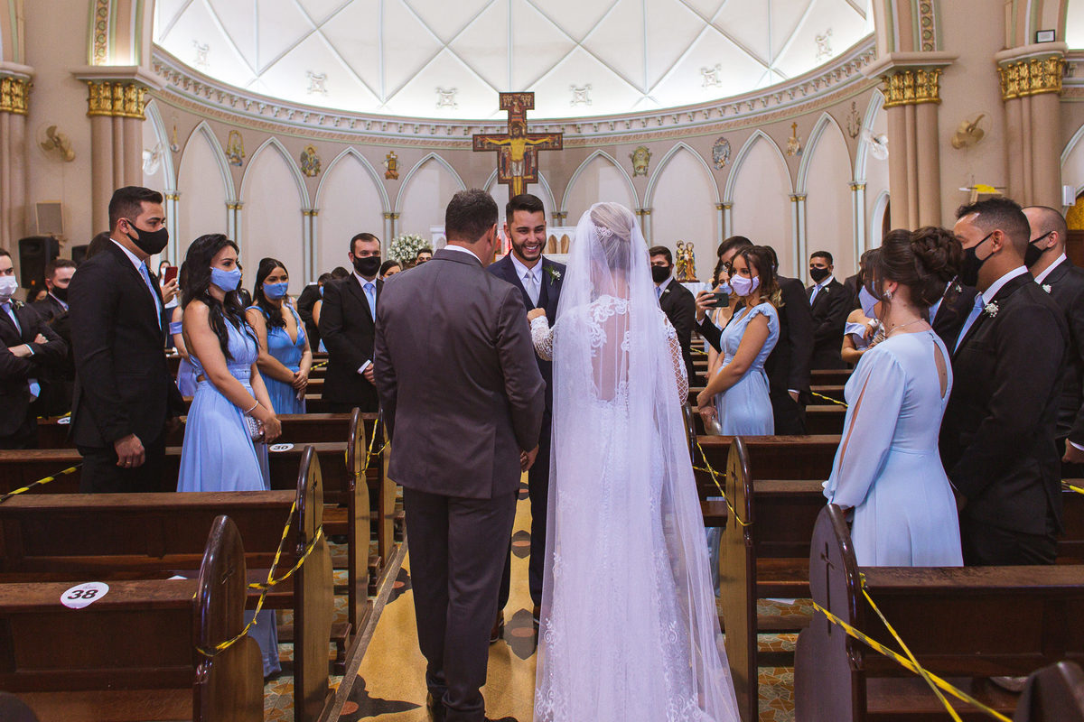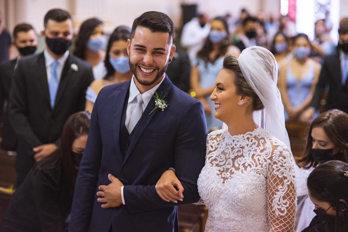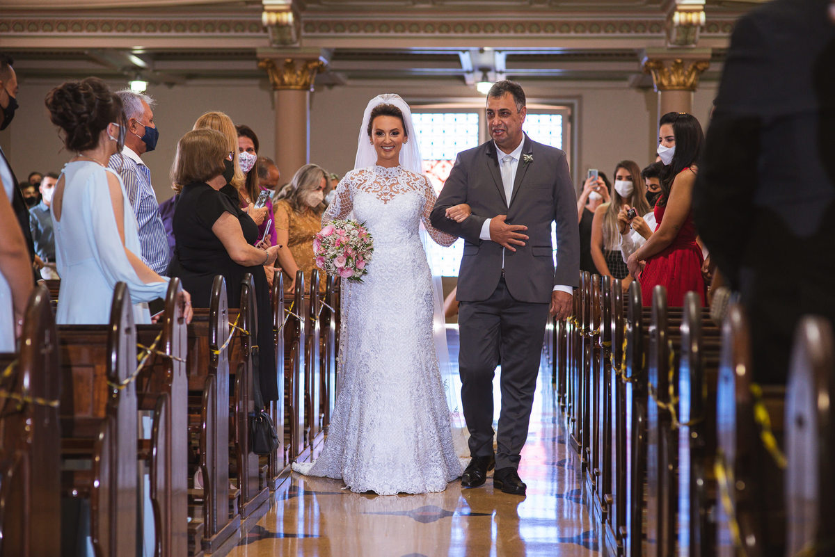 Enquanto os padrinhos adentravam, os pajens também faziam seu papel. Um deles disparou na frente e quando chegou no final, resolveu voltar. Coisa de criança né! É bom demais a alegria que elas trazem pro casamento. Finalmente, o noivo e sua mãe entraram caminhando rumo ao altar. Erivelto distribuiu sorrisos para todos os lados e todos os padrinhos. Agora, era a vez da noiva fazer sua entrada triunfal. Ao som do violino e com as portas da igreja fechadas, iniciava ali a sua entrada. Assim que as portas se abriram, a luz adentrou ao templo e criou uma cena de encher os olhos. O noivo abriu um mega sorriso ao ver sua noiva caminhar rumo ao altar.