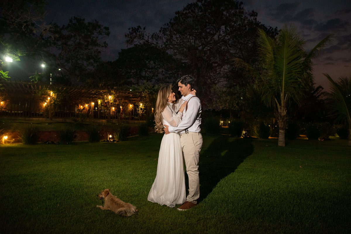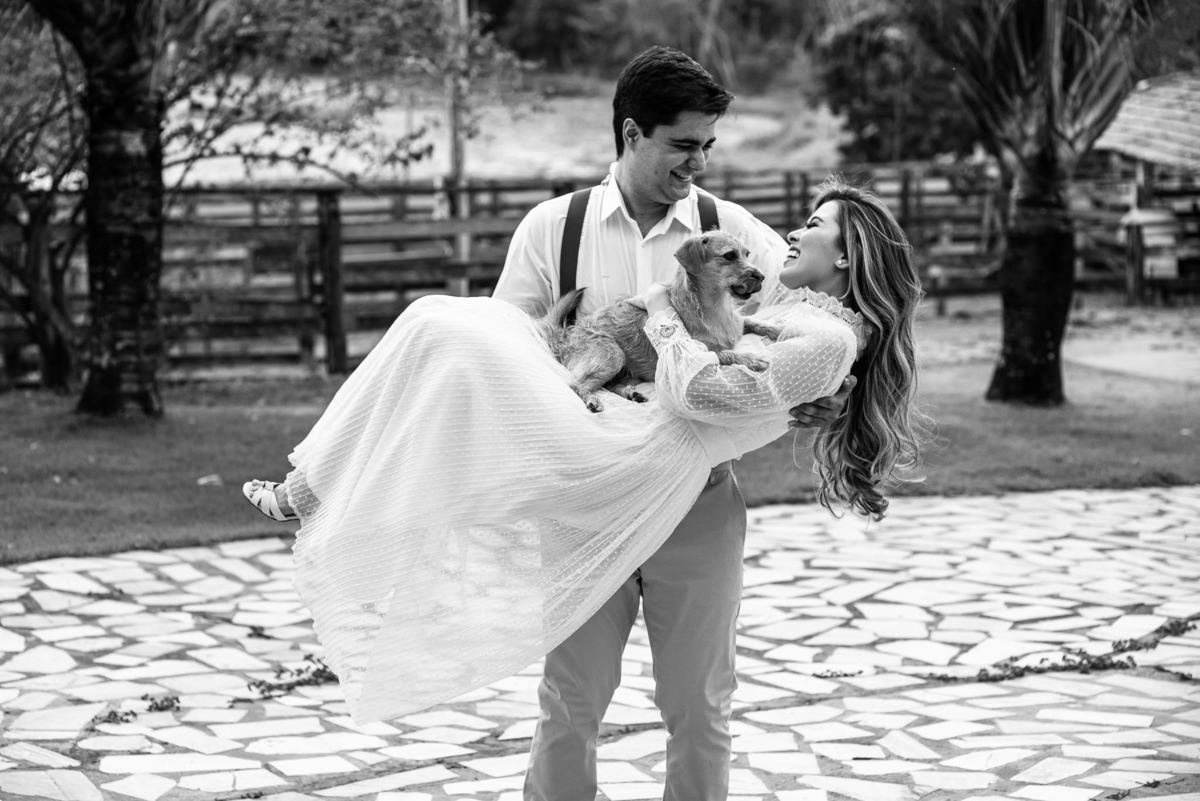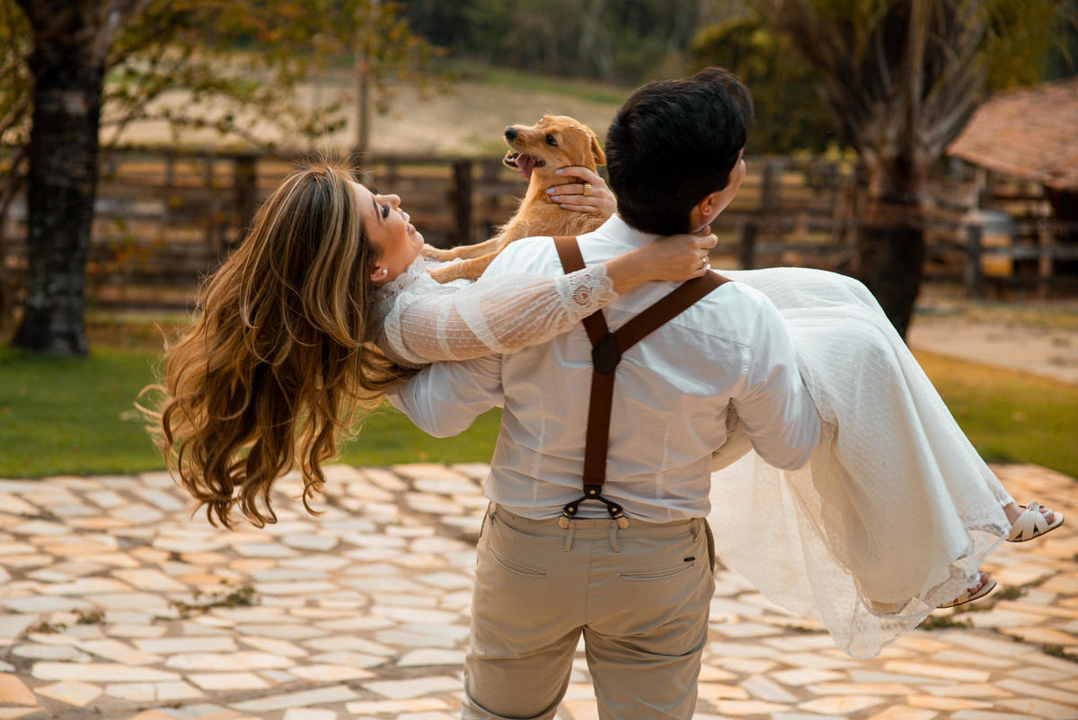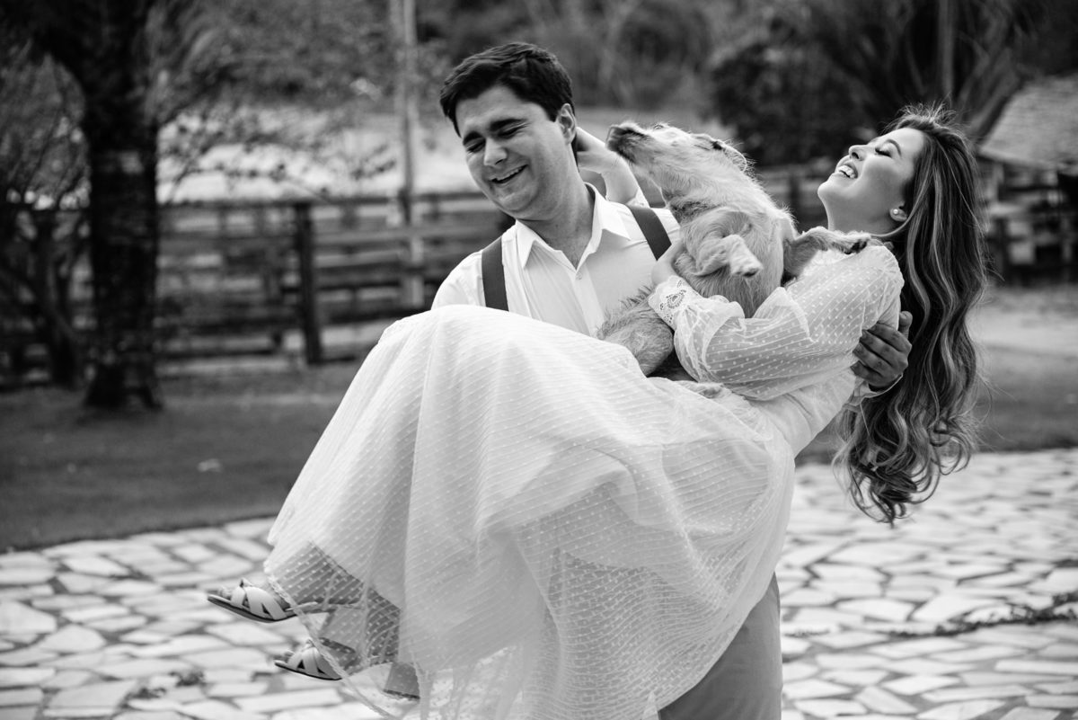 Depois de fecharmos, a data ainda estava longe. Aos poucos, os dias iam passando e quando estava mais próximo do casamento, tivemos que infelizmente alterar o local da cerimônia por causa das instabilidades de disponibilidade e quantidade de convidados. Apesar dessas intempéries, tudo corria muito bem. Chegado o dia do ensaio, o dia estava radiante. Isabela estava maravilhosa e Wilton super animado com o ensaio. Quem também fez questão de participar e abrir o ensaio foi a cachorrinha Mel, que faz parte da família há um bom tempo.