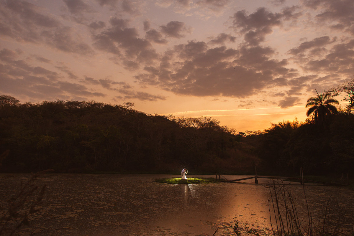 Fizemos as fotos tradicionais, as que a noiva queria e que o noivo também havia pensado. Logo após, pedi encarecidamente ao casal que se posicionasse depois da ponte, no meio do lago. Posicionei o casal no local que eu queria, preparei a iluminação e cliquei. O pôr-do-sol, o casal, a luz... tudo encaixava perfeitamente na foto que eu queria fazer. Eu nunca havia visto uma foto assim feita ali naquele local, e fiquei muito feliz em ter conseguido criar aquela imagem na mente e transmiti-la através da câmera. E agora, depois de todo esse imenso texto, você que chegou até aqui terá o privilégio de ver todo o resultado desse ensaio lindo.