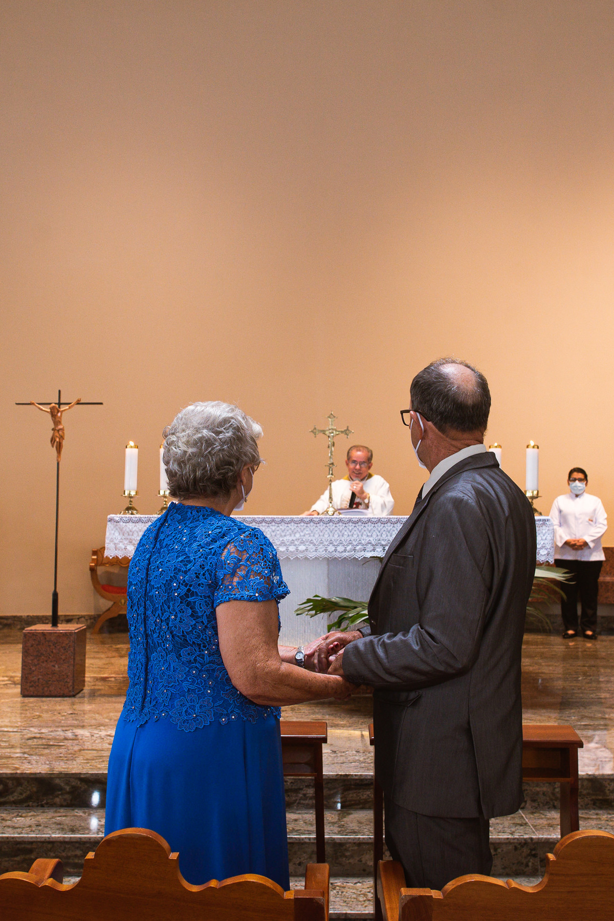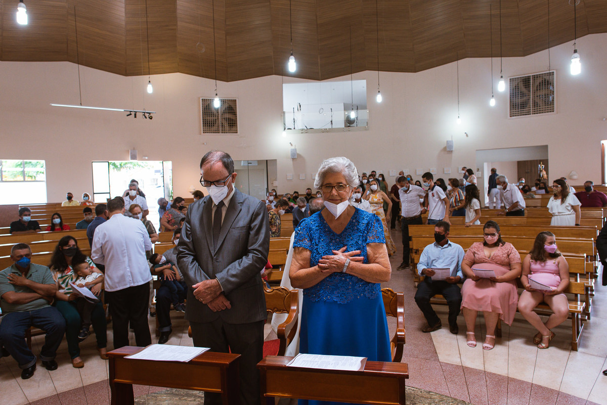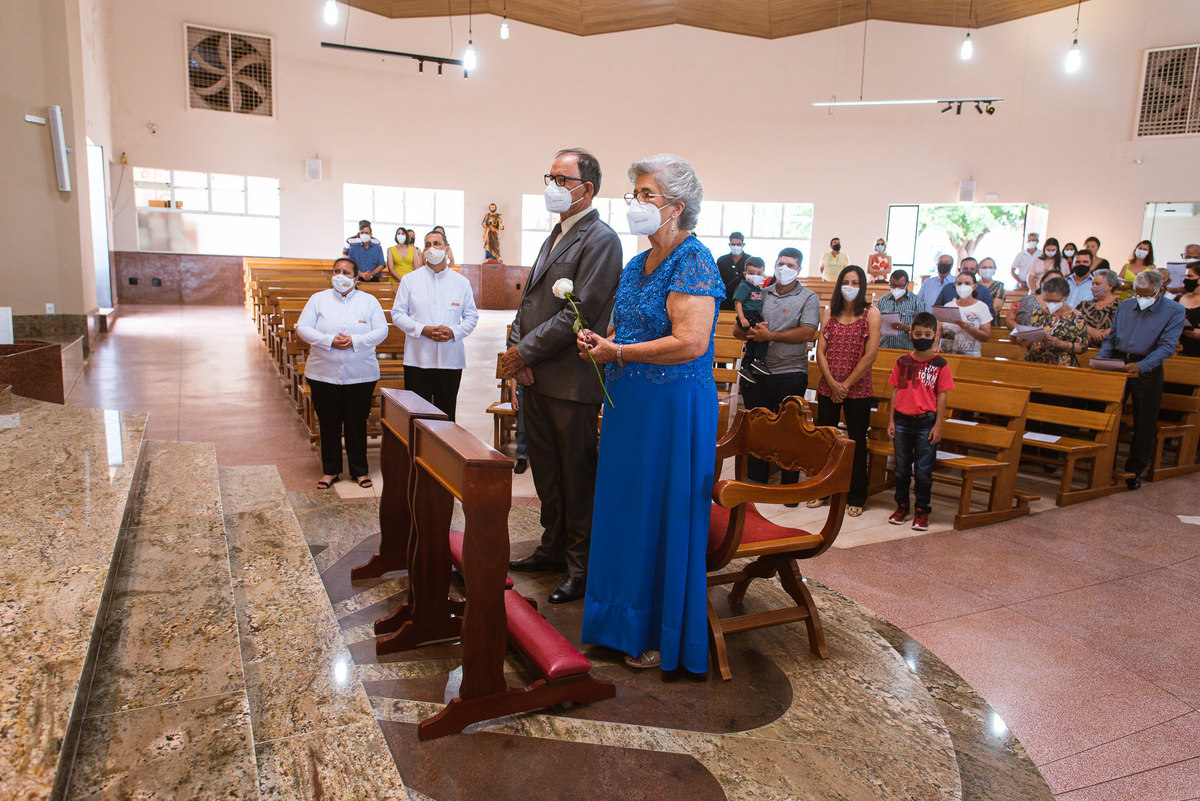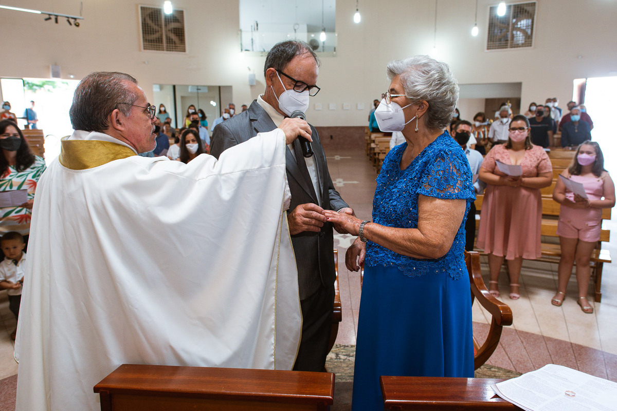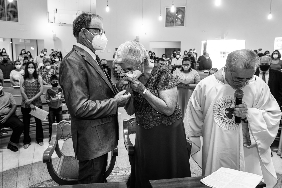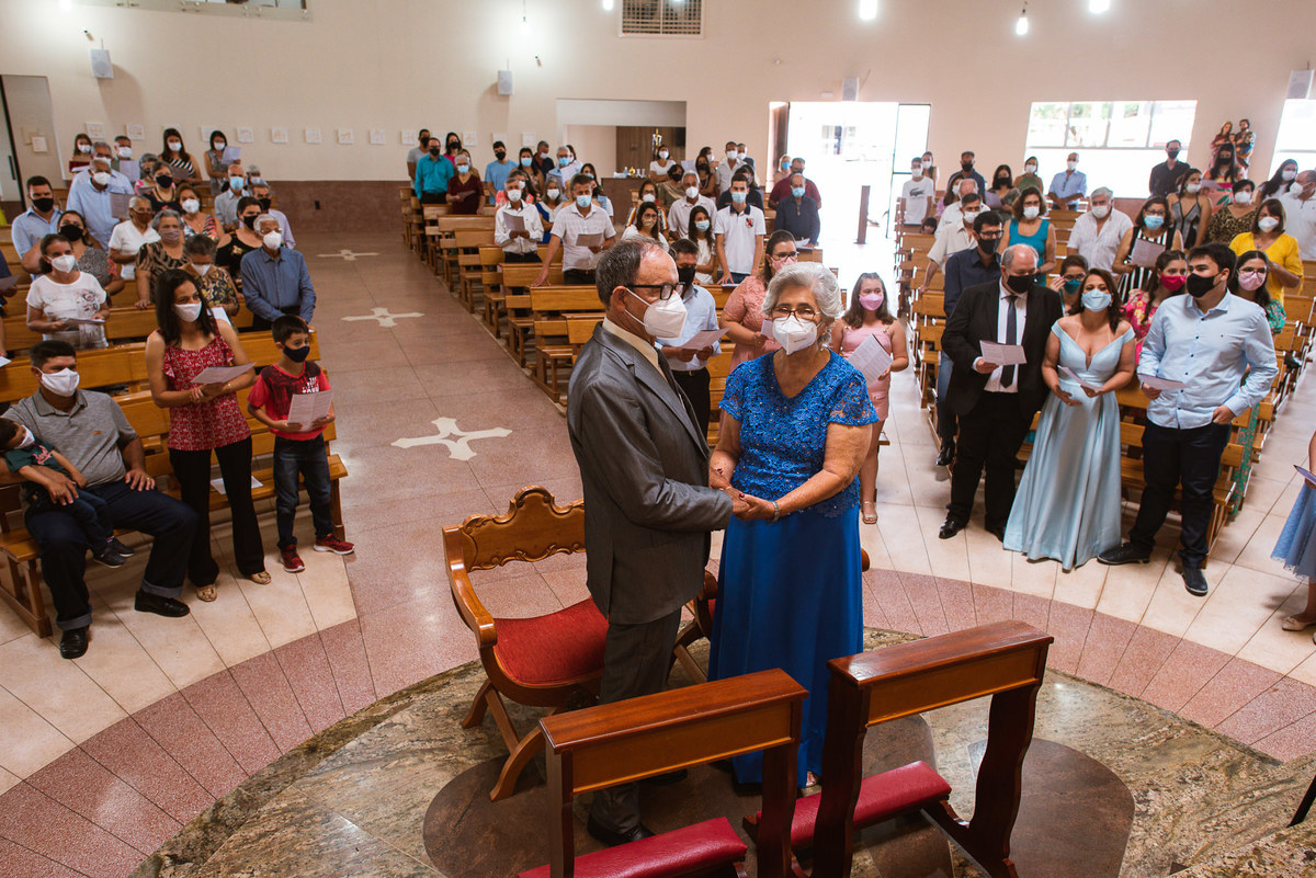 Para iniciar o dia da celebração, eles fizeram questão de celebrar uma missa em ação de graças por este dia tão importante. E pense numa missa linda! Emoção do início ao fim. Todos estavam muito felizes com esta comemoração. O padre recebeu os itens que fariam parte da solenidade e fez questão de erguer a foto do casamento oficial. Todos aplaudiram! Eles participaram da renovação dos votos nupciais e receberam a comunhão. Na saída, ainda deram um beijinho pra foto e foram recebidos aos aplausos pelos convidados.