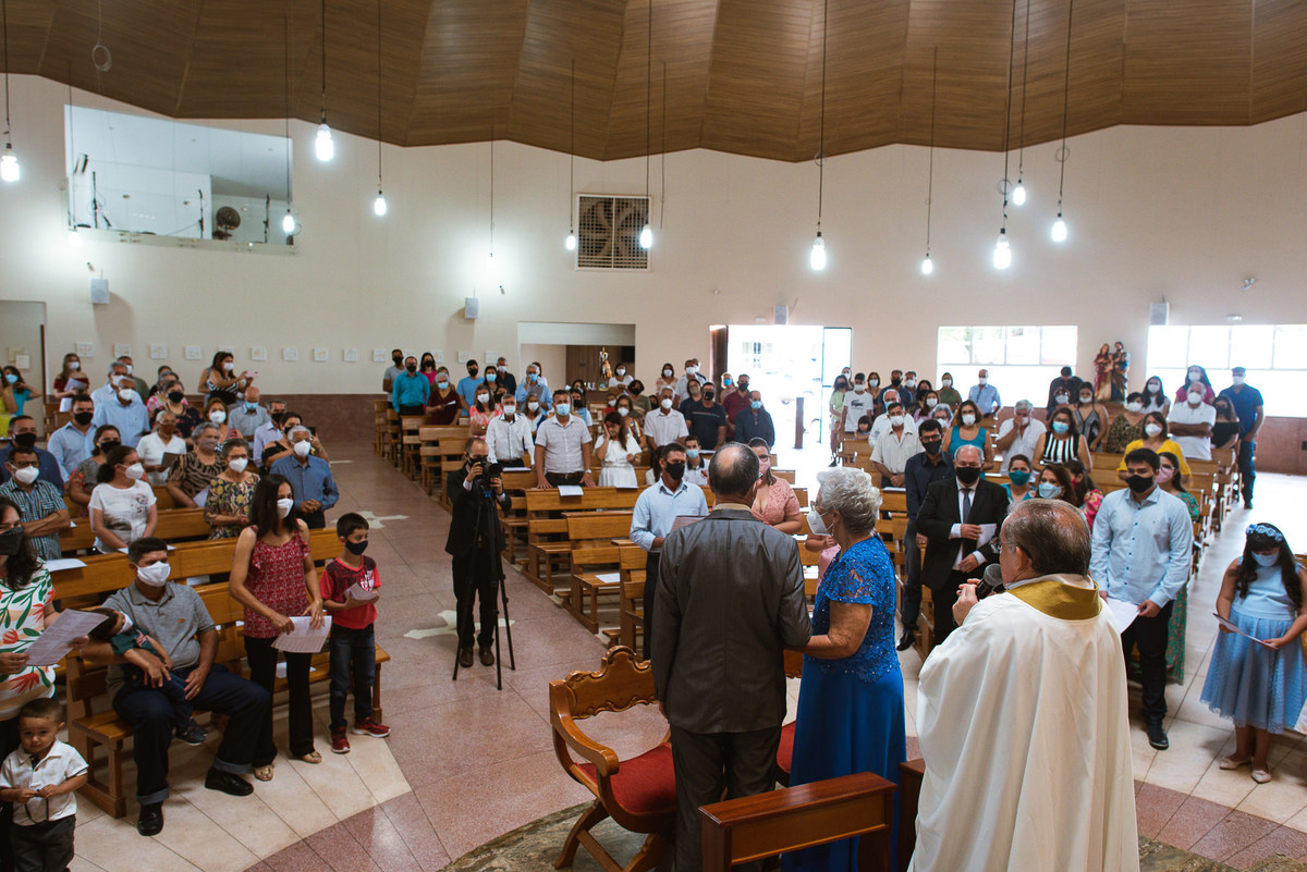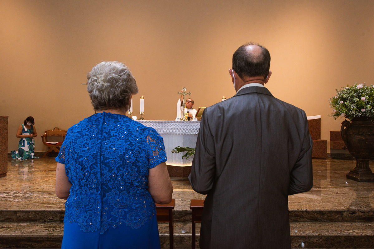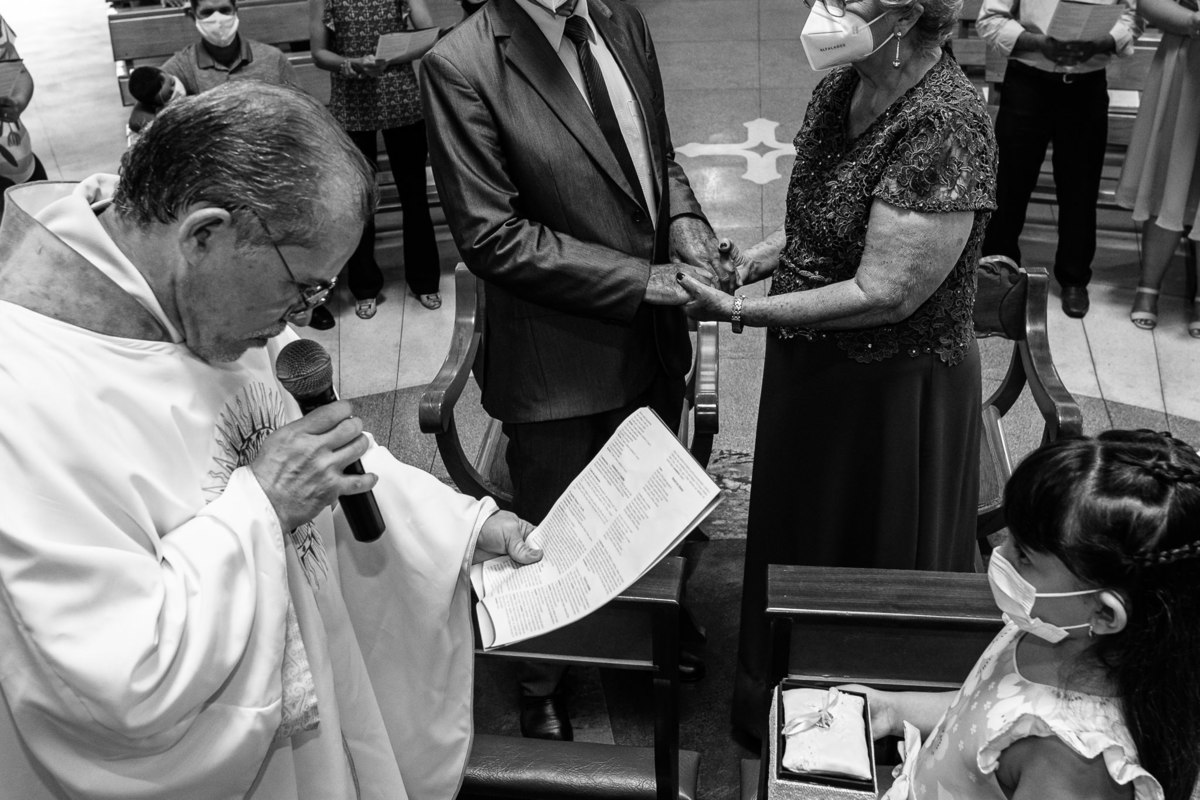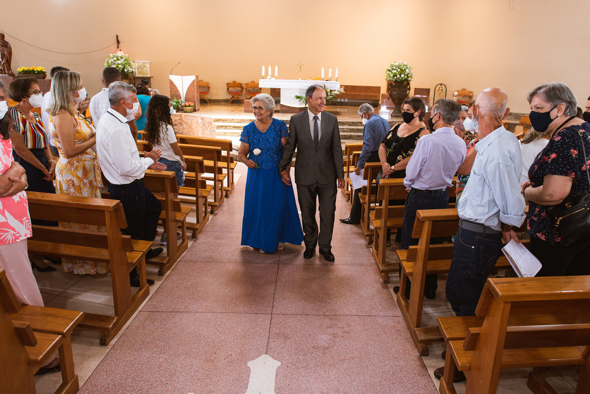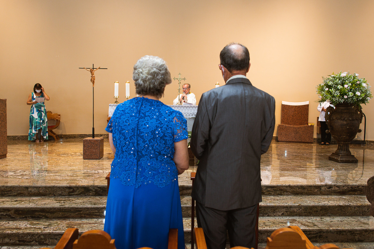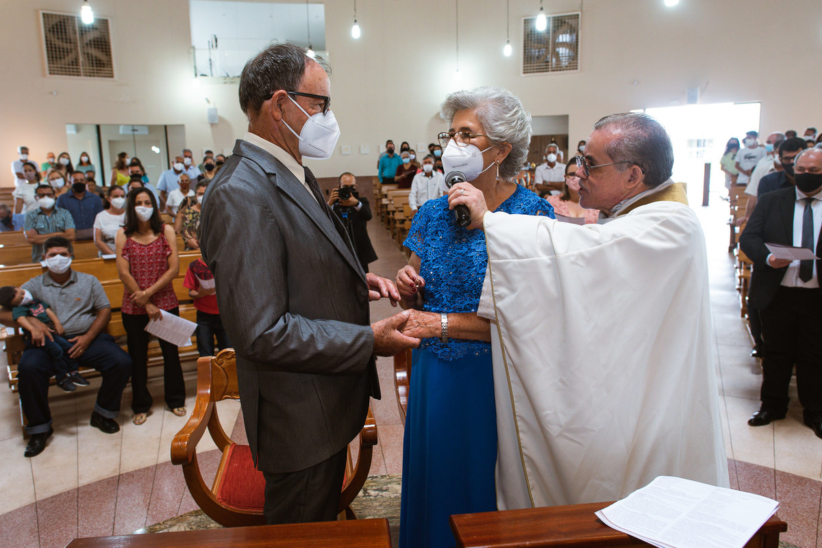 Para iniciar o dia da celebração, eles fizeram questão de celebrar uma missa em ação de graças por este dia tão importante. E pense numa missa linda! Emoção do início ao fim. Todos estavam muito felizes com esta comemoração. O padre recebeu os itens que fariam parte da solenidade e fez questão de erguer a foto do casamento oficial. Todos aplaudiram! Eles participaram da renovação dos votos nupciais e receberam a comunhão. Na saída, ainda deram um beijinho pra foto e foram recebidos aos aplausos pelos convidados.