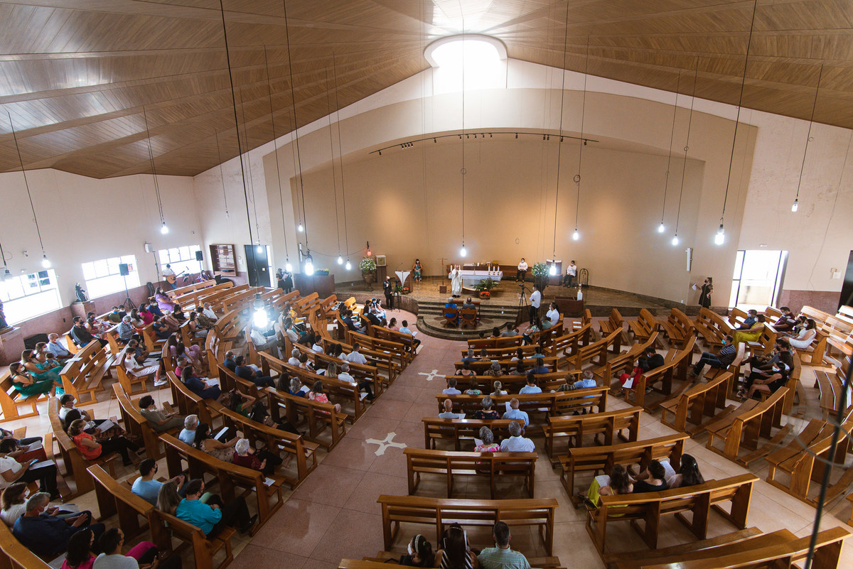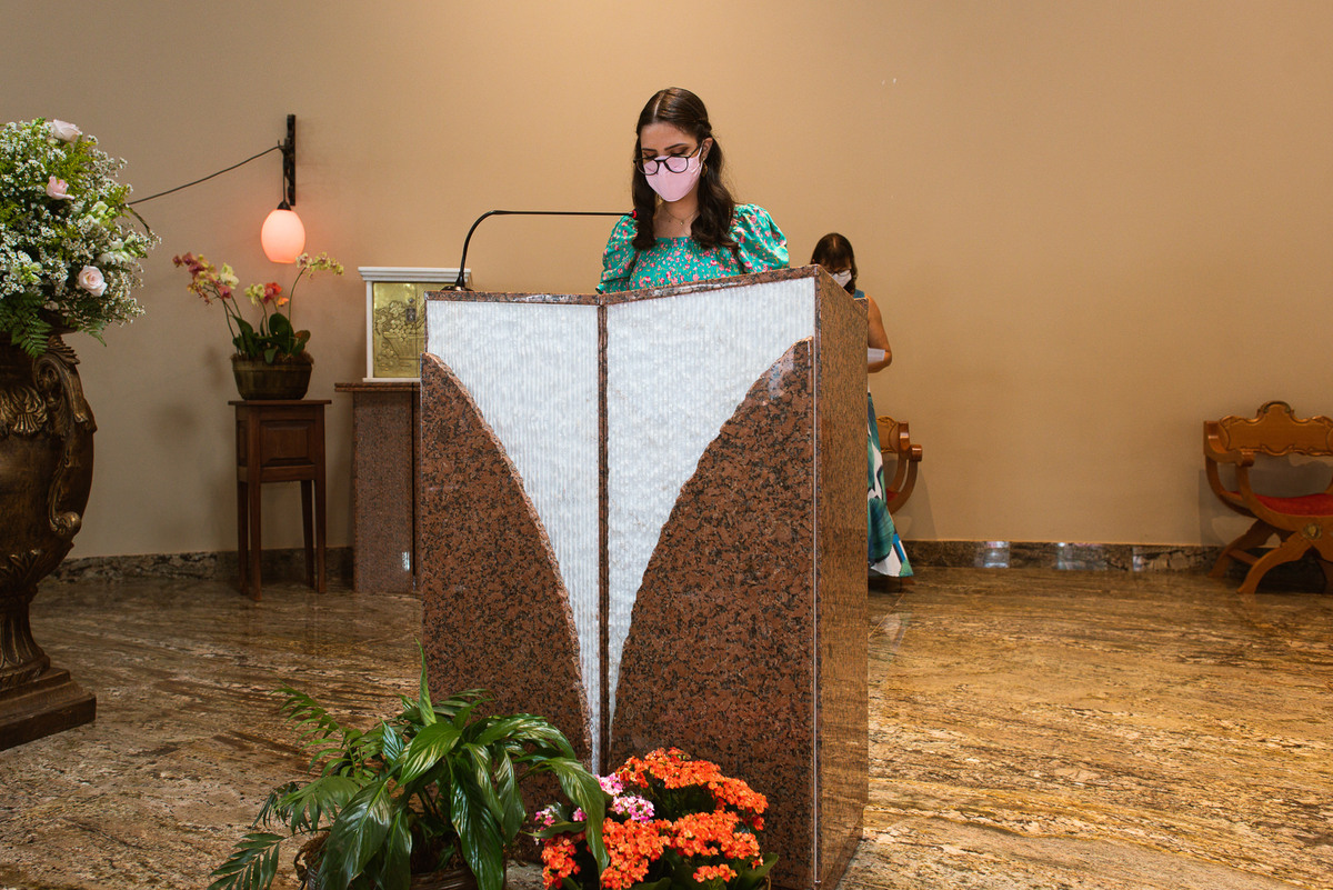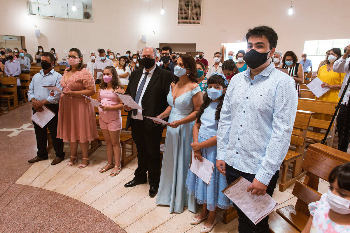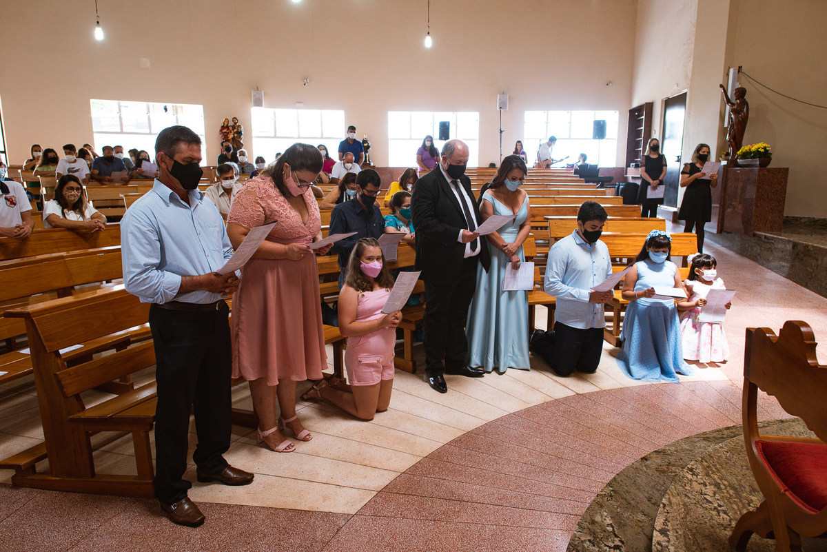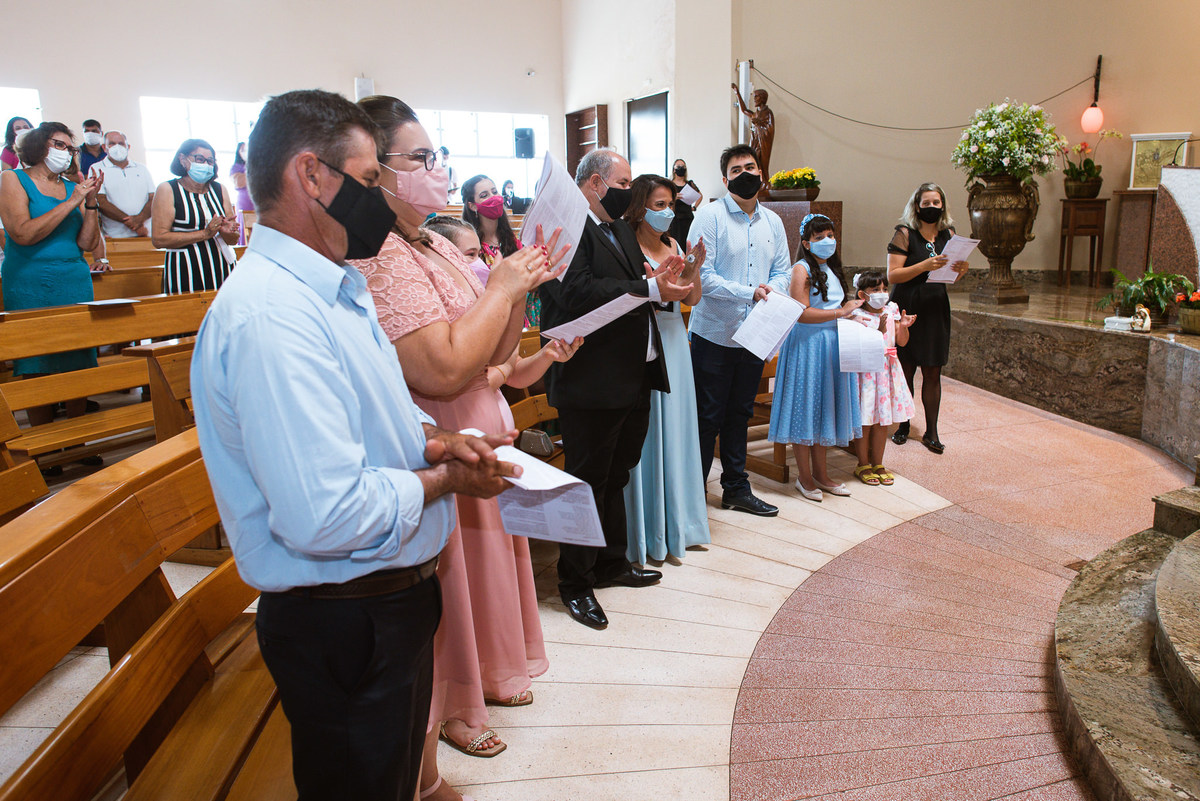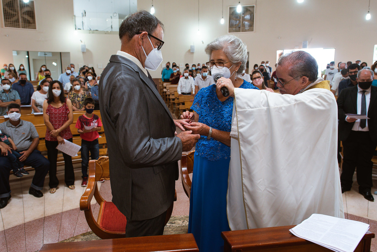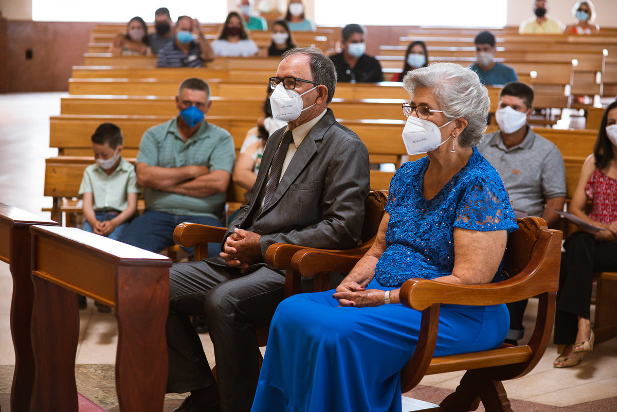 Para iniciar o dia da celebração, eles fizeram questão de celebrar uma missa em ação de graças por este dia tão importante. E pense numa missa linda! Emoção do início ao fim. Todos estavam muito felizes com esta comemoração. O padre recebeu os itens que fariam parte da solenidade e fez questão de erguer a foto do casamento oficial. Todos aplaudiram! Eles participaram da renovação dos votos nupciais e receberam a comunhão. Na saída, ainda deram um beijinho pra foto e foram recebidos aos aplausos pelos convidados.