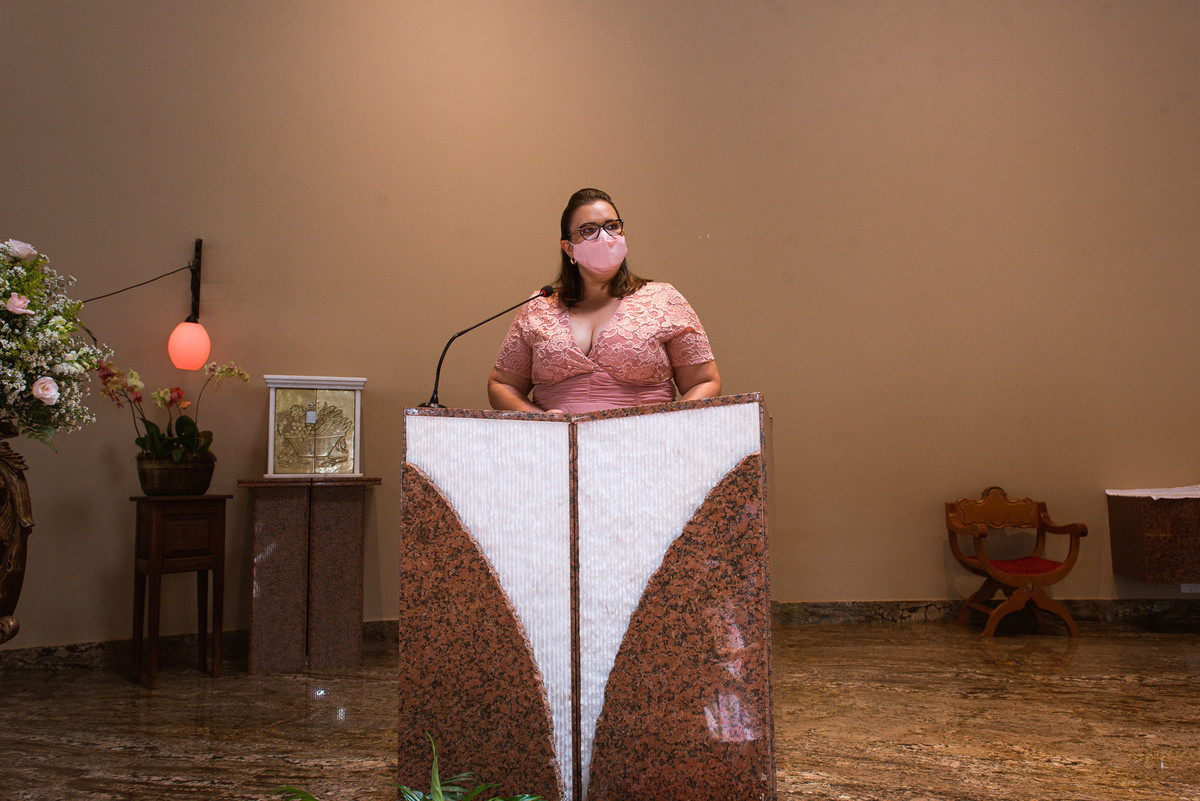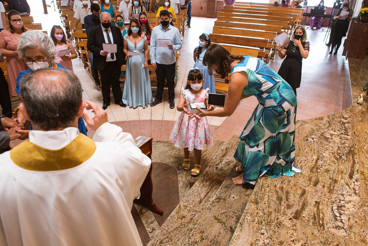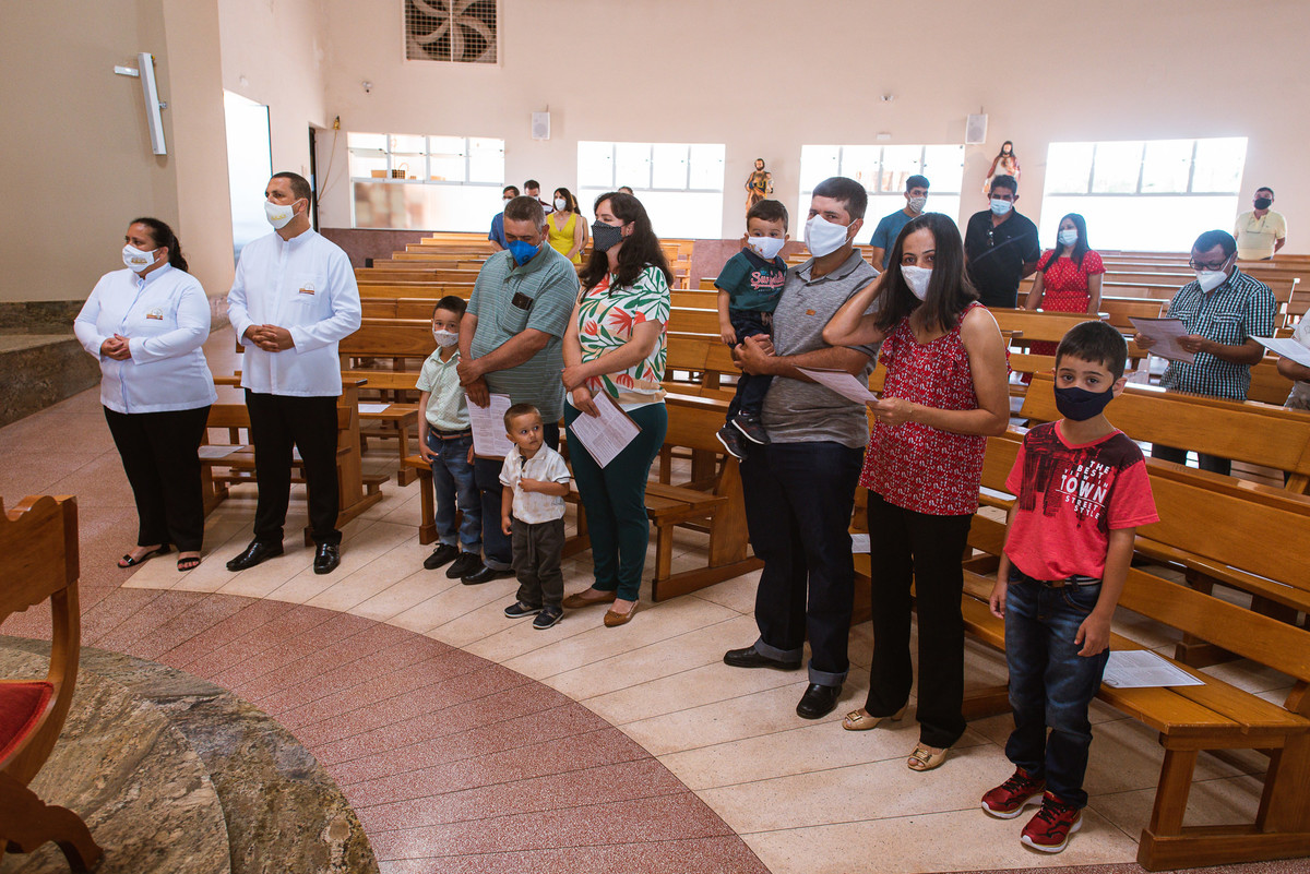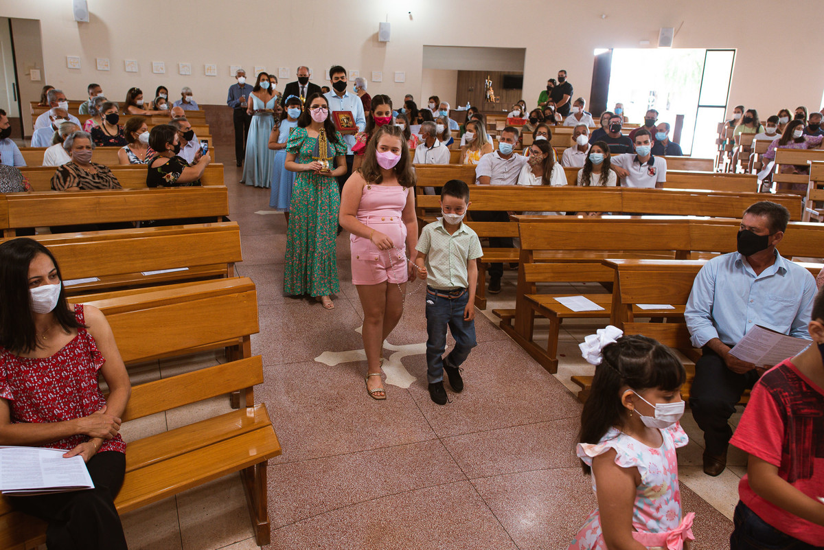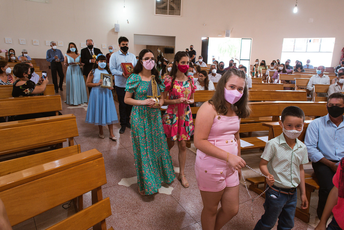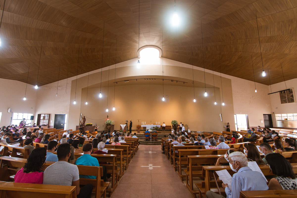 Para iniciar o dia da celebração, eles fizeram questão de celebrar uma missa em ação de graças por este dia tão importante. E pense numa missa linda! Emoção do início ao fim. Todos estavam muito felizes com esta comemoração. O padre recebeu os itens que fariam parte da solenidade e fez questão de erguer a foto do casamento oficial. Todos aplaudiram! Eles participaram da renovação dos votos nupciais e receberam a comunhão. Na saída, ainda deram um beijinho pra foto e foram recebidos aos aplausos pelos convidados.