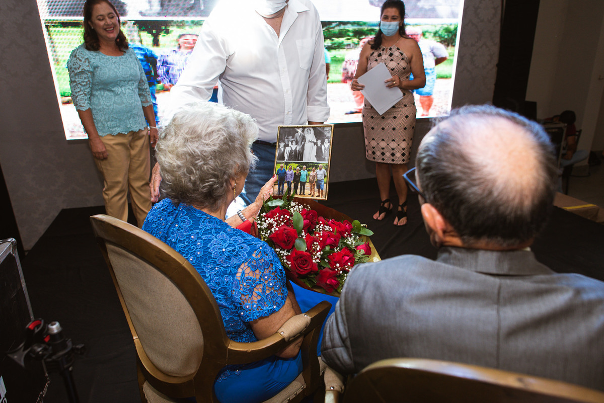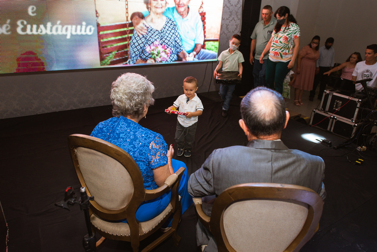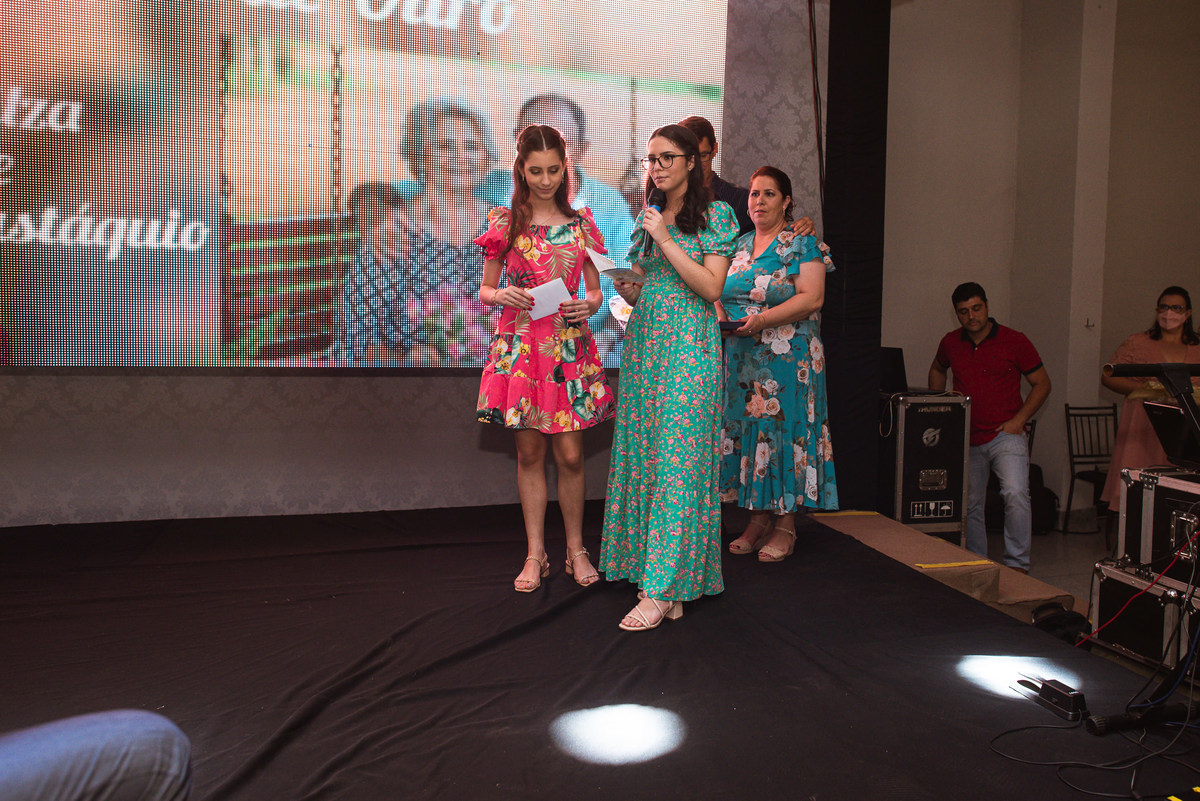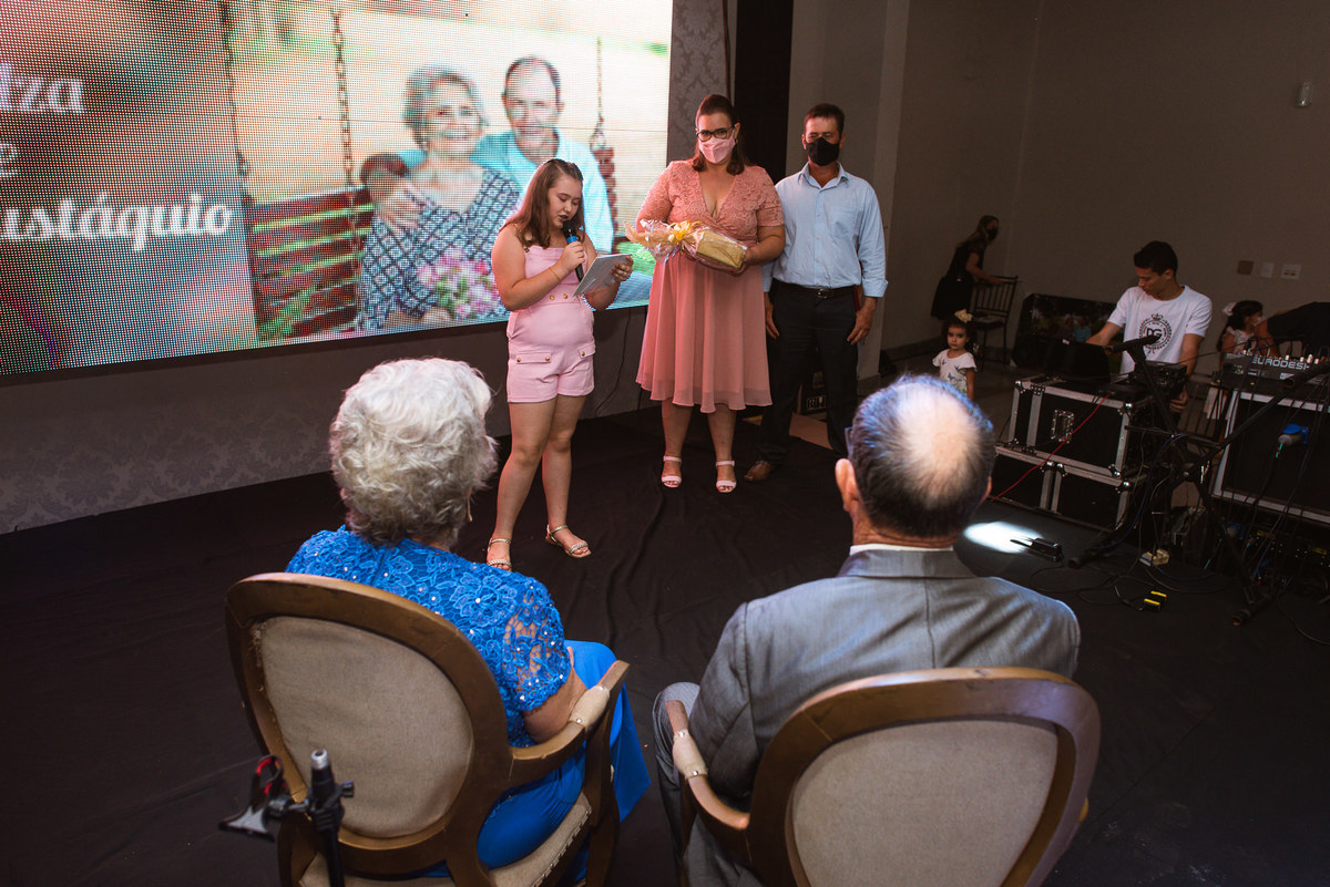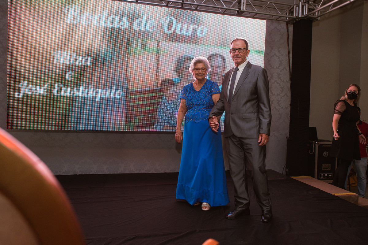 Em seguida, partimos para a recepção. O House Fest foi o local escolhido para festejarmos as bodas de José e Nilza. Chegando lá, o local já estava todo preparado e decorado para receber os convidados. A mesa do bolo toda florida e muito bem decorada com o número 50 bem em cima do bolo. Iniciada a cerimônia na recepção, os nubentes foram recebidos aos aplausos dos convidados. Eles foram convidados a subir ao palco para receber as devidas homenagens. Tivemos os netinhos declamando seus votos de felicidade aos avós, os filhos com suas mensagens também fizeram questão de homenagear os pais. Tivemos até um pôster lindo feito do ensaio que eles fotografaram antes do evento. Foi uma surpresa muito bacana. Mas nada, absolutamente nada se compara ao que vivenciamos pouco depois.