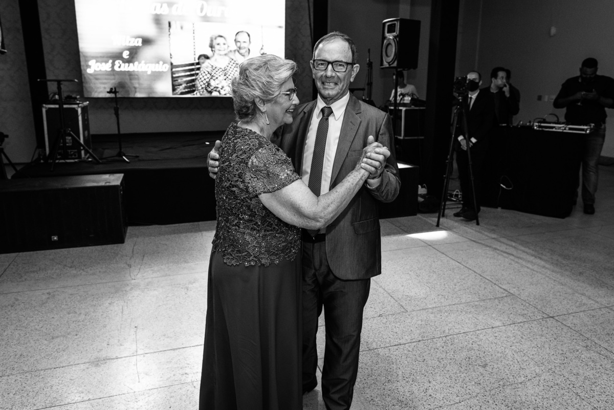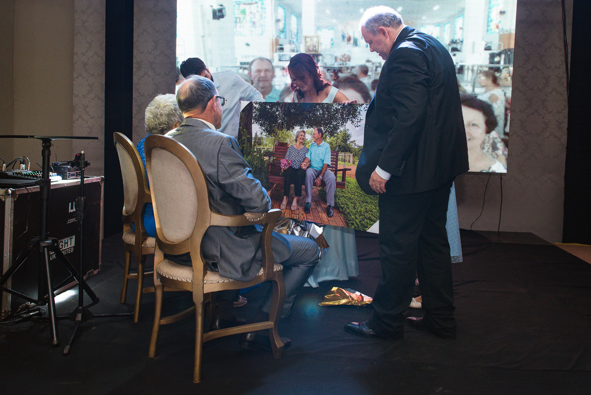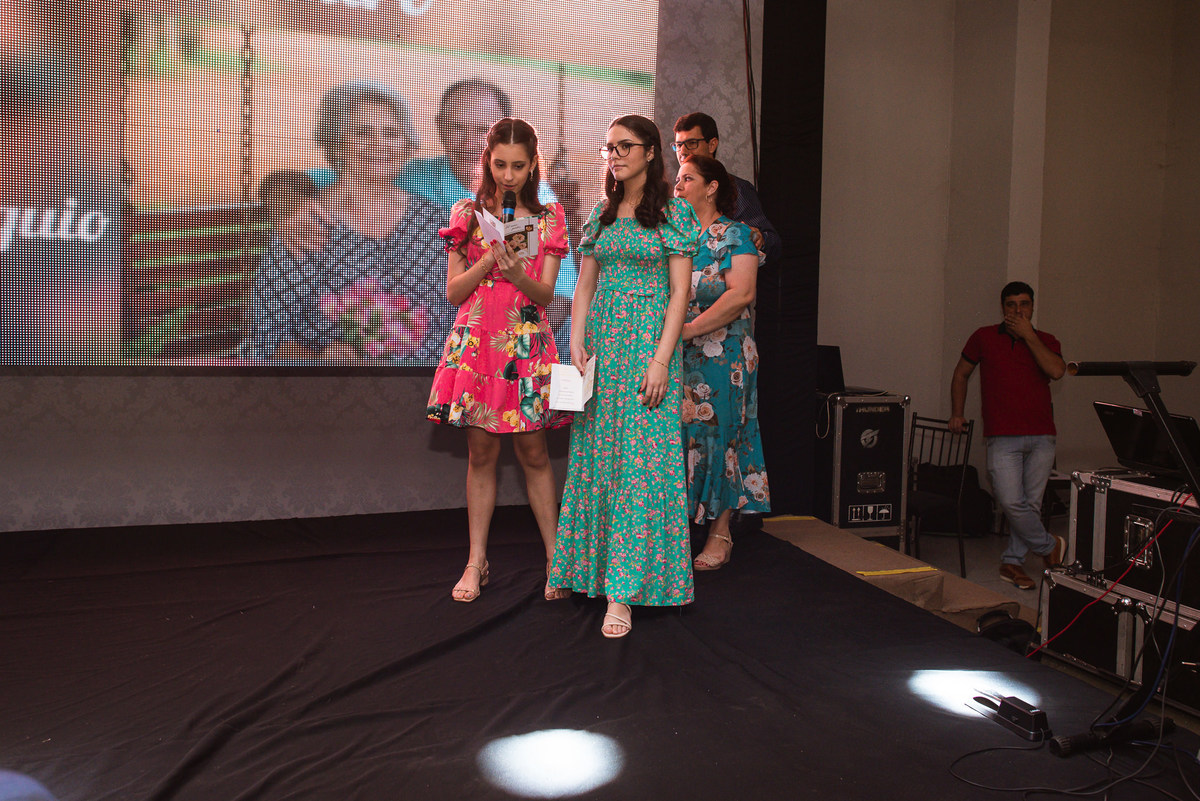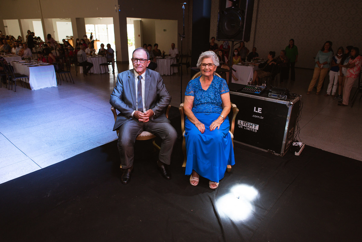 Em seguida, partimos para a recepção. O House Fest foi o local escolhido para festejarmos as bodas de José e Nilza. Chegando lá, o local já estava todo preparado e decorado para receber os convidados. A mesa do bolo toda florida e muito bem decorada com o número 50 bem em cima do bolo. Iniciada a cerimônia na recepção, os nubentes foram recebidos aos aplausos dos convidados. Eles foram convidados a subir ao palco para receber as devidas homenagens. Tivemos os netinhos declamando seus votos de felicidade aos avós, os filhos com suas mensagens também fizeram questão de homenagear os pais. Tivemos até um pôster lindo feito do ensaio que eles fotografaram antes do evento. Foi uma surpresa muito bacana. Mas nada, absolutamente nada se compara ao que vivenciamos pouco depois.