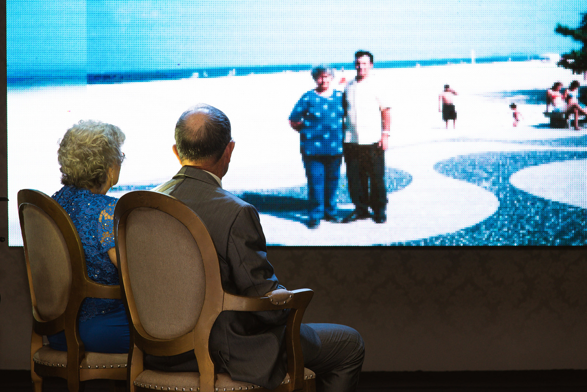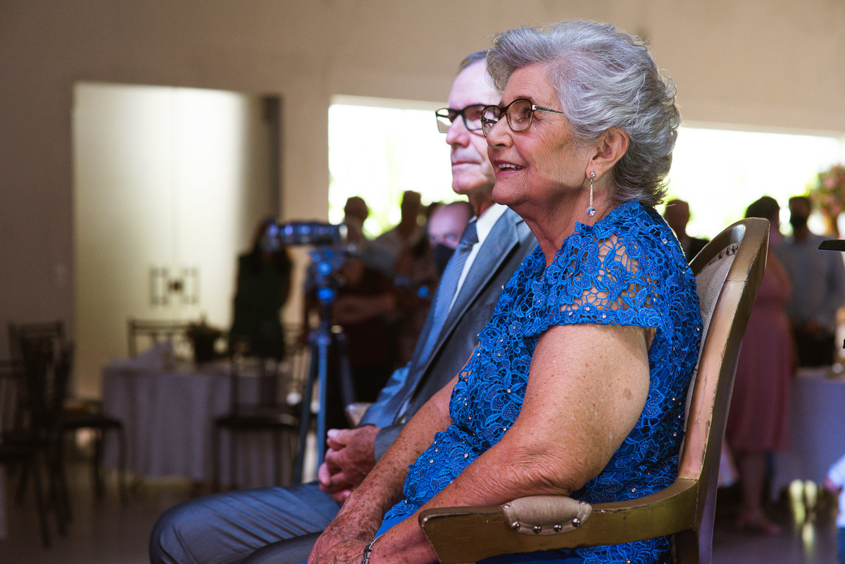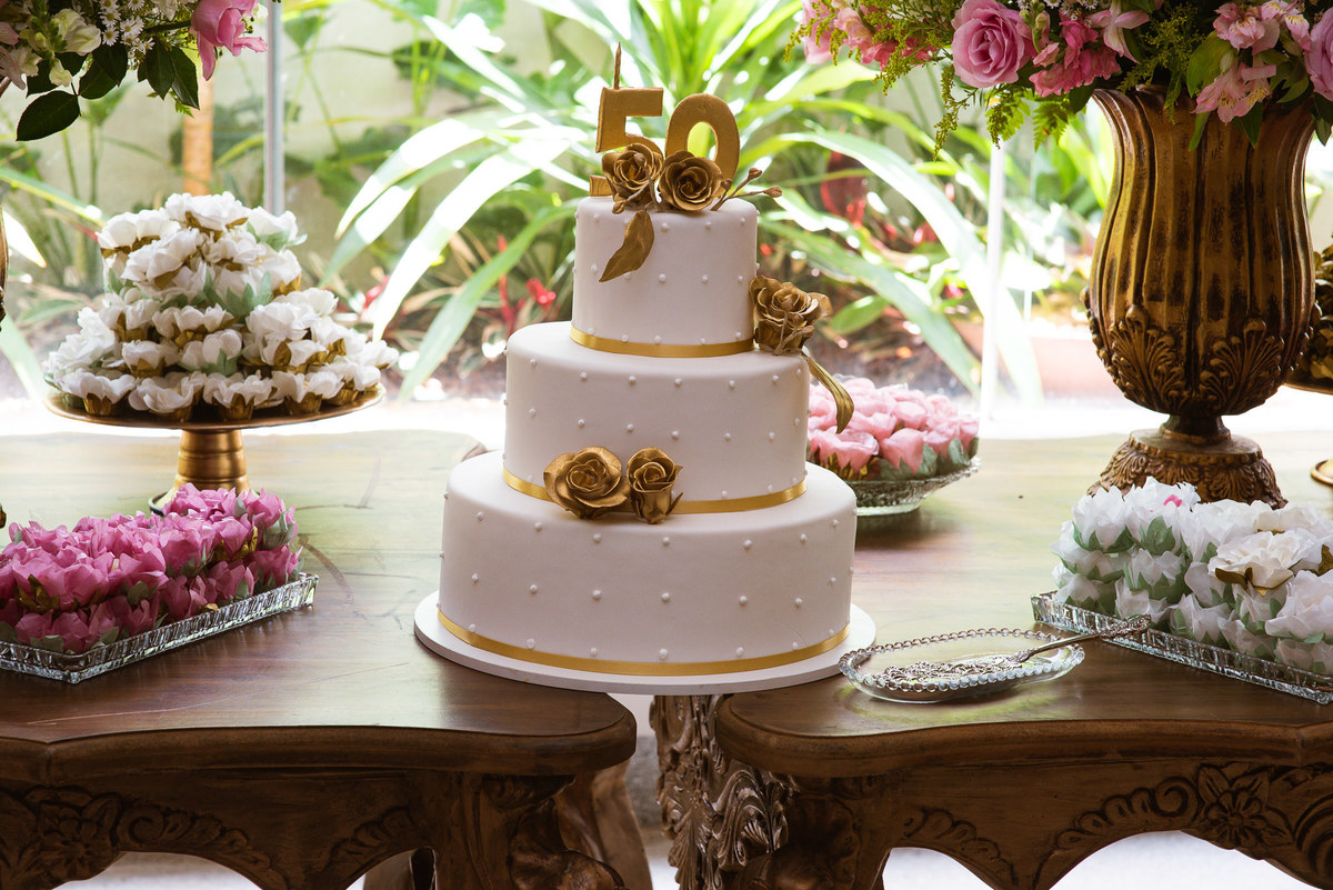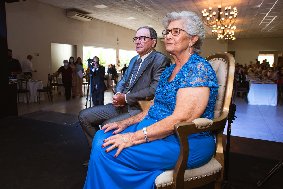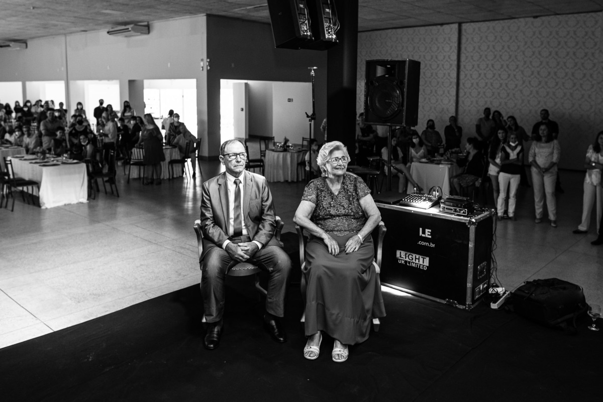 Em seguida, partimos para a recepção. O House Fest foi o local escolhido para festejarmos as bodas de José e Nilza. Chegando lá, o local já estava todo preparado e decorado para receber os convidados. A mesa do bolo toda florida e muito bem decorada com o número 50 bem em cima do bolo. Iniciada a cerimônia na recepção, os nubentes foram recebidos aos aplausos dos convidados. Eles foram convidados a subir ao palco para receber as devidas homenagens. Tivemos os netinhos declamando seus votos de felicidade aos avós, os filhos com suas mensagens também fizeram questão de homenagear os pais. Tivemos até um pôster lindo feito do ensaio que eles fotografaram antes do evento. Foi uma surpresa muito bacana. Mas nada, absolutamente nada se compara ao que vivenciamos pouco depois.
