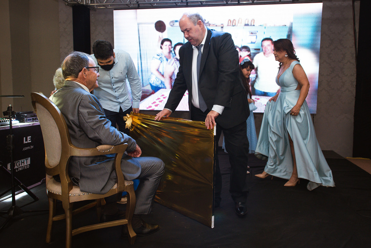 Subiram três pessoas muito queridas por José e Nilza. Quem são? Os pajens. Meu Deus do céu, eles reuniram os pajens do casamento original deles! Gente, vocês tem noção disso? As crianças que estavam no casamento oficial subiram ao palco para homenagear os padrinhos. E não parou por ai. Além das palavras de gratidão, eles imprimiram uma foto que juntou a foto oficial do casamento onde estavam os noivos e os pajens e uma foto deles juntos por agora, adultos. E entregaram para José e Nilza. neste momento, até o Sr. José que é mais sério, teve que enxugar as lágrimas. Depois desse momento super emocionante, era hora da valsa do casal.