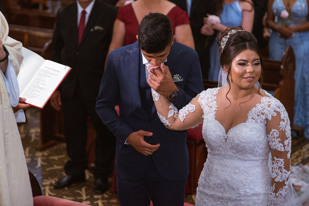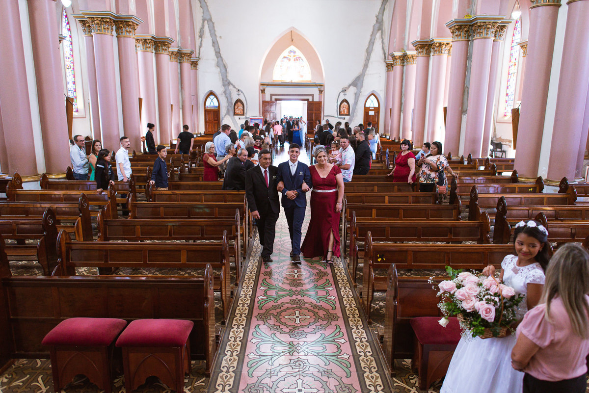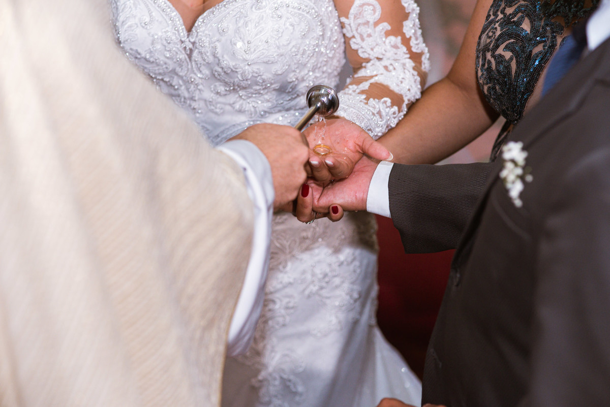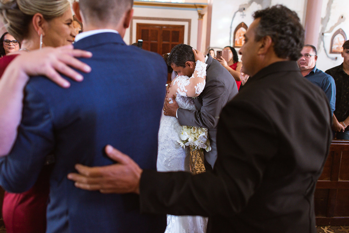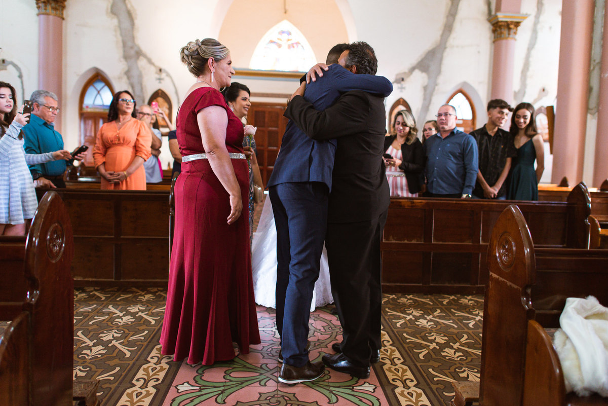 Depois desse momento, Vítor caminhou junto com seus pais até o centro do corredor e recebeu os cumprimentos da família da noiva. Depois de longos abraços regados à lagrimas de todos que se cumprimentavam, finalmente o encontro final aconteceu. Com um beijo respeitoso na testa da noiva, ele recebeu sua mão e agora juntinhos caminharam rumo à bênção Divina. Os dois foram recebidos pelo padre Cléber que os cumprimentou carinhosamente. Eles, que são da mesma paróquia que o padre Cléber toma conta, ficaram felizes demais por ele aceitar fazer a celebração do casamento.