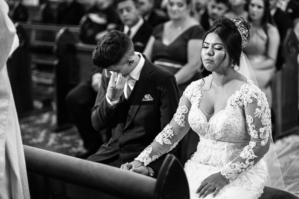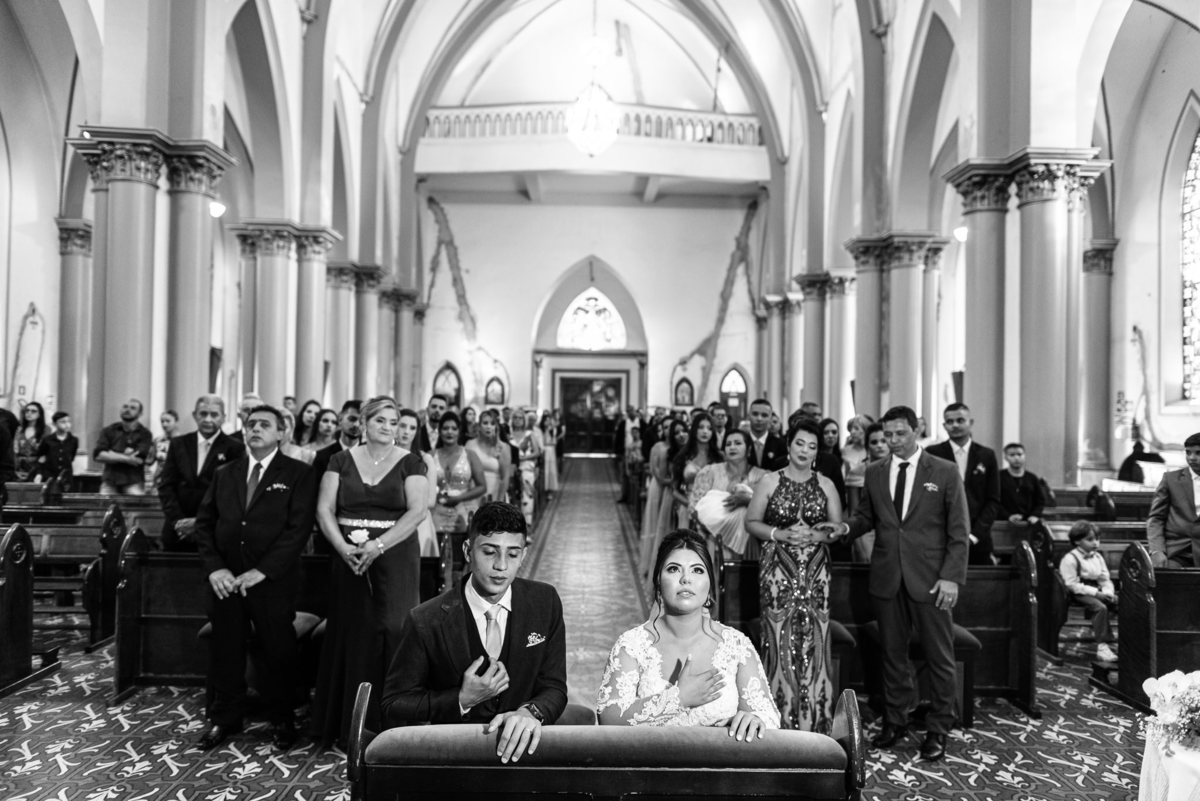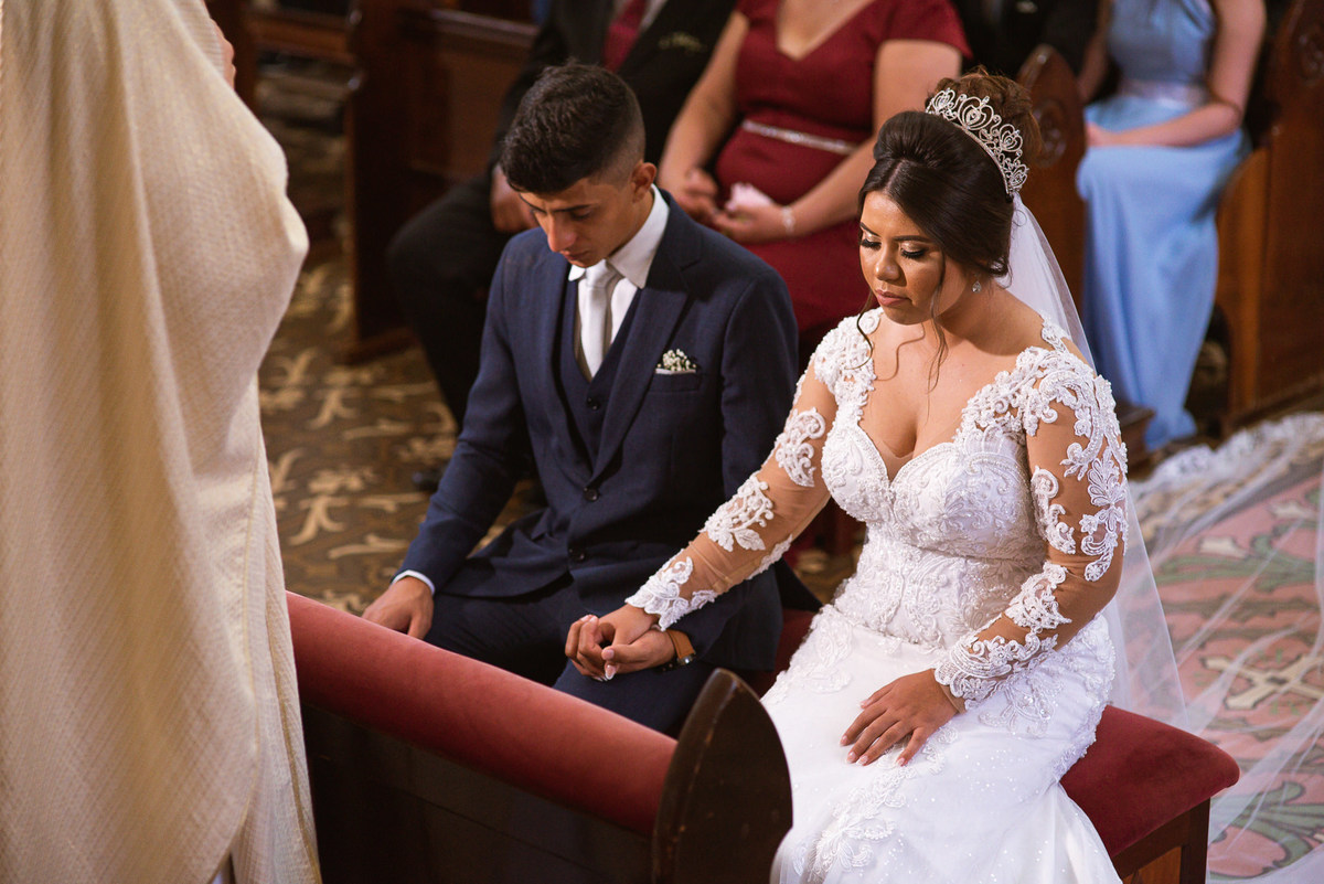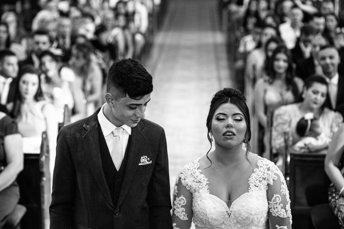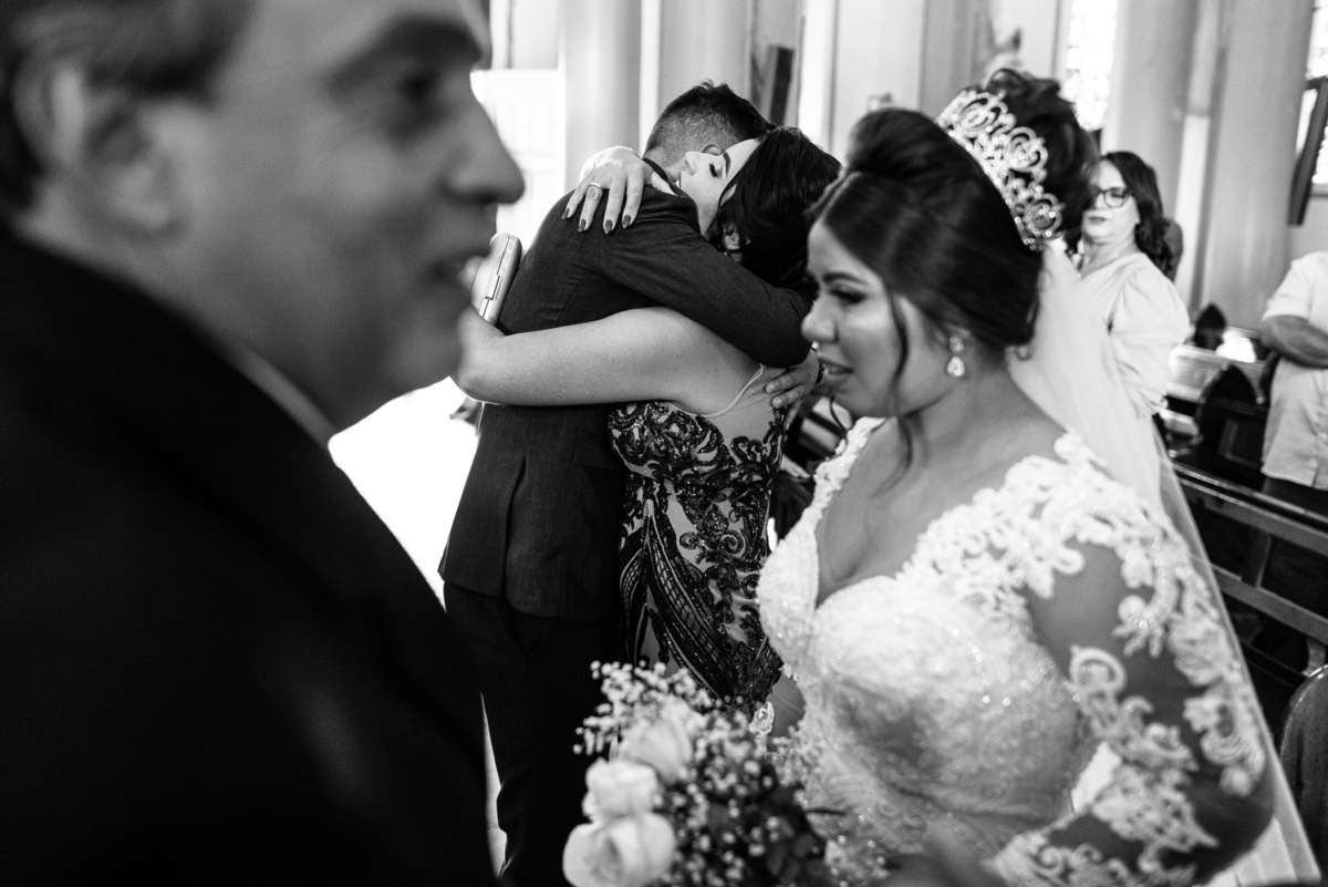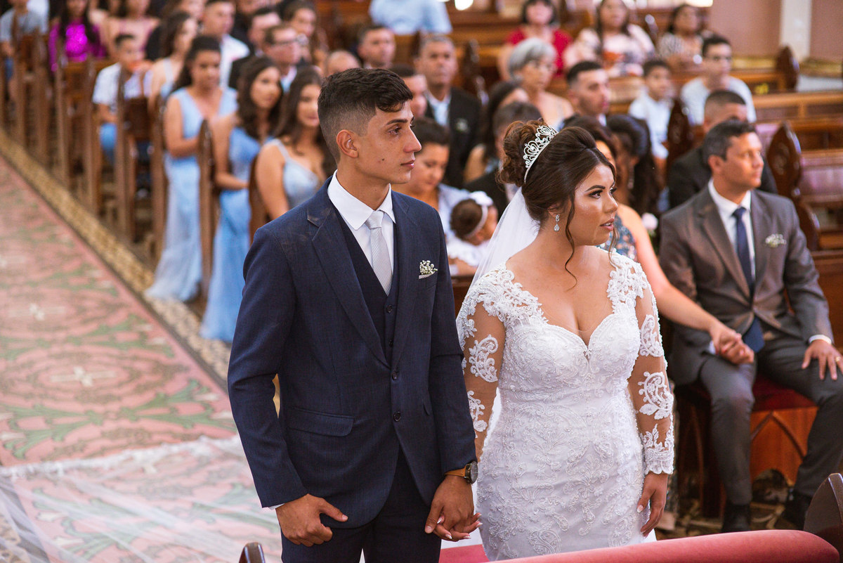 Depois desse momento, Vítor caminhou junto com seus pais até o centro do corredor e recebeu os cumprimentos da família da noiva. Depois de longos abraços regados à lagrimas de todos que se cumprimentavam, finalmente o encontro final aconteceu. Com um beijo respeitoso na testa da noiva, ele recebeu sua mão e agora juntinhos caminharam rumo à bênção Divina. Os dois foram recebidos pelo padre Cléber que os cumprimentou carinhosamente. Eles, que são da mesma paróquia que o padre Cléber toma conta, ficaram felizes demais por ele aceitar fazer a celebração do casamento.
