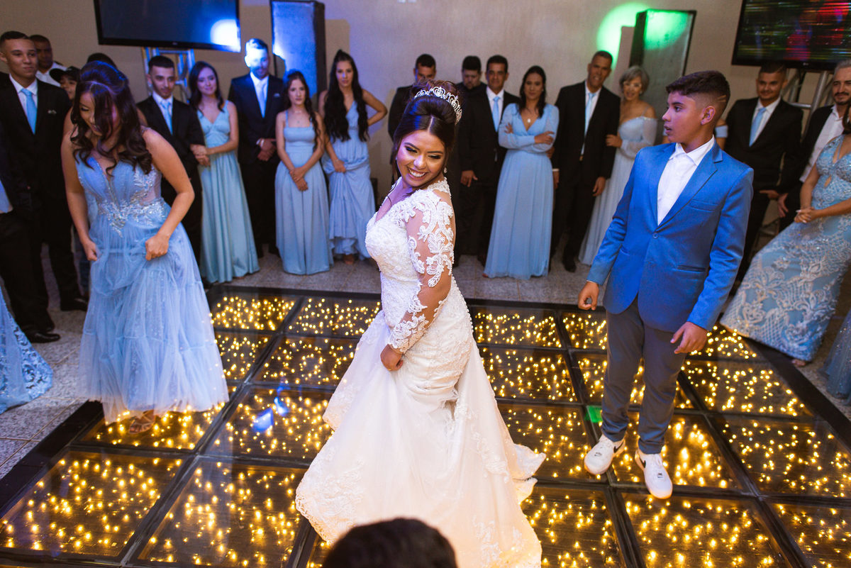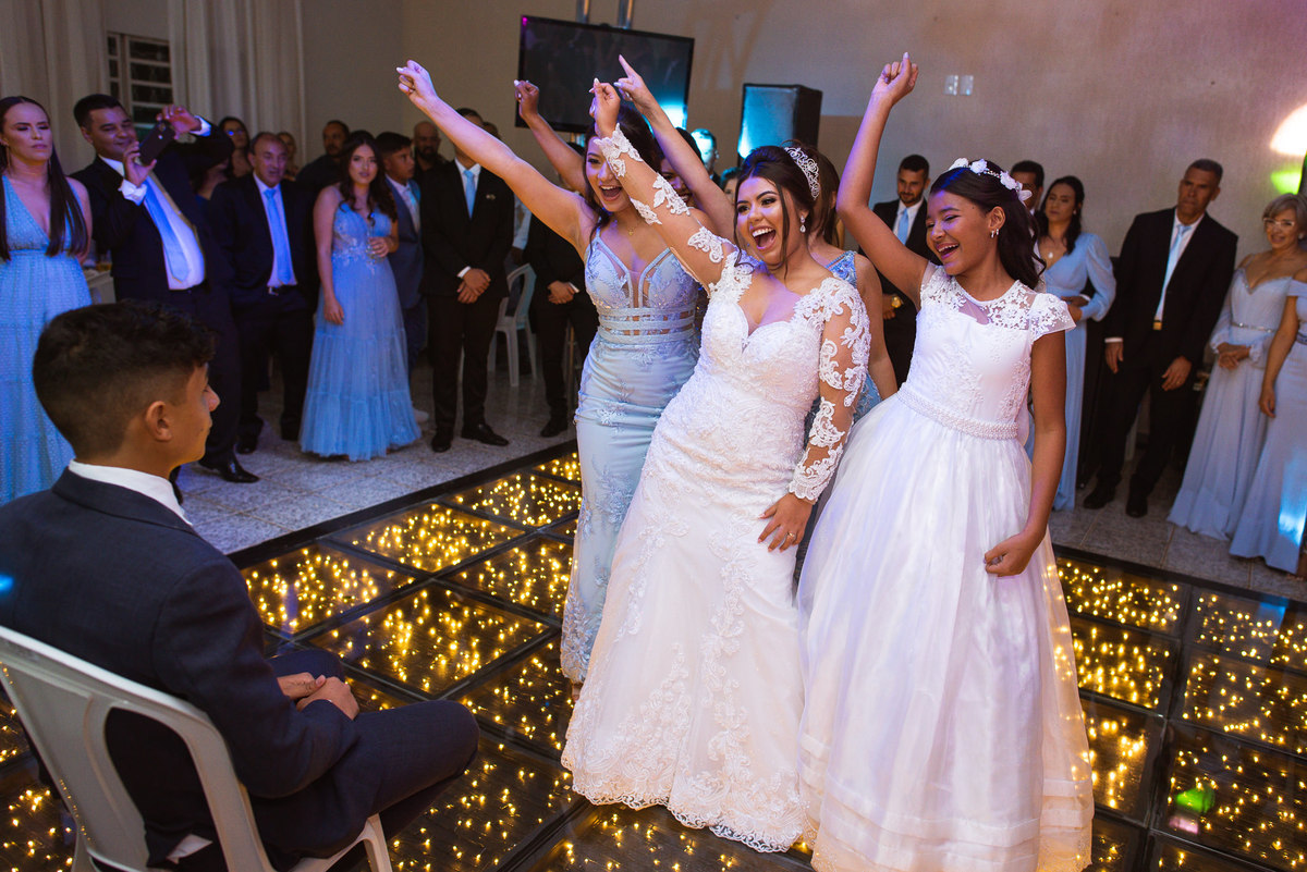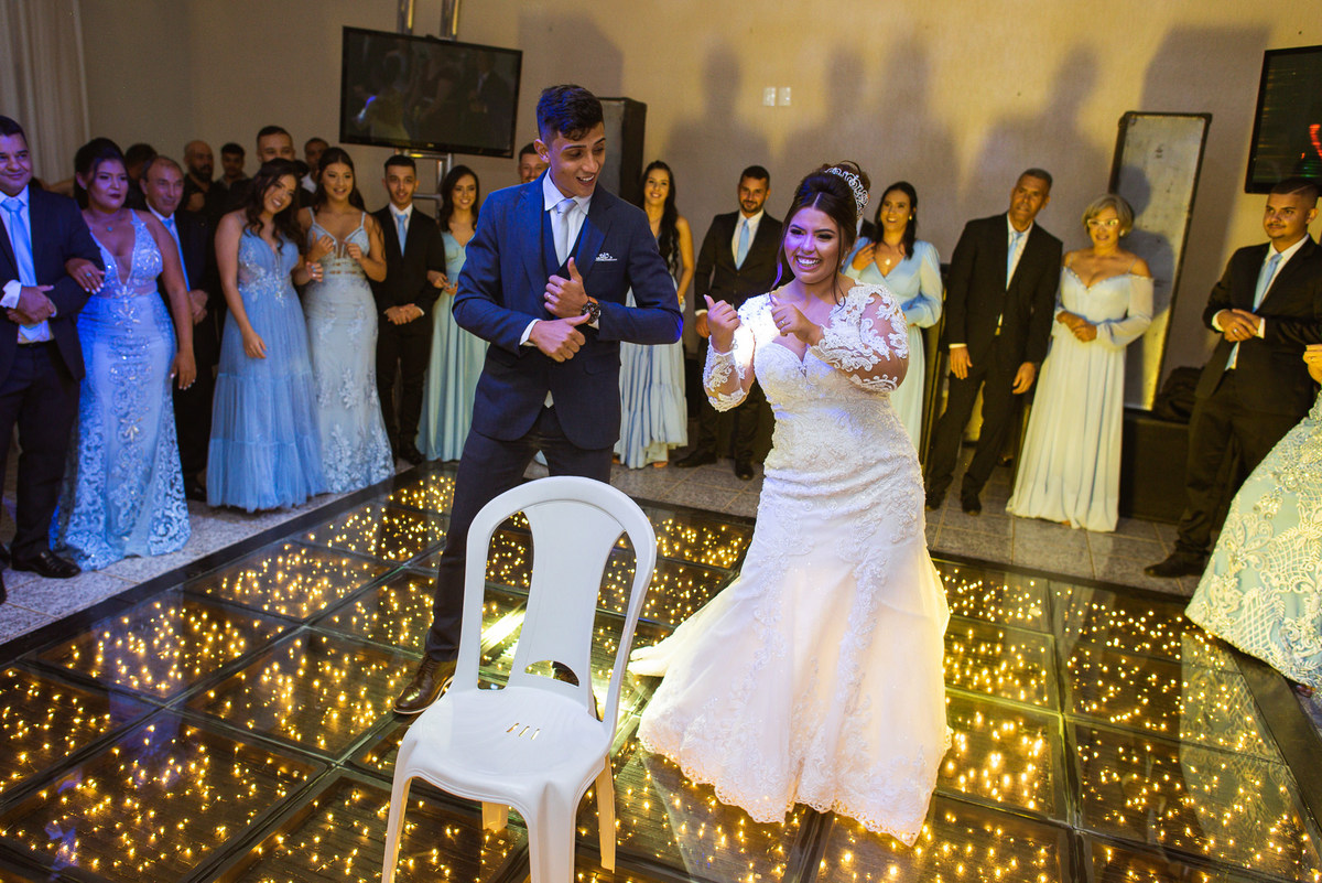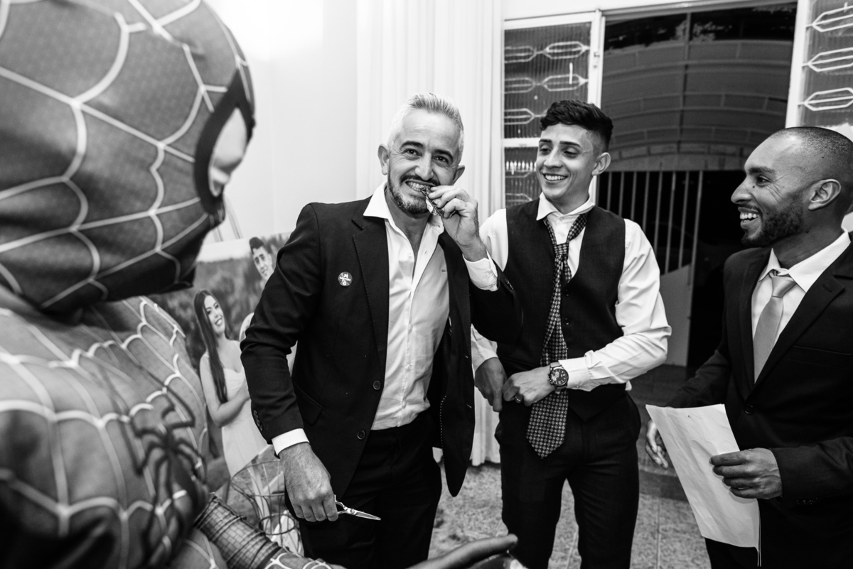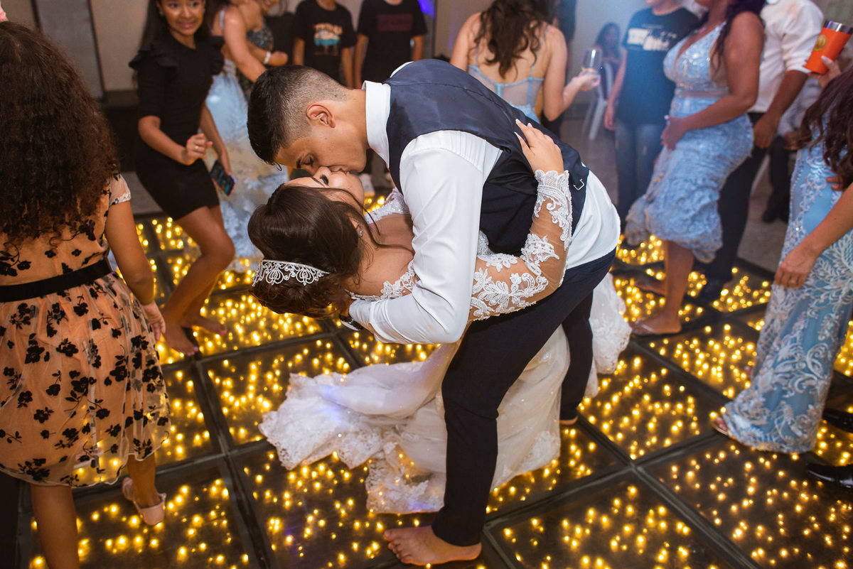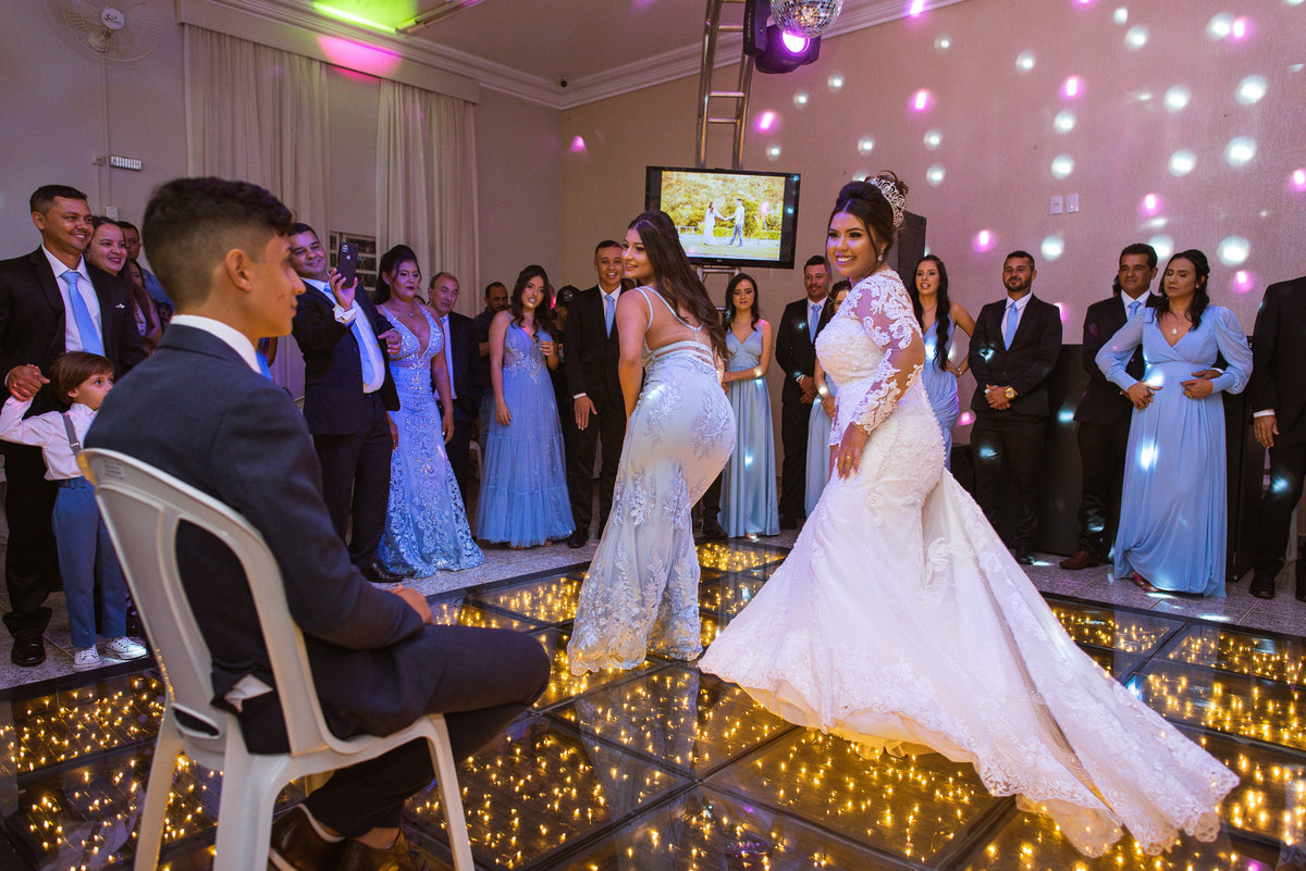Depois de se alimentarem, os noivos fizeram a entrada no salão e fizeram uma dança muito especial e divertida. Larissa e Vítor dançaram juntos e depois, a noiva fez a sua apresentação surpresa com a ajuda das madrinhas e amigos. Vítor ficou sentado no meio da pista assistindo a performance de sua amada. E te digo que ela conseguiu levantar todos os convidados que gritavam embalados pela dança e pela música. Depois desse pequeno show, eles receberam os cumprimentos dos amigos e convidados, se divertiram e dançaram muito. Um episódio à parte foi a participação do "Homem Aranha" que entrou no salão botando todo mundo pra dançar. Claro que também ajudou a arrecadar juntamente com os padrinhos durante a gravata também. Foi um show!