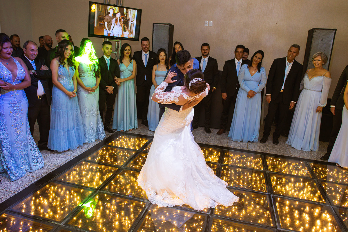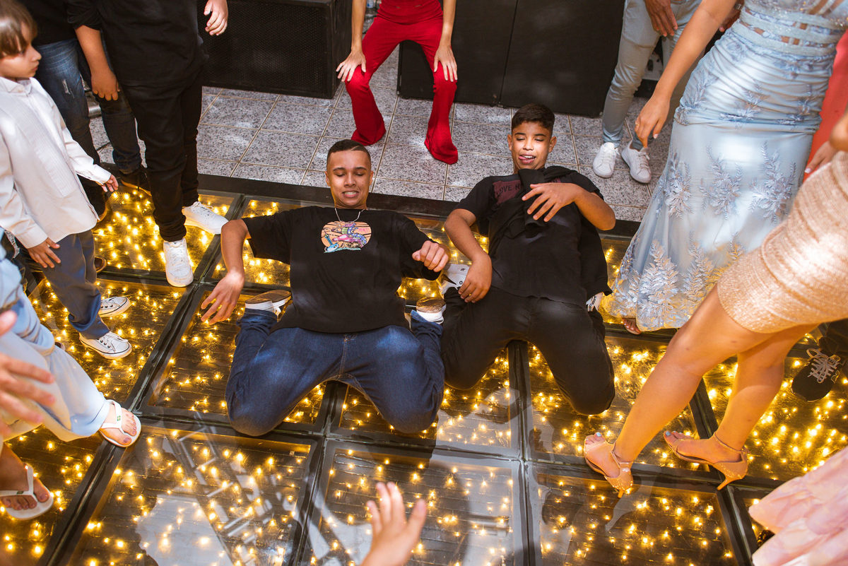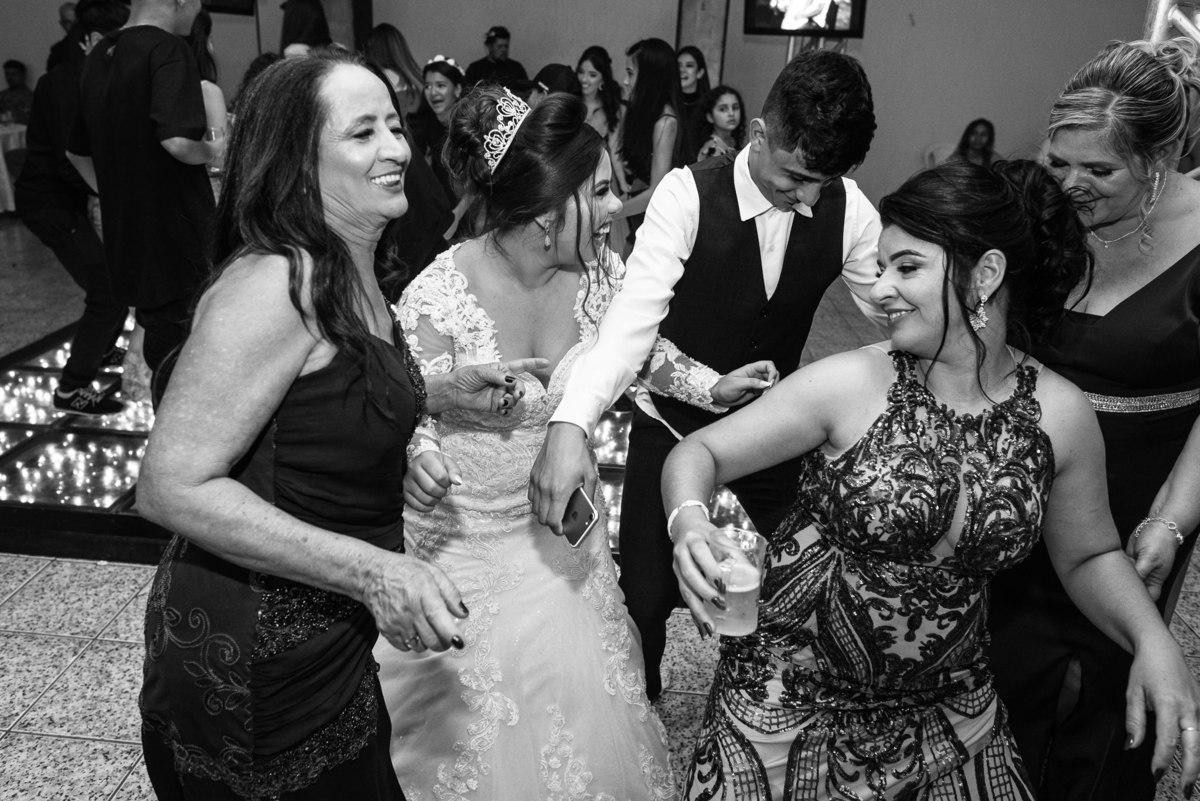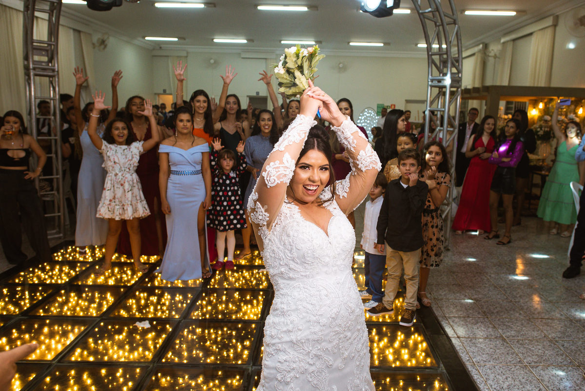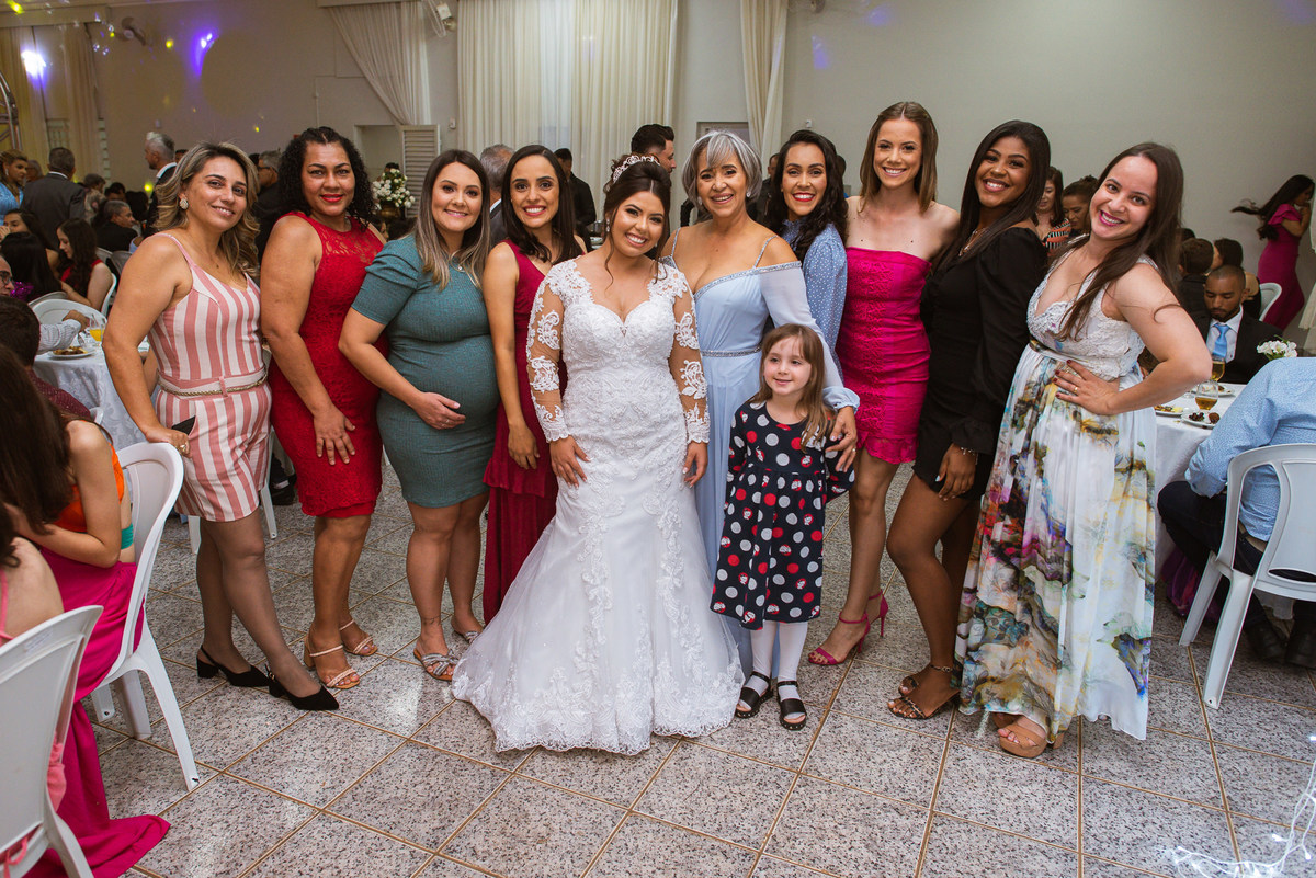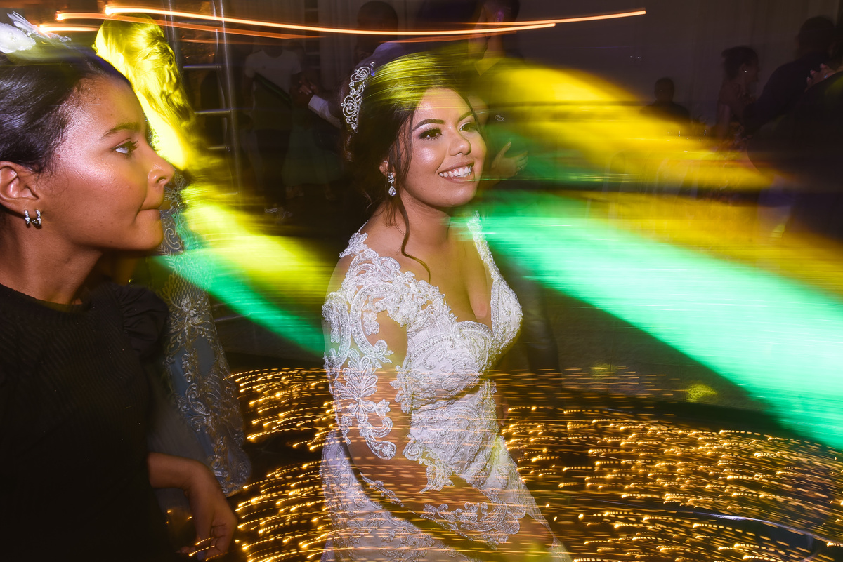 Depois de se alimentarem, os noivos fizeram a entrada no salão e fizeram uma dança muito especial e divertida. Larissa e Vítor dançaram juntos e depois, a noiva fez a sua apresentação surpresa com a ajuda das madrinhas e amigos. Vítor ficou sentado no meio da pista assistindo a performance de sua amada. E te digo que ela conseguiu levantar todos os convidados que gritavam embalados pela dança e pela música. Depois desse pequeno show, eles receberam os cumprimentos dos amigos e convidados, se divertiram e dançaram muito. Um episódio à parte foi a participação do "Homem Aranha" que entrou no salão botando todo mundo pra dançar. Claro que também ajudou a arrecadar juntamente com os padrinhos durante a gravata também. Foi um show!