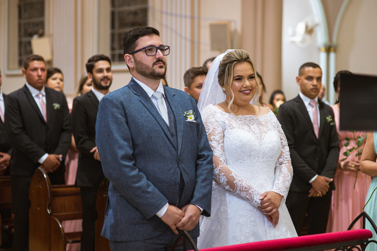Neste momento, o padre realizou a celebração com todo carinho. Disse palavras que eu tenho certeza que ficarão para sempre na memória dos noivos. As alianças foram abençoadas e colocadas nos respectivos dedos. Os votos foram repetidos e os dois foram abençoados e declarados casados perante Deus e as testemunhas que ali estavam. Fizemos as fotos de praxe e partimos para a saída. Larissa e Tiago caminharam juntos para receber os cumprimentos dos convidados e celebrar a data tão especial. Comemoraram juntos na porta da Igreja e partimos para a recepção.