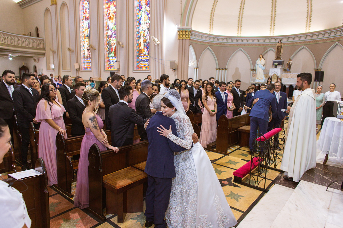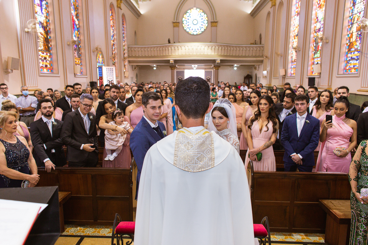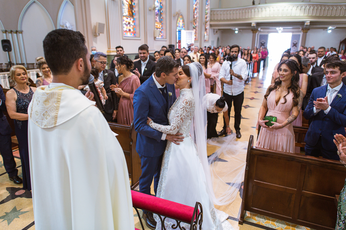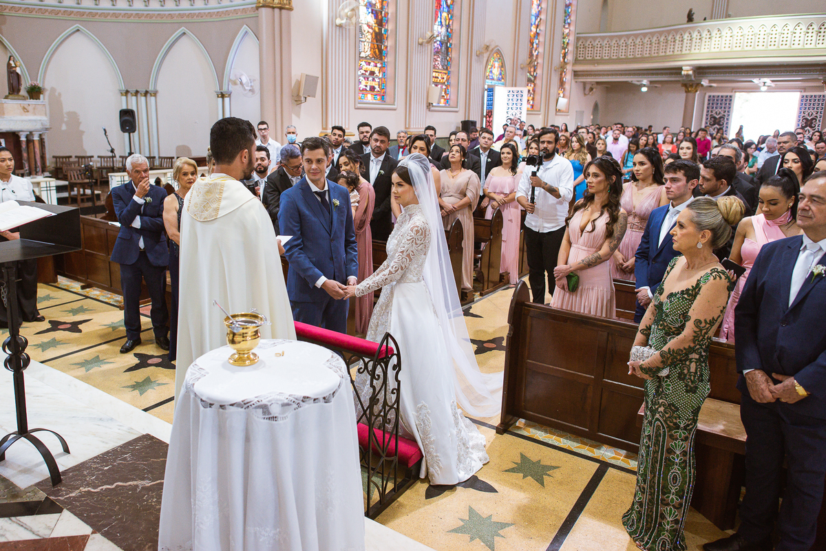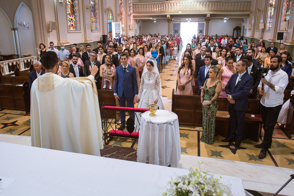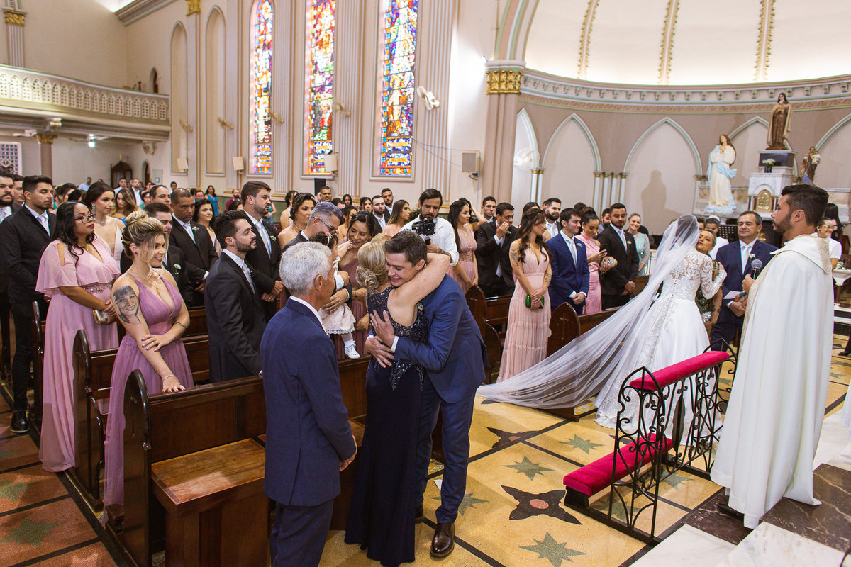A celebração foi maravilhosa e muito emocionante. Logo após a homilia, o padre surpreendeu à todos pedindo que os noivos agradecessem aos seus pais por terem cuidado deles até aquele momento. Depois, ele pediu que os a noiva abraçasse os pais do noivo e também agradecesse à eles por cuidar de seu noivo até aquele momento e com o noivo da mesma forma. Foi uma parte muito emocionante e gratificante. Poucos minutos antes, na entrada de Martius, ele fez questão de abraçar e se despedir dos seus pais e foi do outro lado e abraçou a mãe da noiva que estava ali. Então foi algo muito bacana que o padre realizou. Quebrou um pouco toda aquela rigidez que a celebração tem.