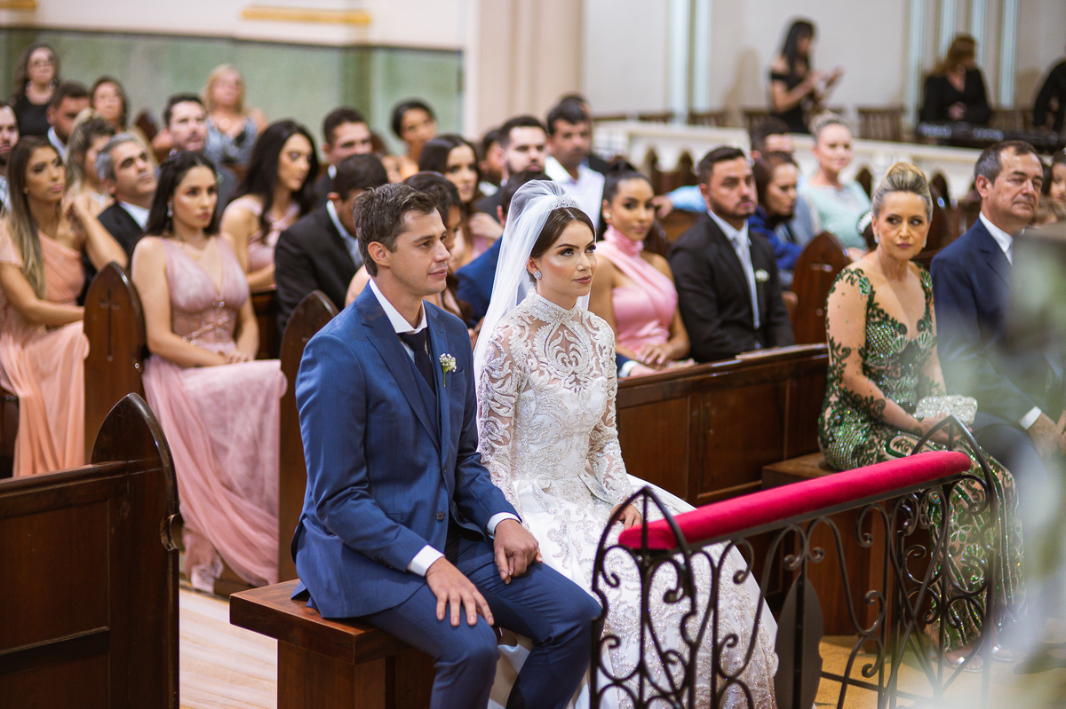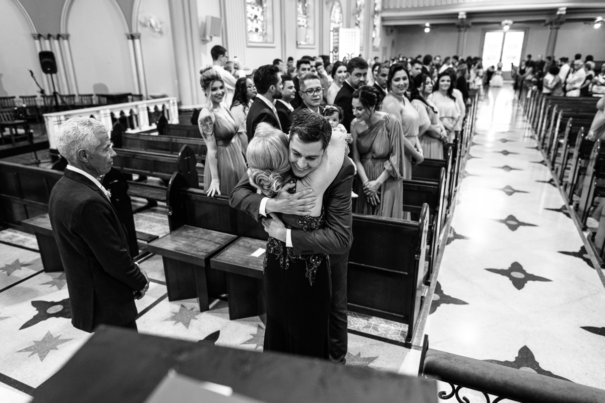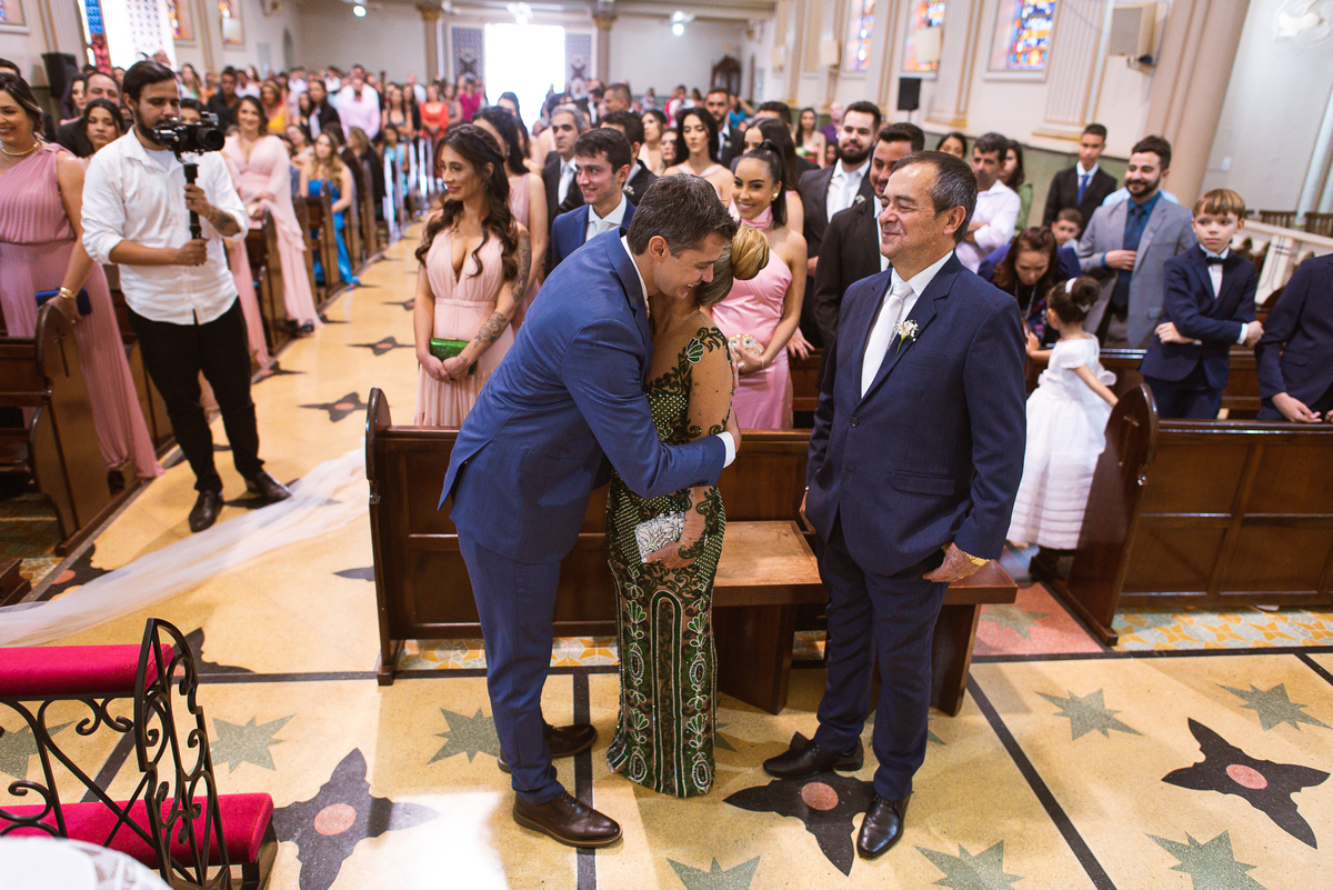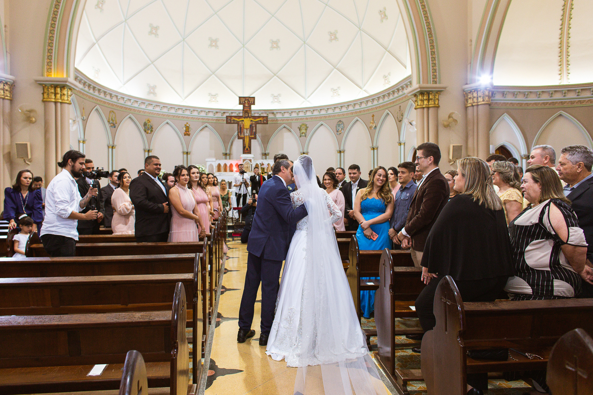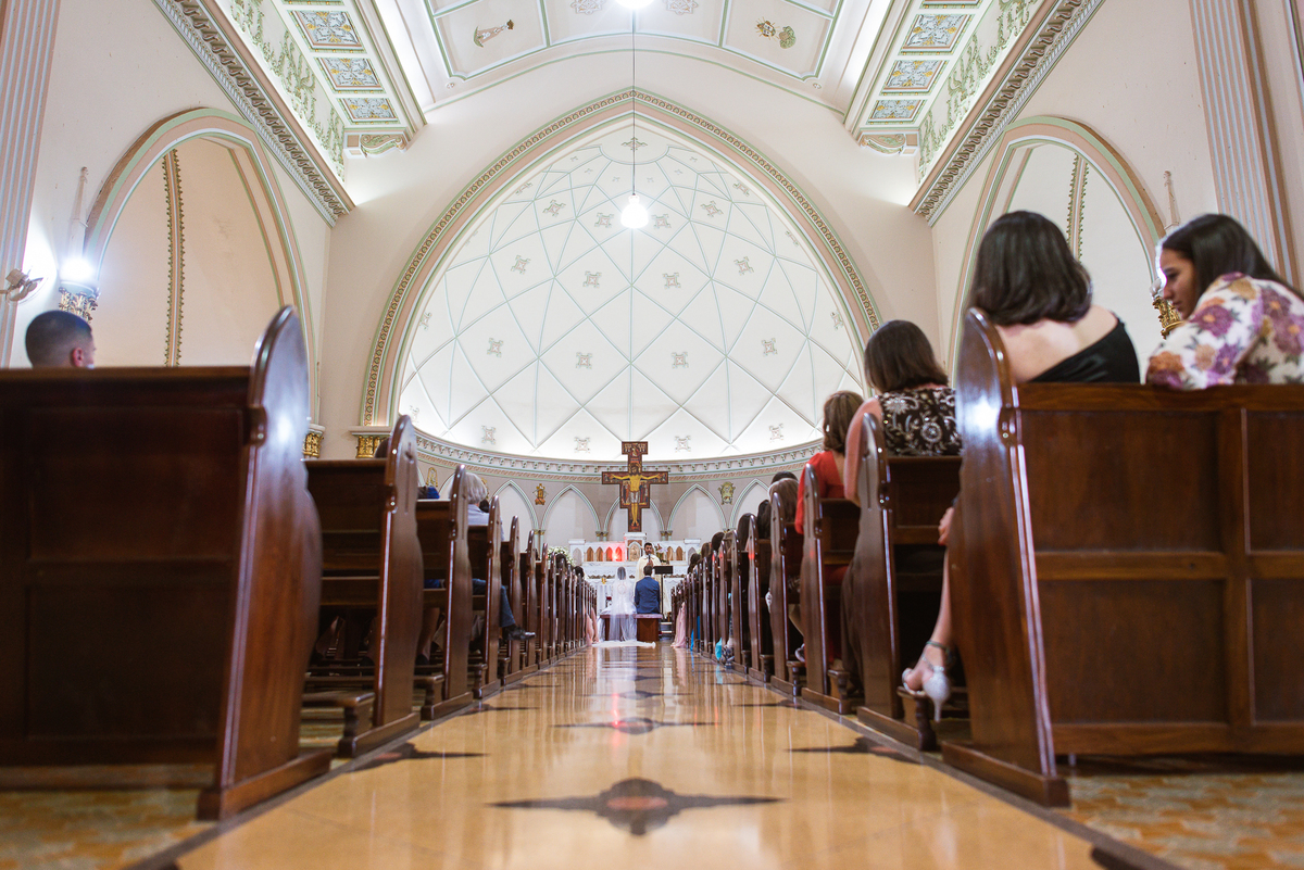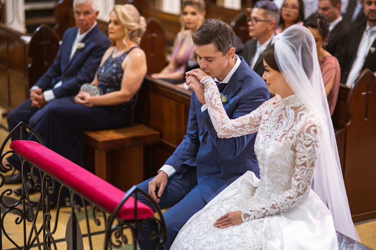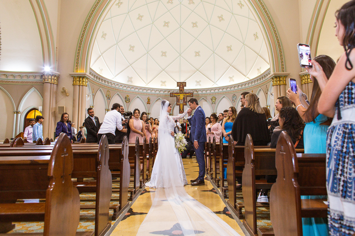 A celebração foi maravilhosa e muito emocionante. Logo após a homilia, o padre surpreendeu à todos pedindo que os noivos agradecessem aos seus pais por terem cuidado deles até aquele momento. Depois, ele pediu que os a noiva abraçasse os pais do noivo e também agradecesse à eles por cuidar de seu noivo até aquele momento e com o noivo da mesma forma. Foi uma parte muito emocionante e gratificante. Poucos minutos antes, na entrada de Martius, ele fez questão de abraçar e se despedir dos seus pais e foi do outro lado e abraçou a mãe da noiva que estava ali. Então foi algo muito bacana que o padre realizou. Quebrou um pouco toda aquela rigidez que a celebração tem.