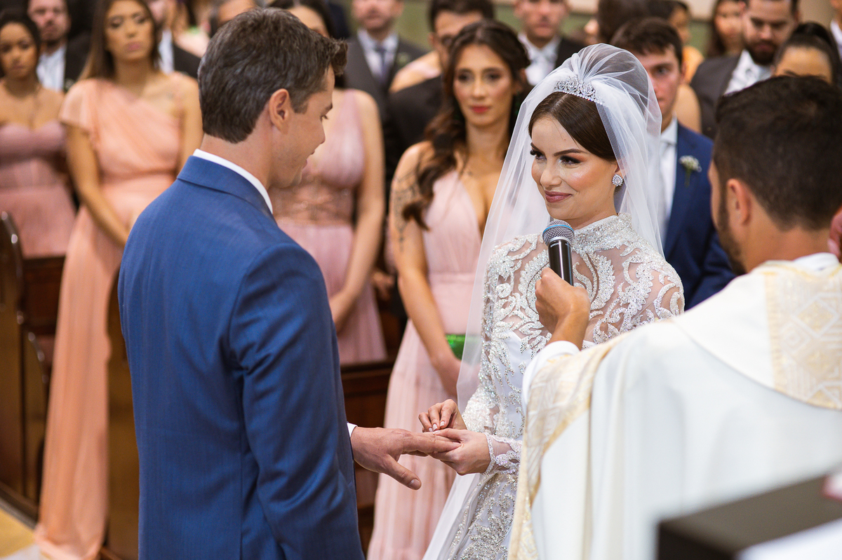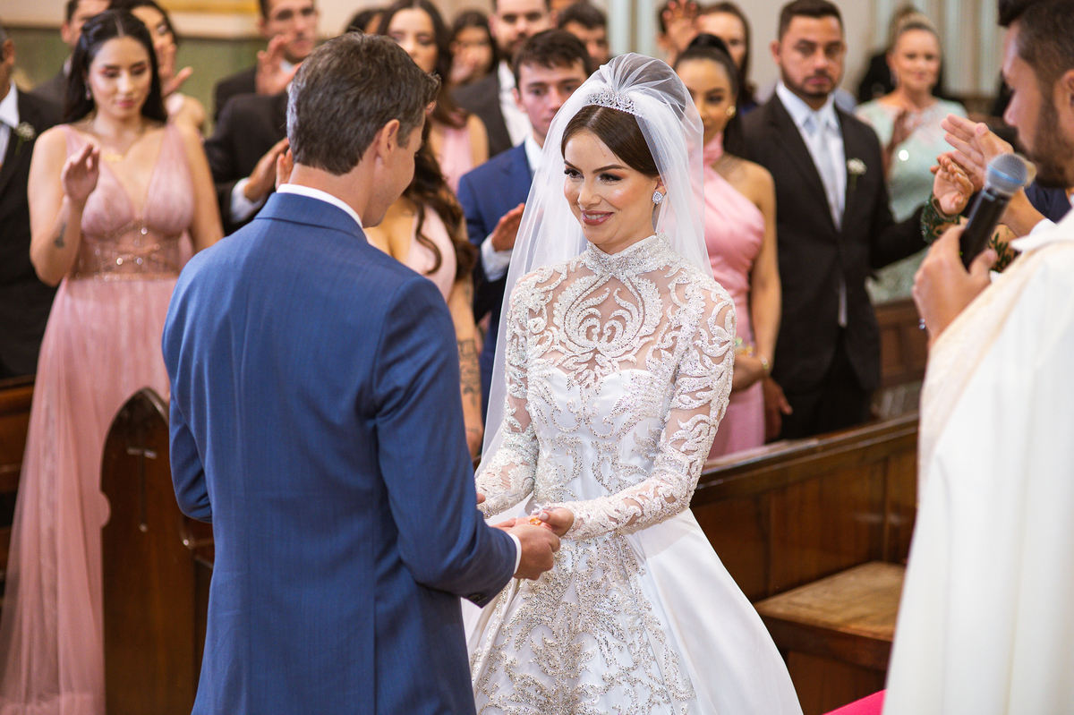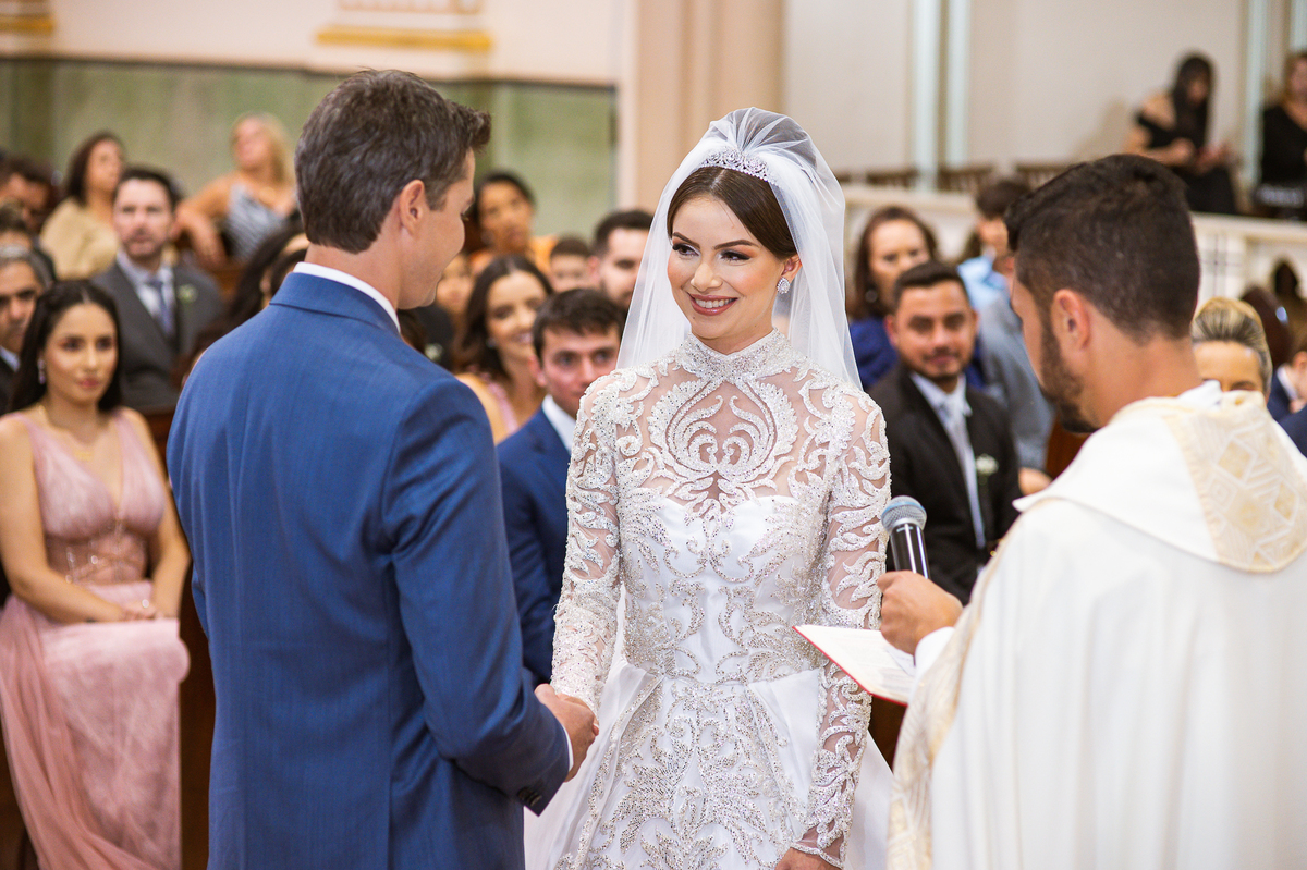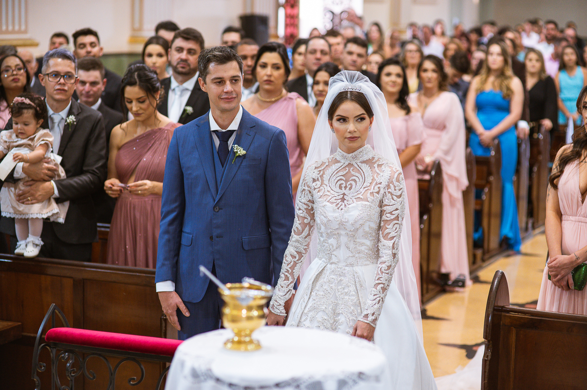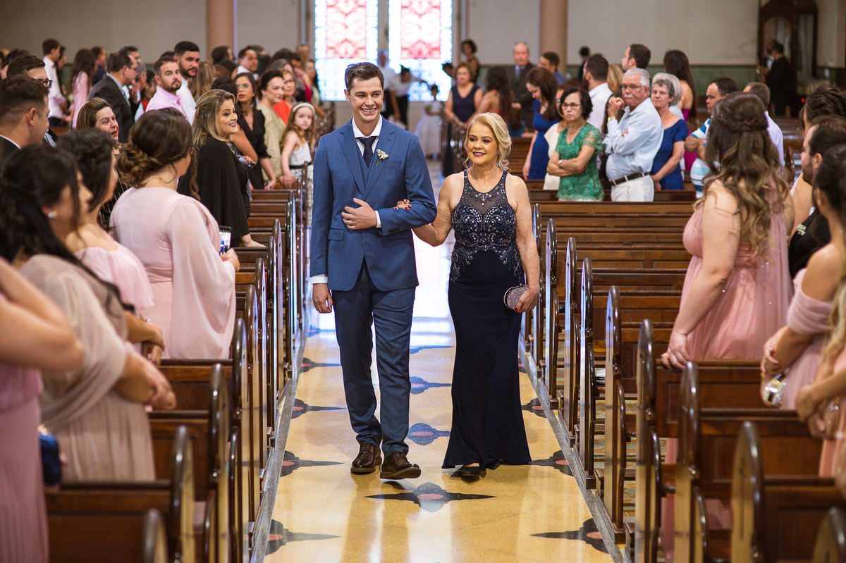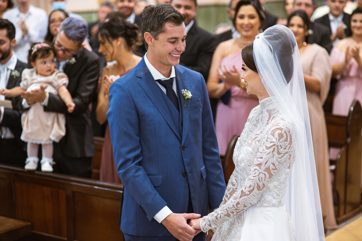 A celebração foi maravilhosa e muito emocionante. Logo após a homilia, o padre surpreendeu à todos pedindo que os noivos agradecessem aos seus pais por terem cuidado deles até aquele momento. Depois, ele pediu que os a noiva abraçasse os pais do noivo e também agradecesse à eles por cuidar de seu noivo até aquele momento e com o noivo da mesma forma. Foi uma parte muito emocionante e gratificante. Poucos minutos antes, na entrada de Martius, ele fez questão de abraçar e se despedir dos seus pais e foi do outro lado e abraçou a mãe da noiva que estava ali. Então foi algo muito bacana que o padre realizou. Quebrou um pouco toda aquela rigidez que a celebração tem.