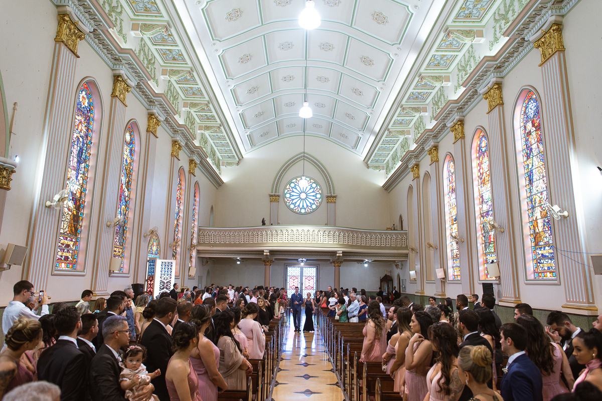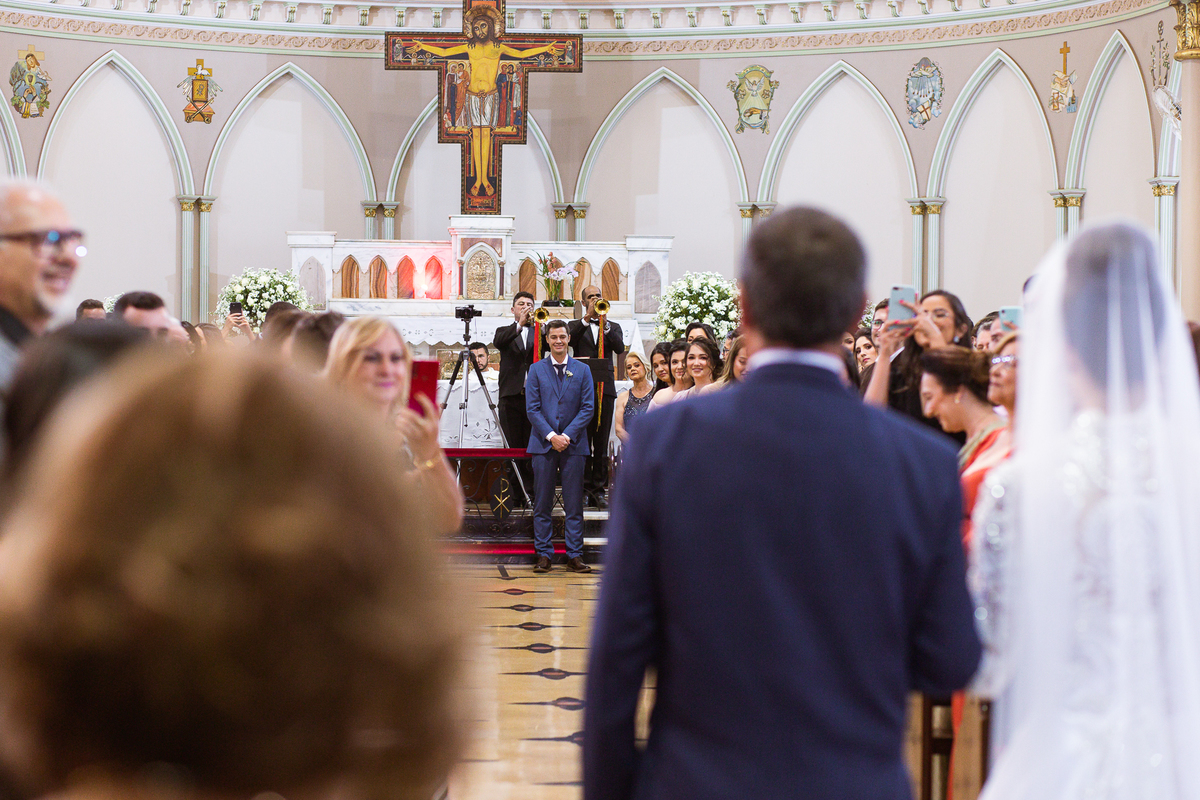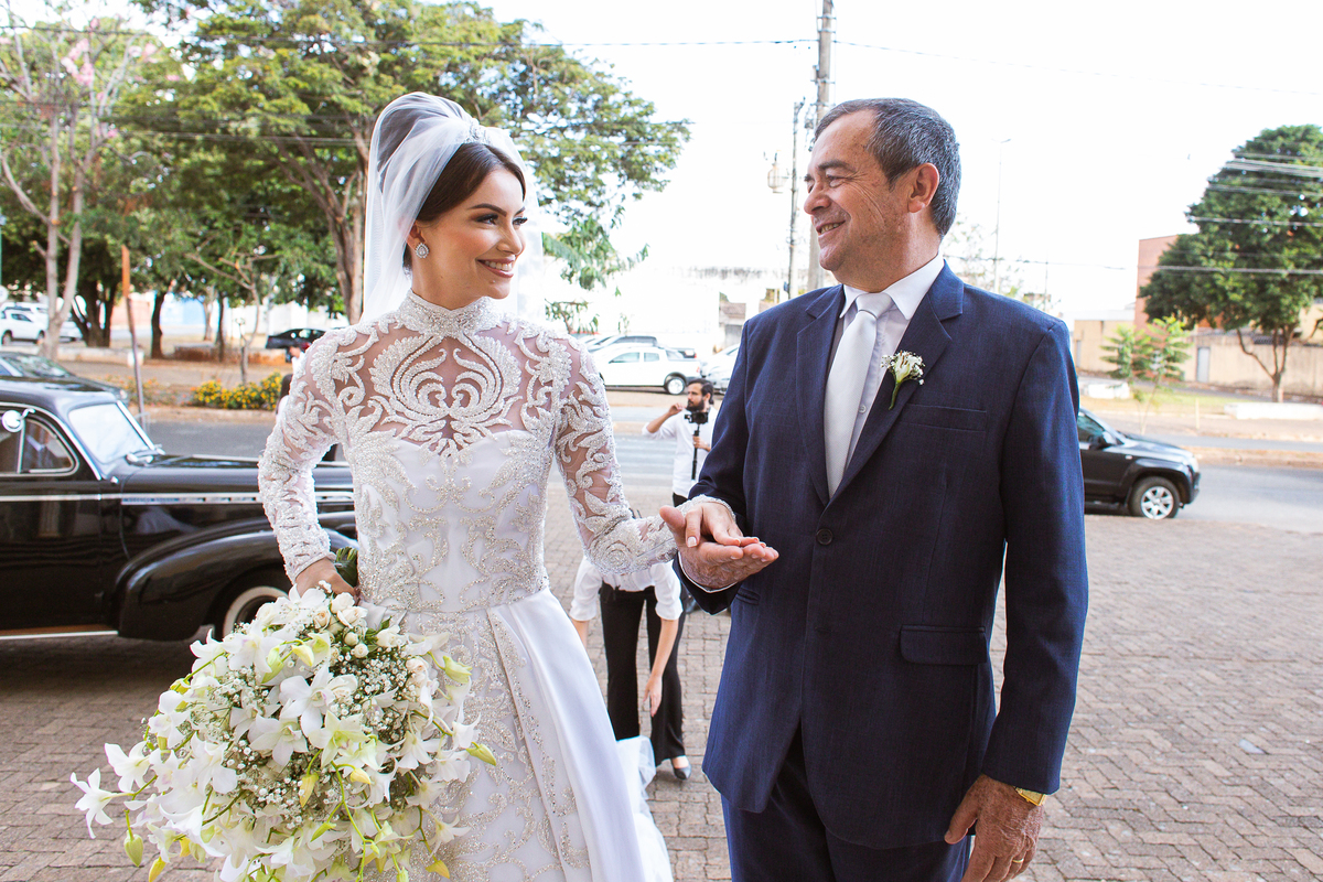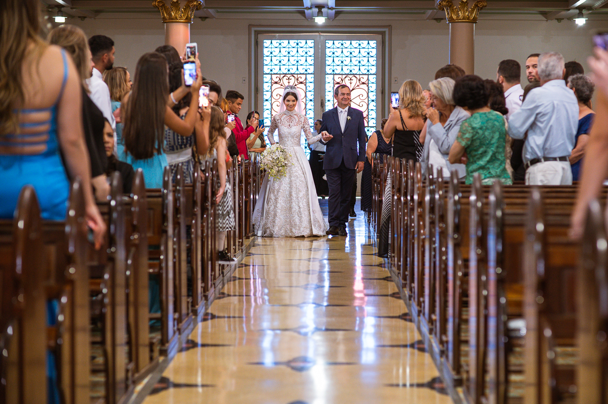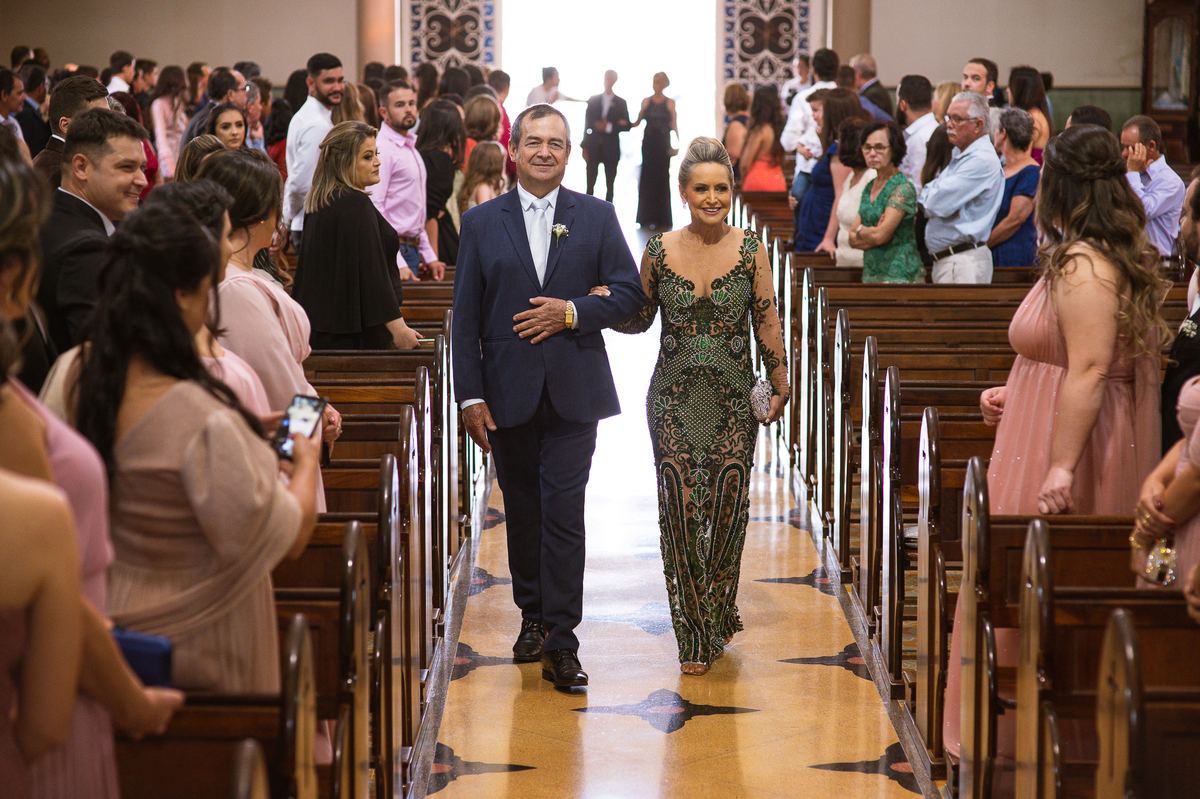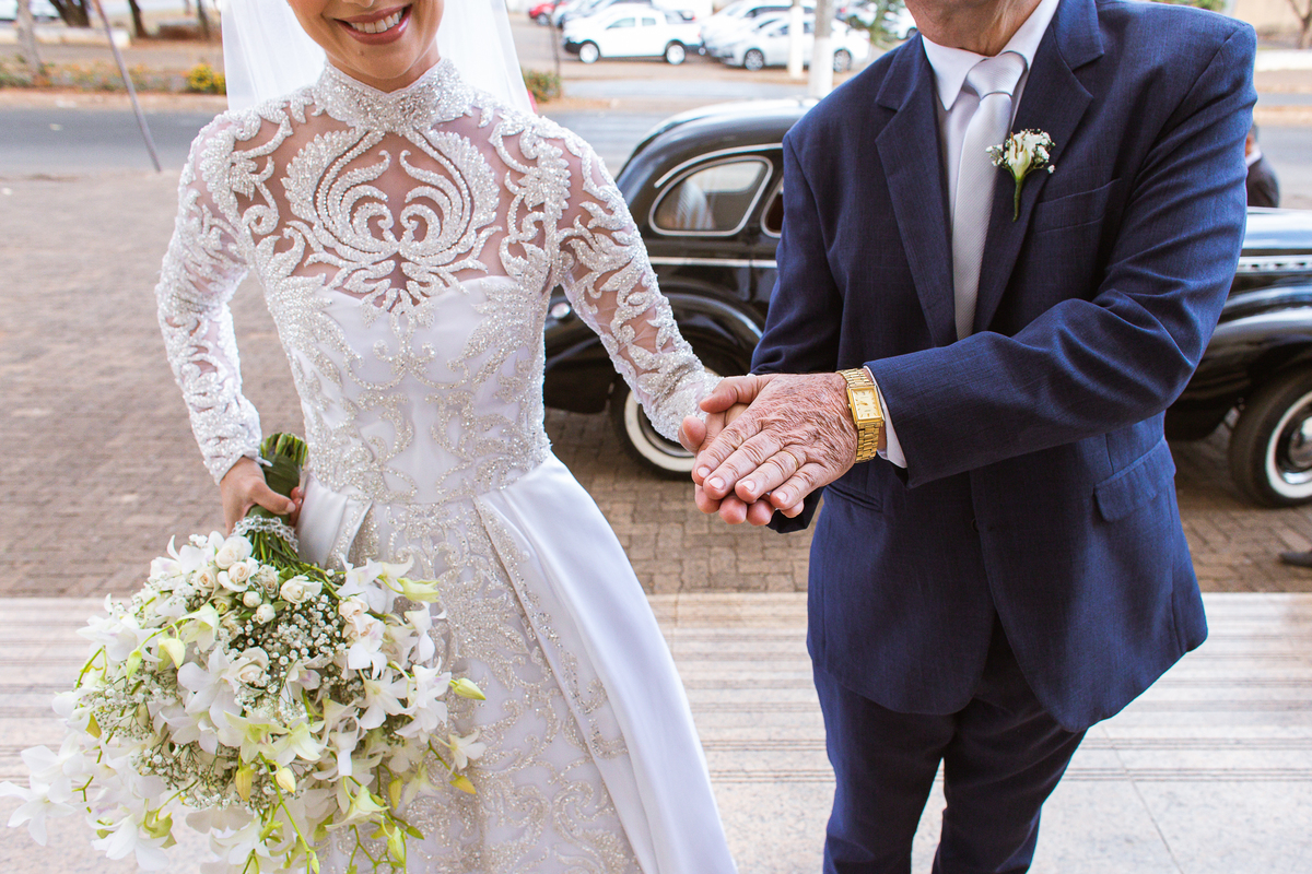 Os músicos do Som do Coração já estavam preparados aguardando o início da celebração. Aos pouquinhos, a fila dos padrinhos e os últimos detalhes iam sendo realizados. Daniela Benhures que cuidou de todos os detalhes do casamento já estava com tudo prontinho e a cerimônia teve seu início imediato. Ariella estava ali no carro, aguardando o seu momento de brilhar. Enquanto isso, os padrinhos e o noivo adentravam embalados pelas músicas escolhidas a dedo pelos noivos. Quando as portas da Igreja se fecharam, a emoção tomou conta de todos. Do lado de fora, Humberto, o pai da noiva, foi até o carro ajudar sua filha a descer. Claro que não poderia faltar aquele último beijinho na mão e no rosto pra render aquela foto linda pro álbum.