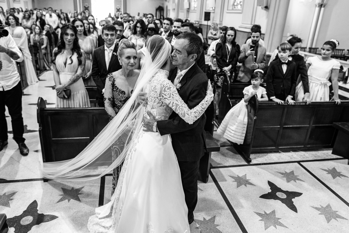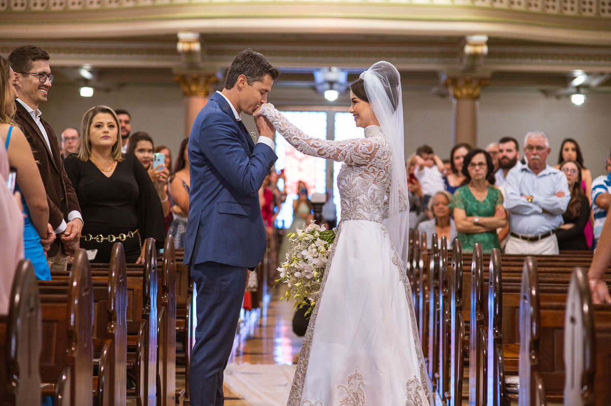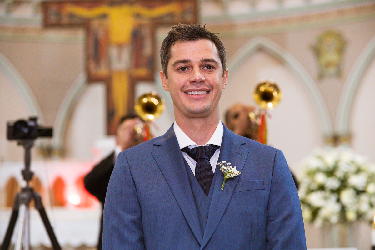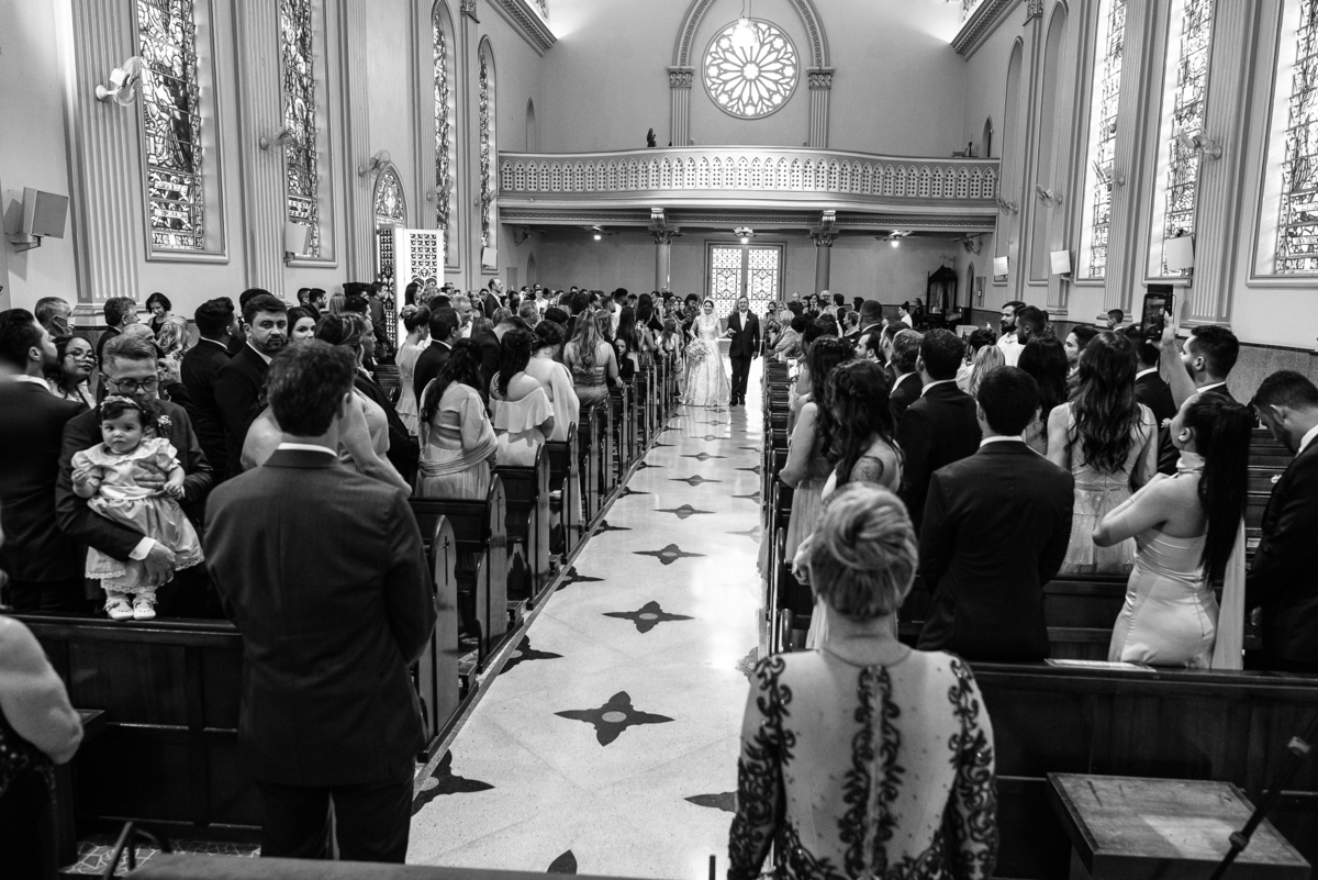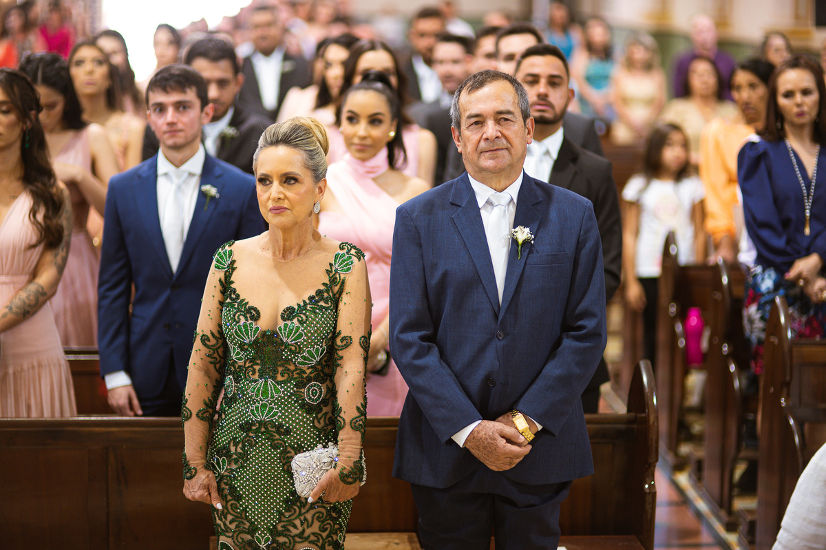 Os músicos do Som do Coração já estavam preparados aguardando o início da celebração. Aos pouquinhos, a fila dos padrinhos e os últimos detalhes iam sendo realizados. Daniela Benhures que cuidou de todos os detalhes do casamento já estava com tudo prontinho e a cerimônia teve seu início imediato. Ariella estava ali no carro, aguardando o seu momento de brilhar. Enquanto isso, os padrinhos e o noivo adentravam embalados pelas músicas escolhidas a dedo pelos noivos. Quando as portas da Igreja se fecharam, a emoção tomou conta de todos. Do lado de fora, Humberto, o pai da noiva, foi até o carro ajudar sua filha a descer. Claro que não poderia faltar aquele último beijinho na mão e no rosto pra render aquela foto linda pro álbum.