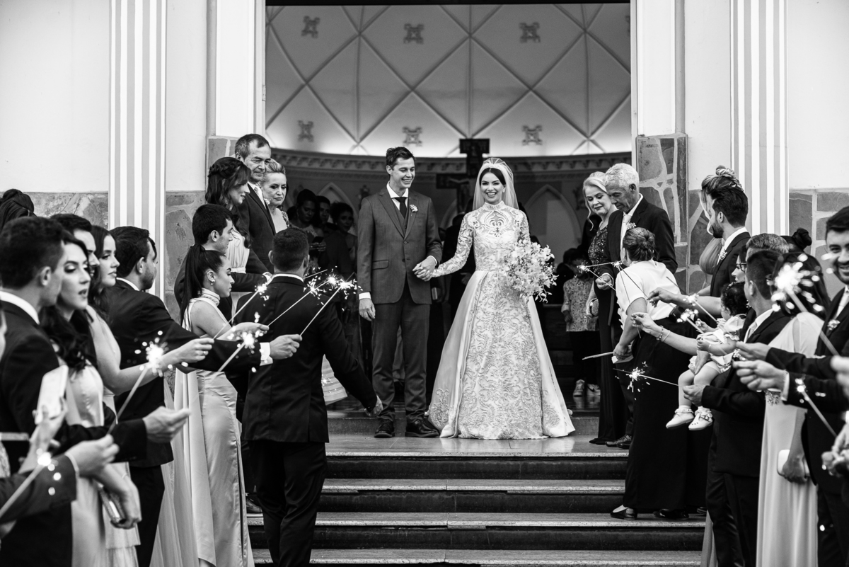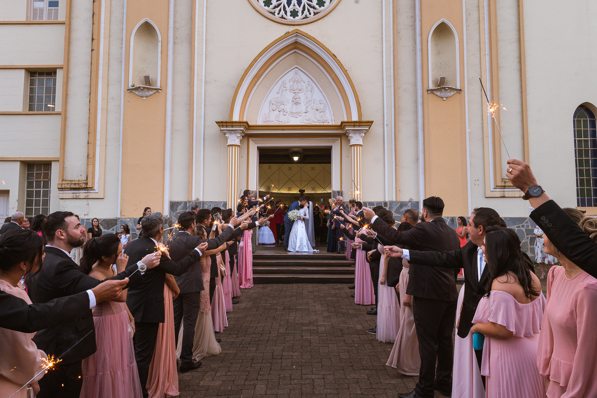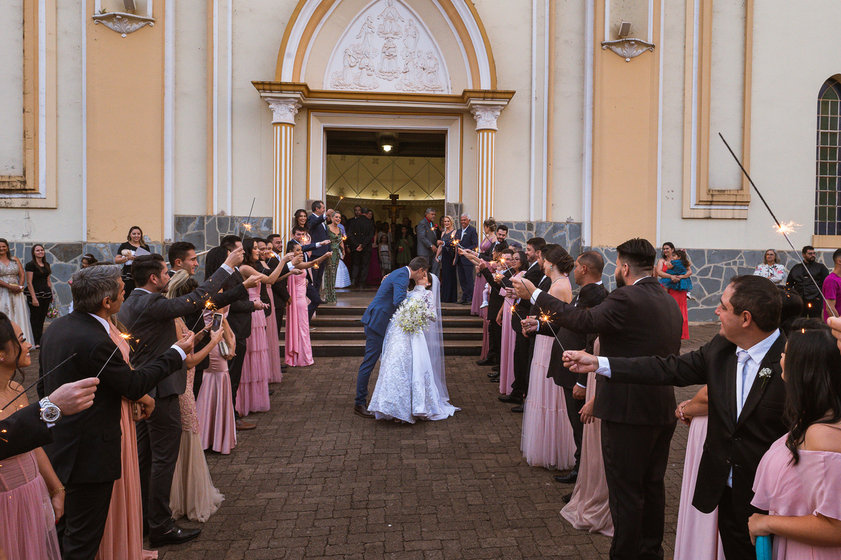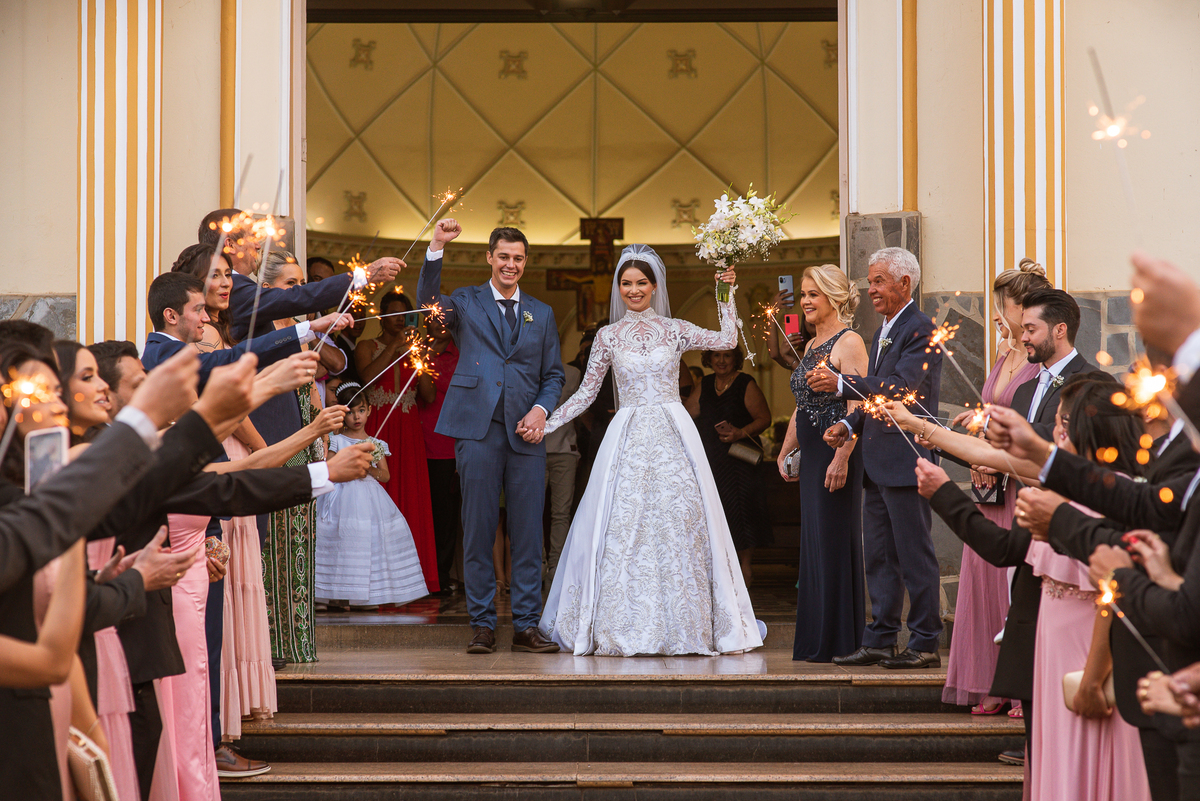Finalizando esta parte, os noivos trocaram os votos e com as alianças abençoadas eles foram declarados casados e receberam a bênção final pelo padre. A saída também foi um show, com os tradicionais sparkles, os padrinhos comemorando muito aquele momento do casamento dos noivos. Com um beijo cinematográfico, eles festejaram a bênção recebida e agradeceram aos convidados que ali estavam. Fomos para a praça para fazermos um mini ensaio dos noivos com aquele carro maravilhoso enquanto a recepção era preparada e as pessoas iam chegando. E estava uma tarde linda que nos rendeu ótimas fotos.