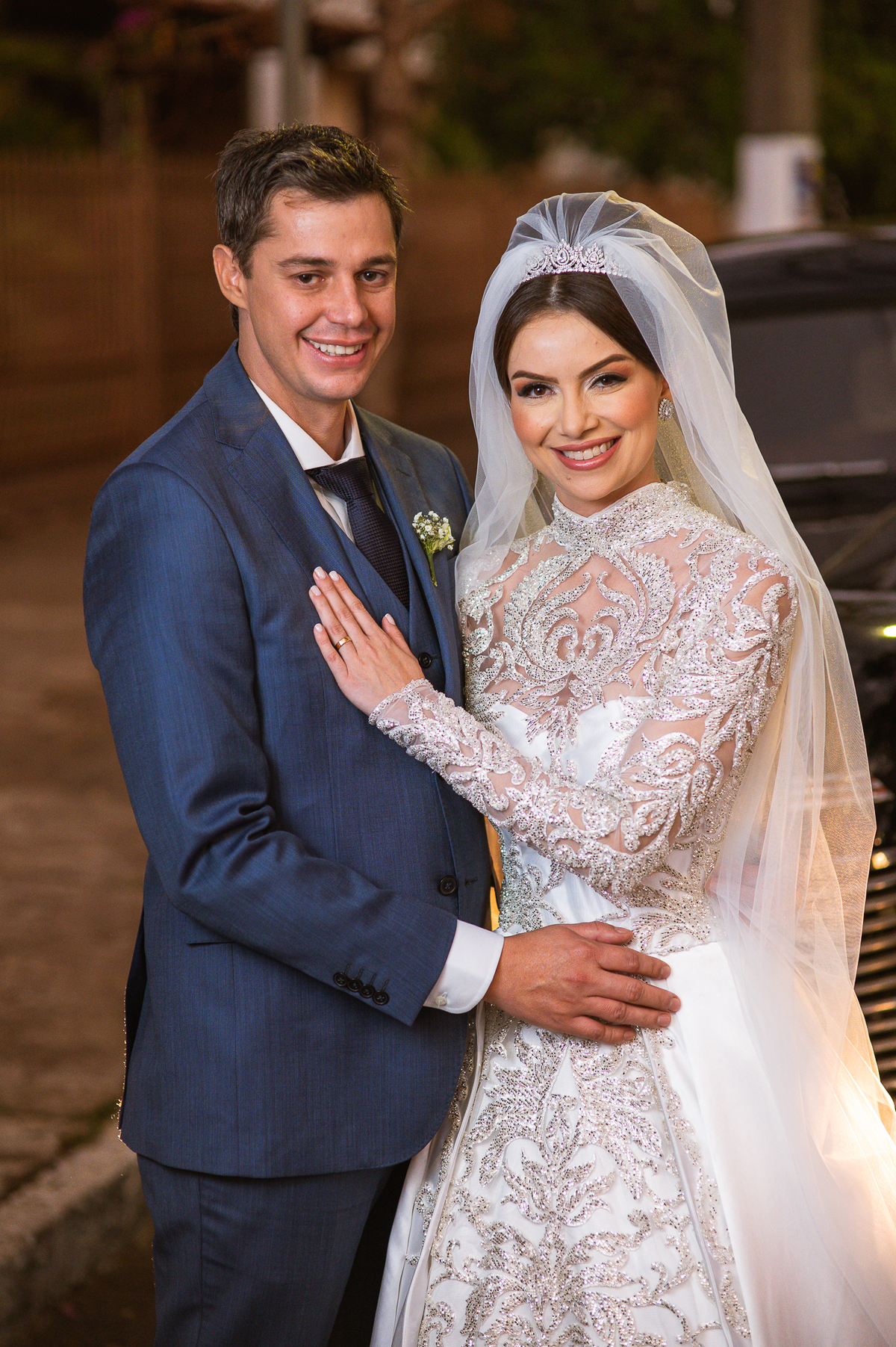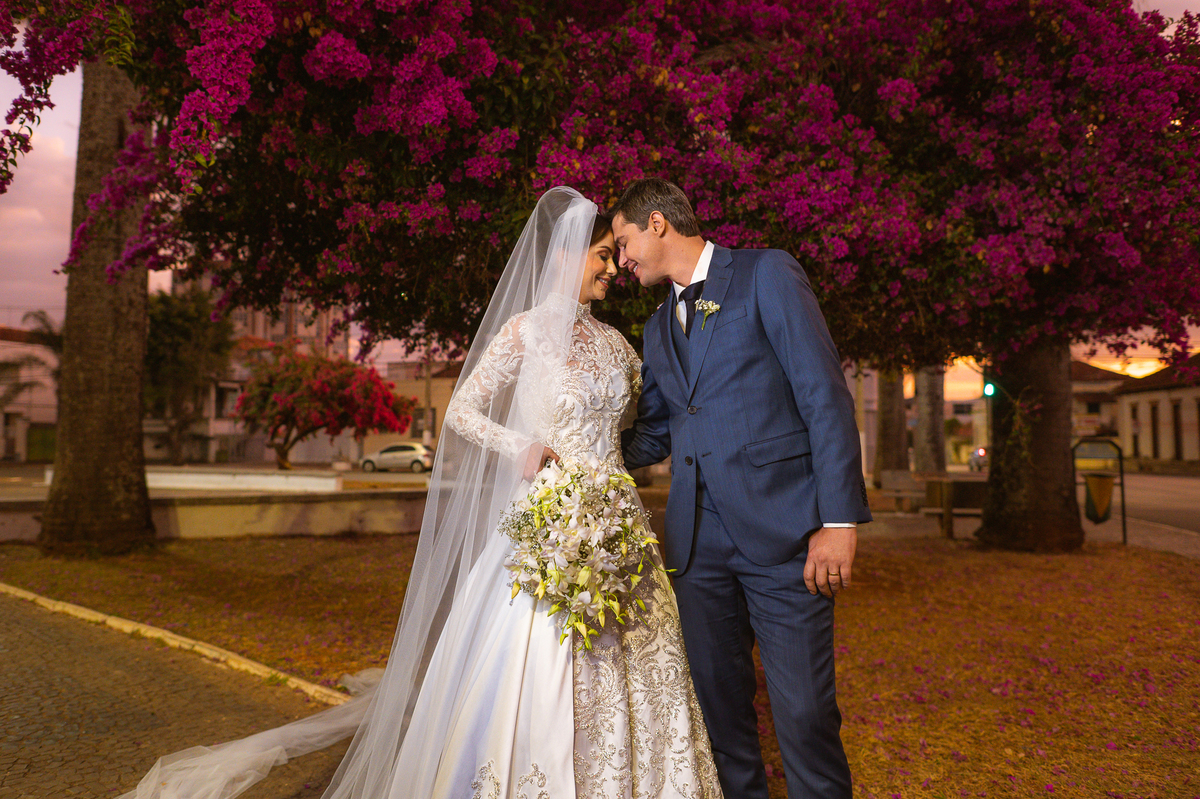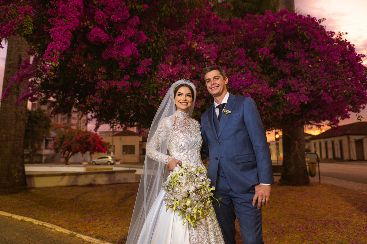 Finalizando esta parte, os noivos trocaram os votos e com as alianças abençoadas eles foram declarados casados e receberam a bênção final pelo padre. A saída também foi um show, com os tradicionais sparkles, os padrinhos comemorando muito aquele momento do casamento dos noivos. Com um beijo cinematográfico, eles festejaram a bênção recebida e agradeceram aos convidados que ali estavam. Fomos para a praça para fazermos um mini ensaio dos noivos com aquele carro maravilhoso enquanto a recepção era preparada e as pessoas iam chegando. E estava uma tarde linda que nos rendeu ótimas fotos.