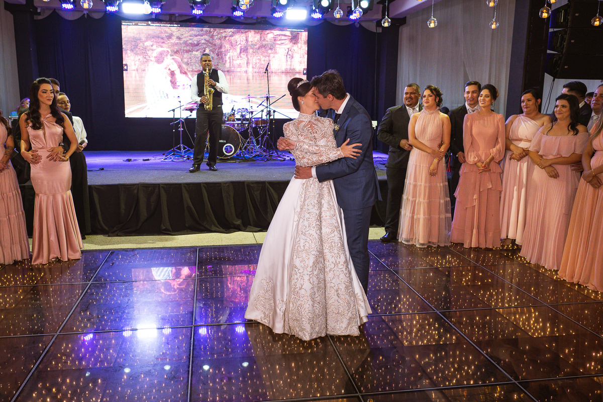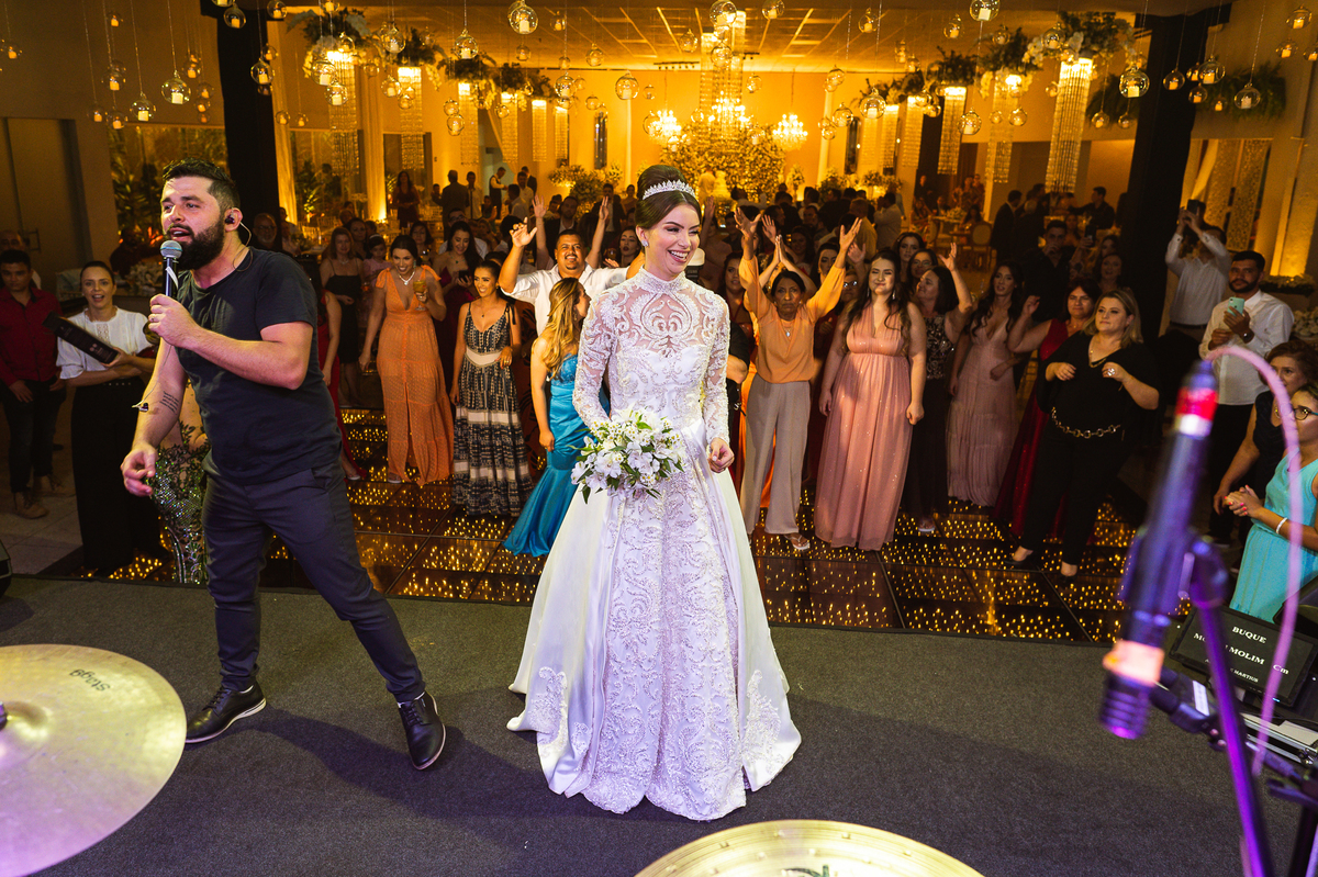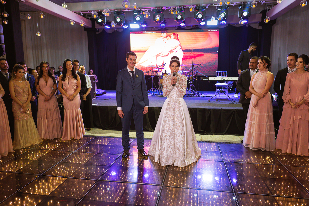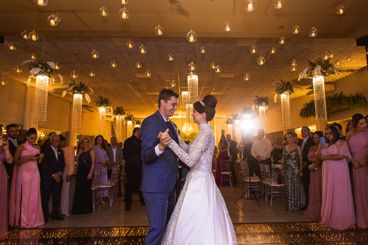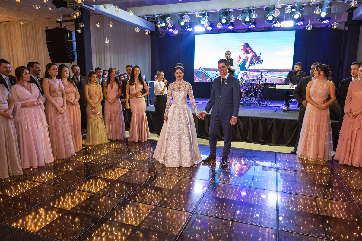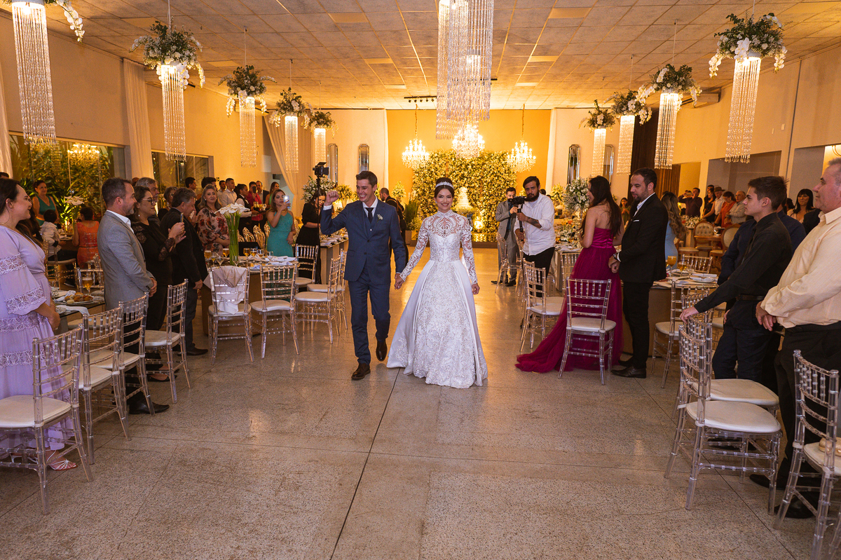 Os noivos escolheram o House Fest para recepcionar seus convidados. Lá chegando, a decoração era de cai o queixo. Neimar Decorações criou um verdadeiro palácio com a ornamentação recheada de flores naturais por todos os lados. Lustres faziam um corredor rumo à pista de dança e o local do bolo mais parecia um cenário de novela. Já na porta, os convidados eram recepcionados pelo grupo Akazu. Os noivos foram recebidos com muita festa, ao som do saxofone que os acompanhou até a pista de dança. Os padrinhos já estavam posicionados aguardando. A primeira dança dos recém-casados aconteceu ali mesmo. Com muita alegria, eles prepararam uma dança toda especial. Após a dança, brindaram com todos os padrinhos e madrinhas.