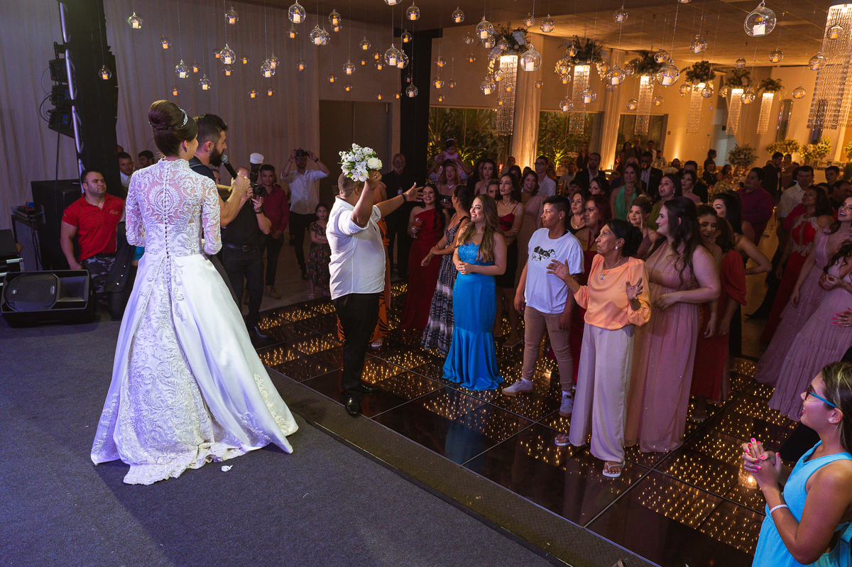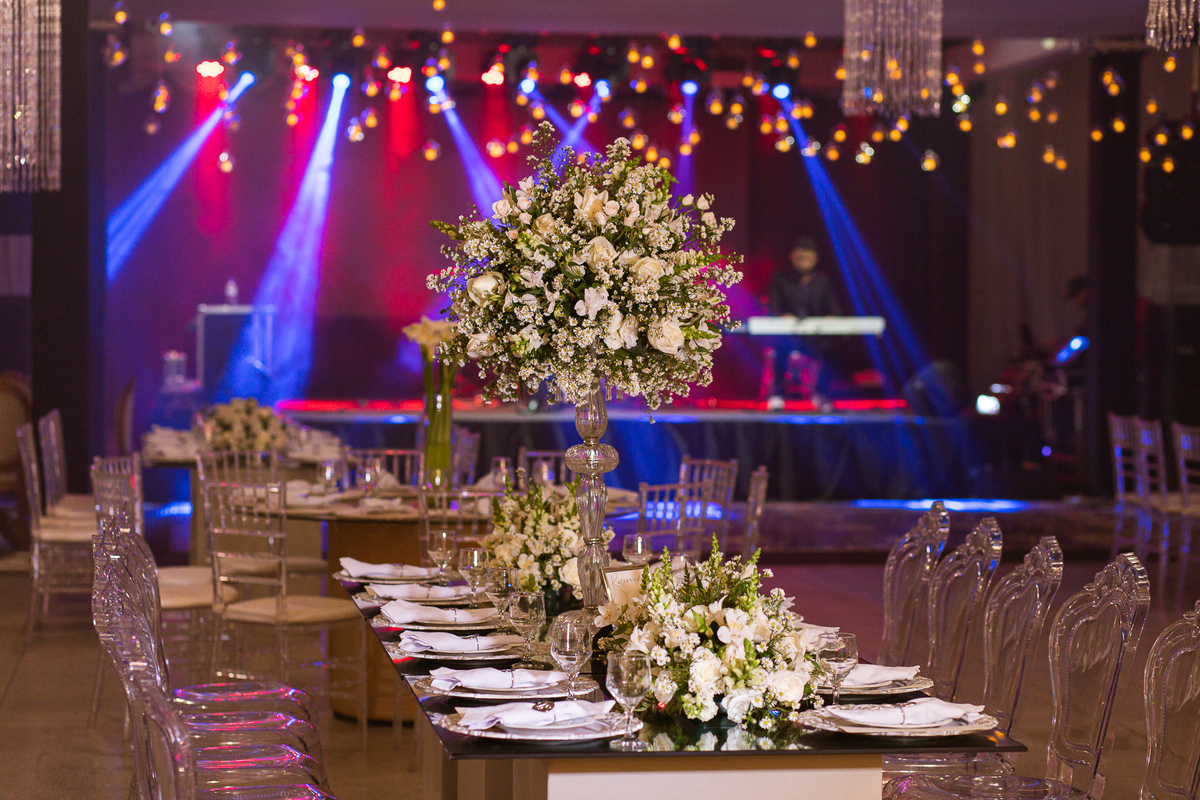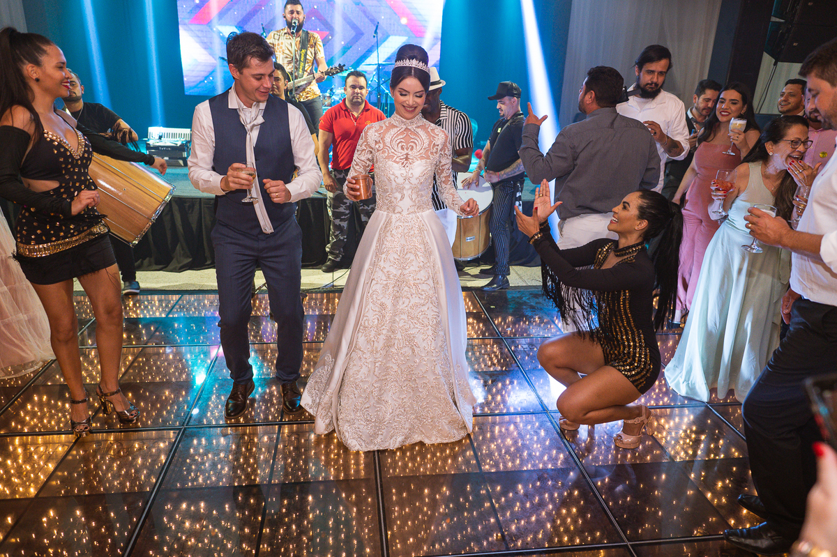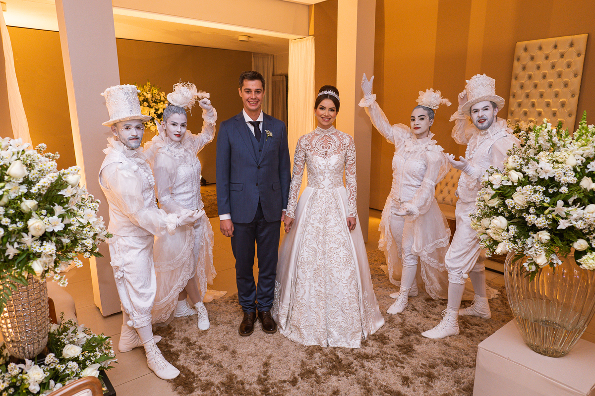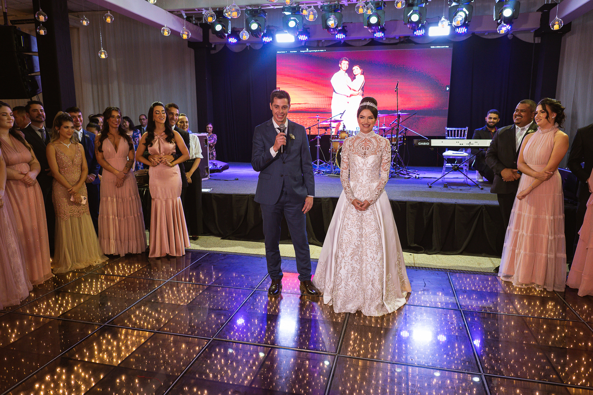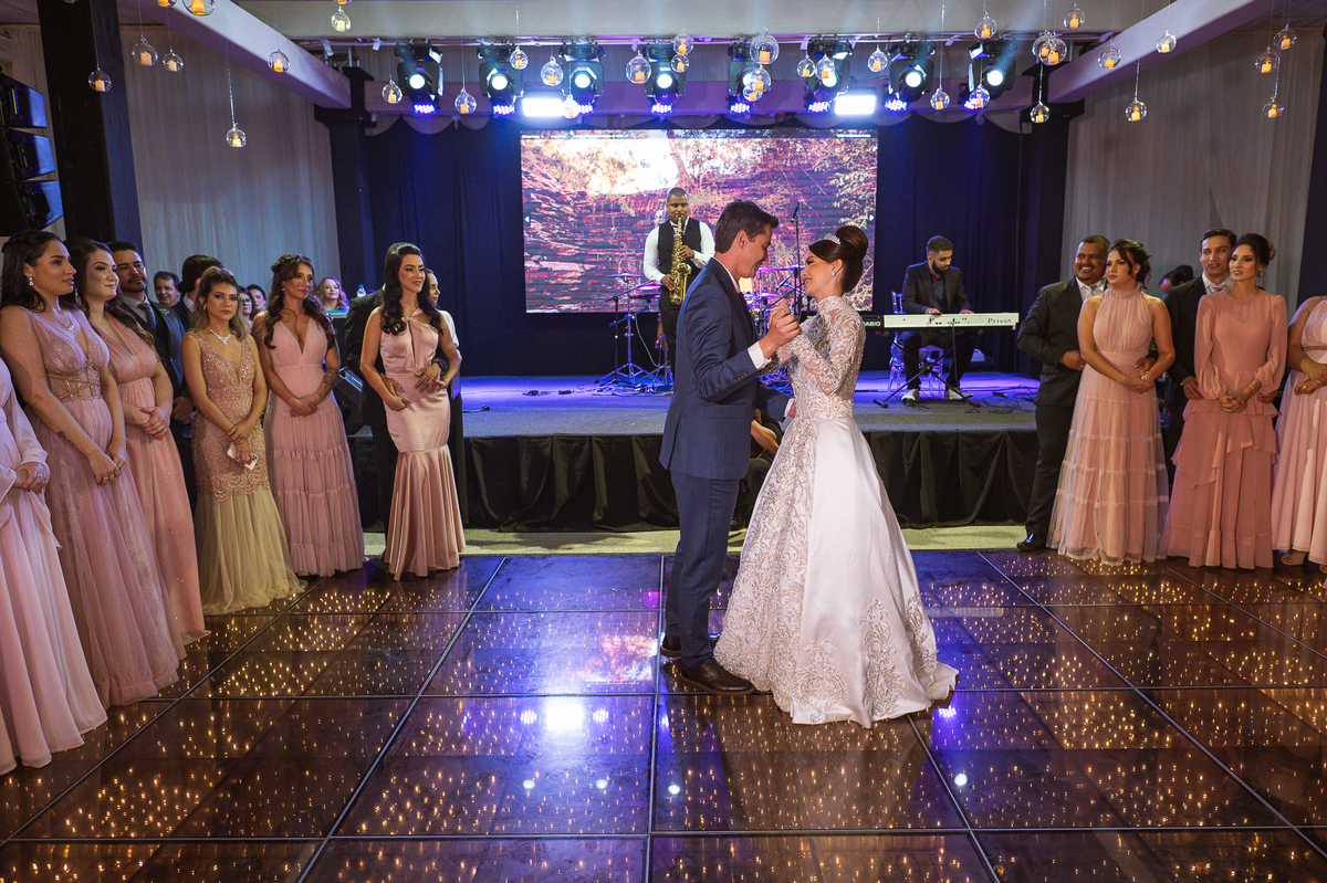 Os noivos escolheram o House Fest para recepcionar seus convidados. Lá chegando, a decoração era de cai o queixo. Neimar Decorações criou um verdadeiro palácio com a ornamentação recheada de flores naturais por todos os lados. Lustres faziam um corredor rumo à pista de dança e o local do bolo mais parecia um cenário de novela. Já na porta, os convidados eram recepcionados pelo grupo Akazu. Os noivos foram recebidos com muita festa, ao som do saxofone que os acompanhou até a pista de dança. Os padrinhos já estavam posicionados aguardando. A primeira dança dos recém-casados aconteceu ali mesmo. Com muita alegria, eles prepararam uma dança toda especial. Após a dança, brindaram com todos os padrinhos e madrinhas.