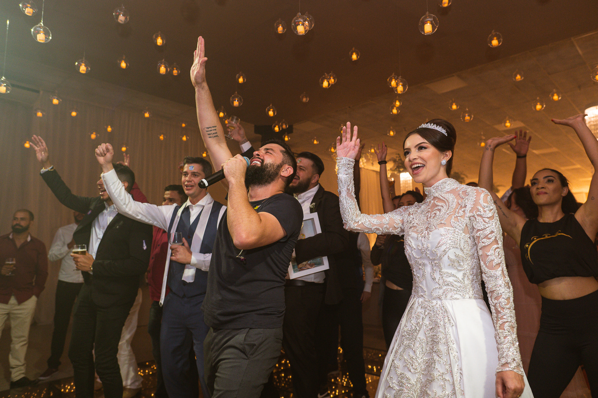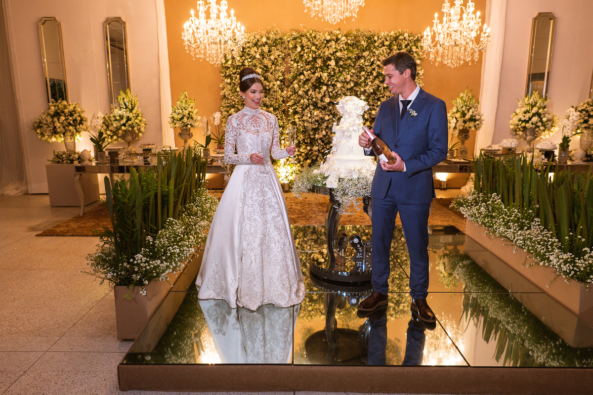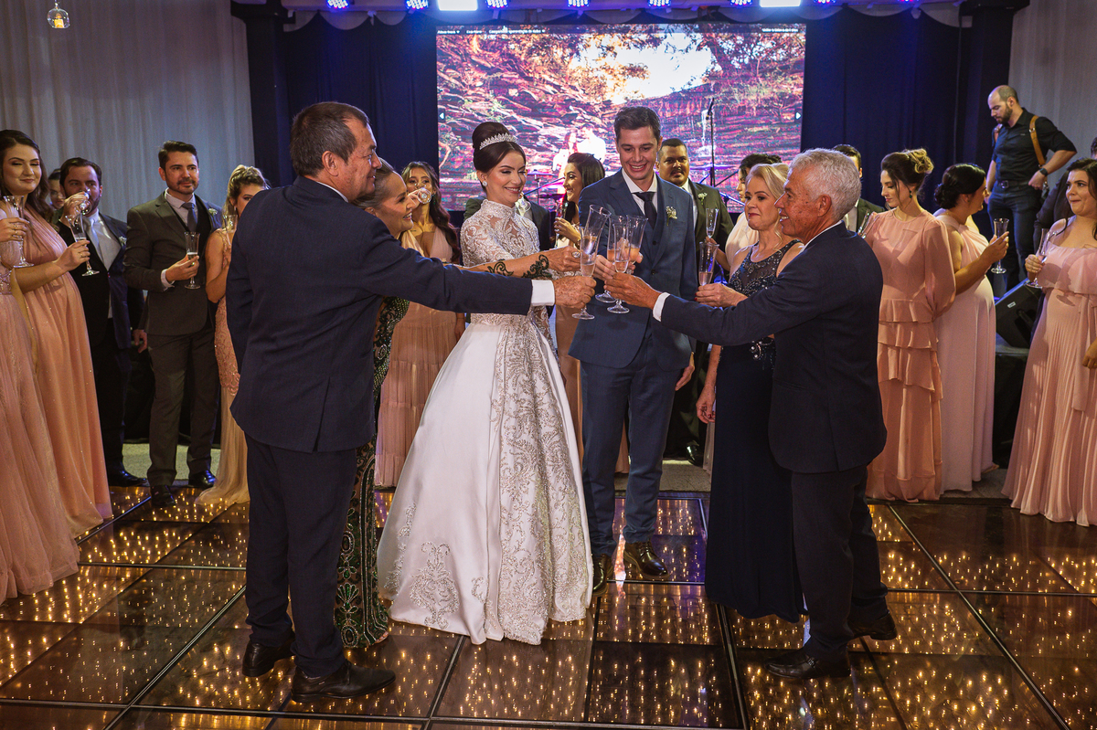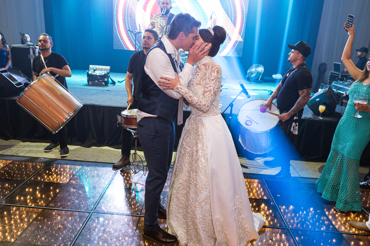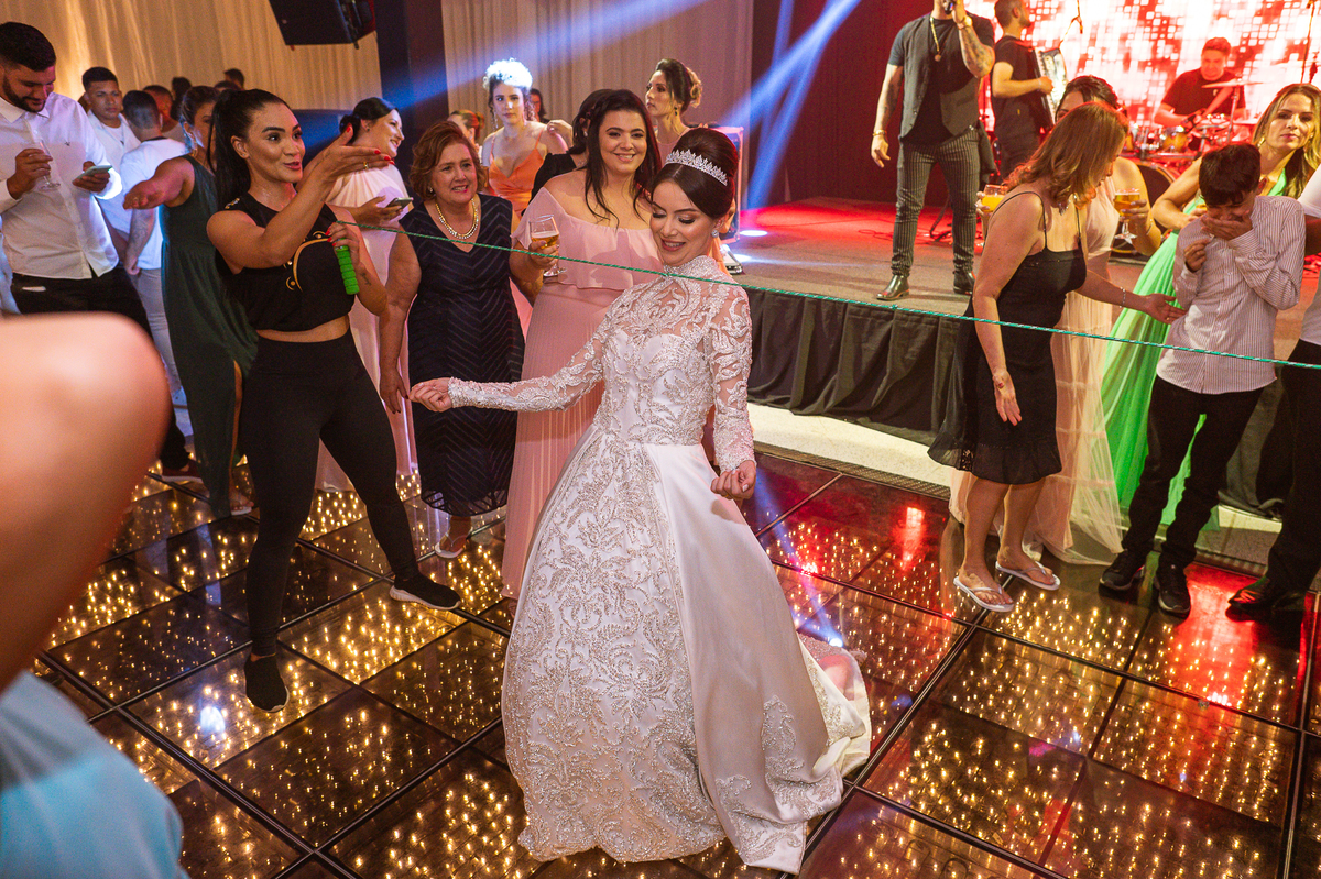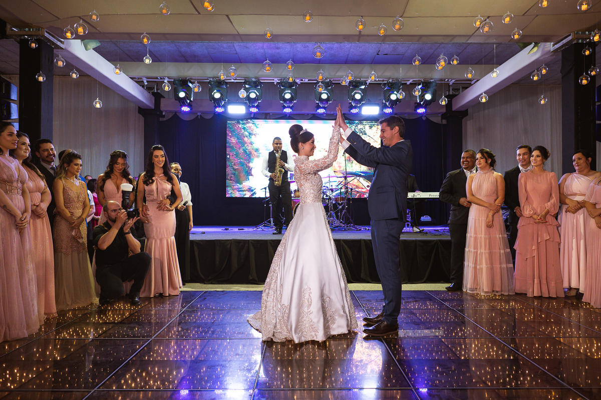 Os noivos escolheram o House Fest para recepcionar seus convidados. Lá chegando, a decoração era de cai o queixo. Neimar Decorações criou um verdadeiro palácio com a ornamentação recheada de flores naturais por todos os lados. Lustres faziam um corredor rumo à pista de dança e o local do bolo mais parecia um cenário de novela. Já na porta, os convidados eram recepcionados pelo grupo Akazu. Os noivos foram recebidos com muita festa, ao som do saxofone que os acompanhou até a pista de dança. Os padrinhos já estavam posicionados aguardando. A primeira dança dos recém-casados aconteceu ali mesmo. Com muita alegria, eles prepararam uma dança toda especial. Após a dança, brindaram com todos os padrinhos e madrinhas.