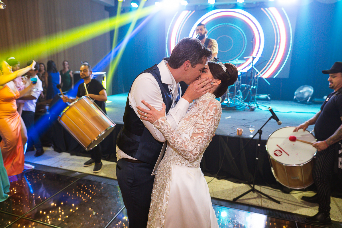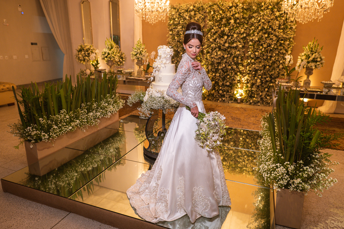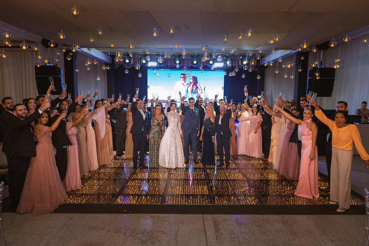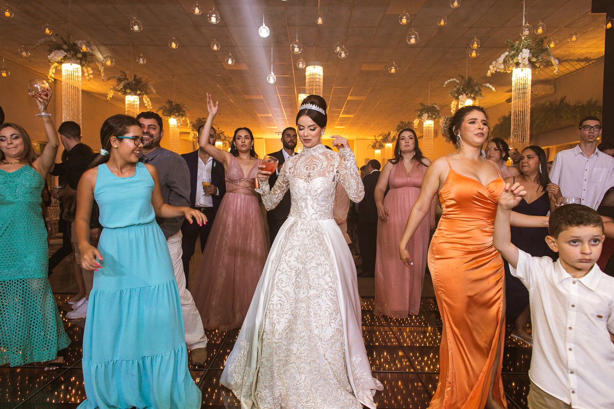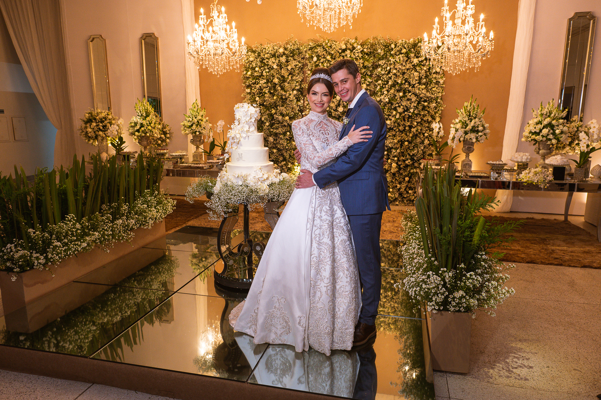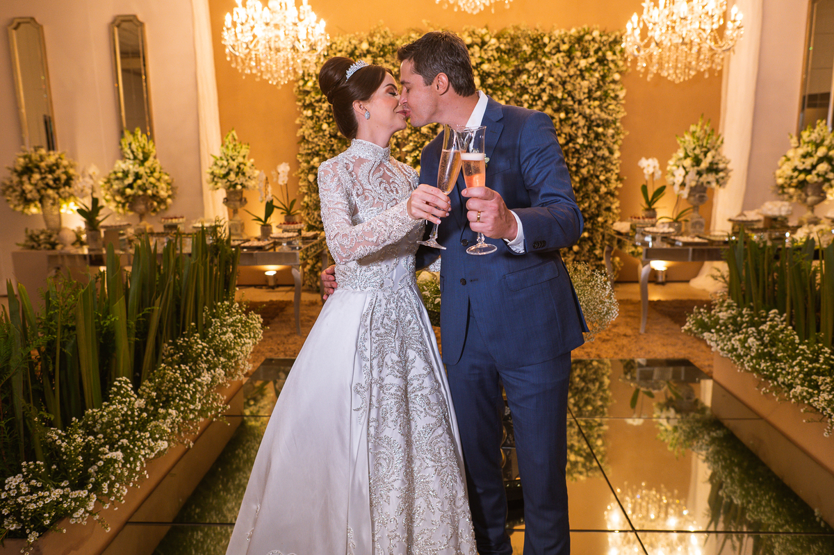 Os noivos escolheram o House Fest para recepcionar seus convidados. Lá chegando, a decoração era de cai o queixo. Neimar Decorações criou um verdadeiro palácio com a ornamentação recheada de flores naturais por todos os lados. Lustres faziam um corredor rumo à pista de dança e o local do bolo mais parecia um cenário de novela. Já na porta, os convidados eram recepcionados pelo grupo Akazu. Os noivos foram recebidos com muita festa, ao som do saxofone que os acompanhou até a pista de dança. Os padrinhos já estavam posicionados aguardando. A primeira dança dos recém-casados aconteceu ali mesmo. Com muita alegria, eles prepararam uma dança toda especial. Após a dança, brindaram com todos os padrinhos e madrinhas.