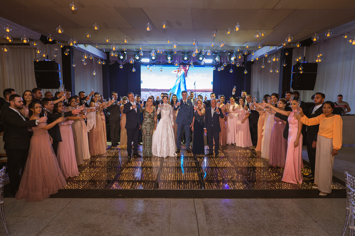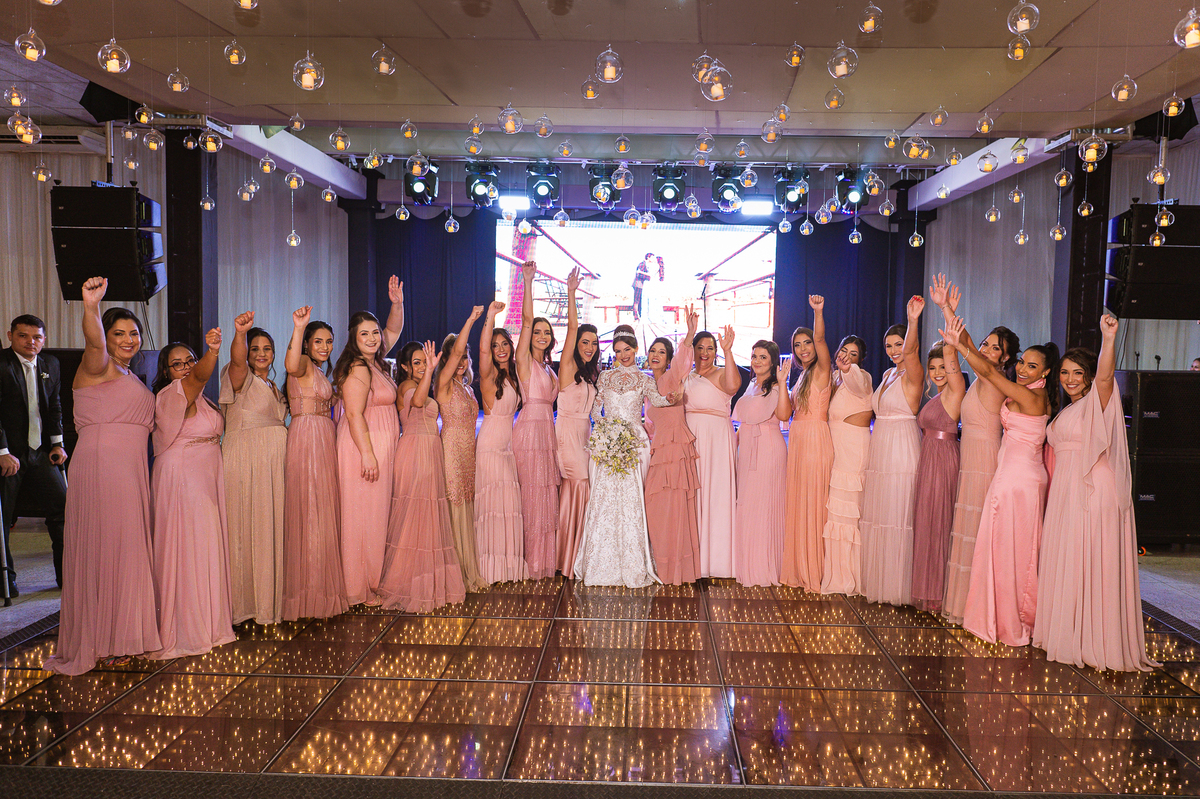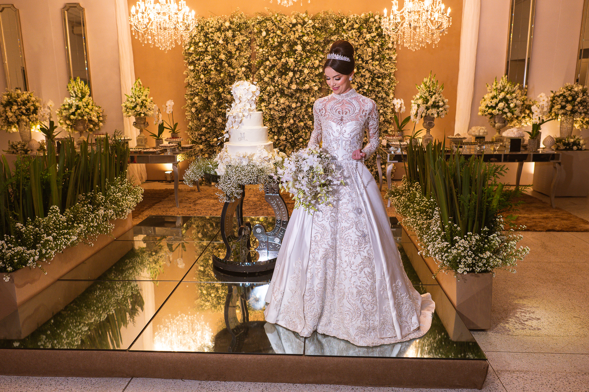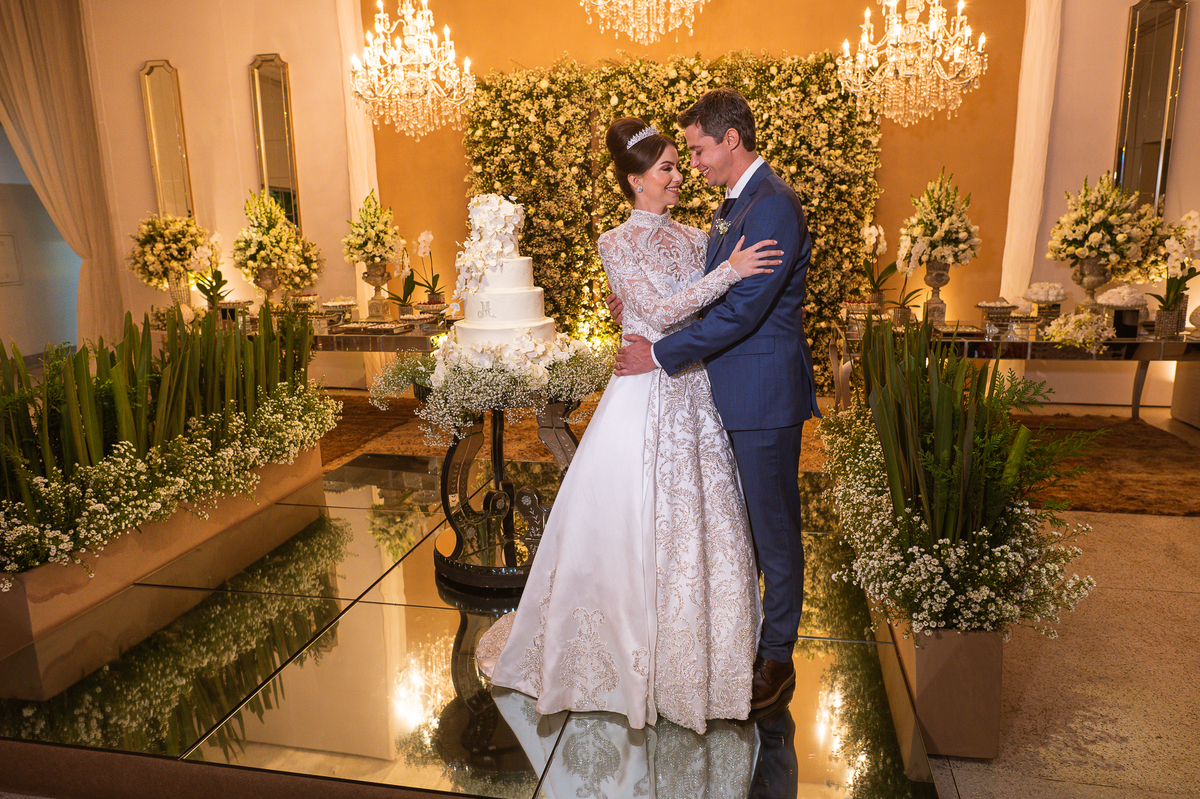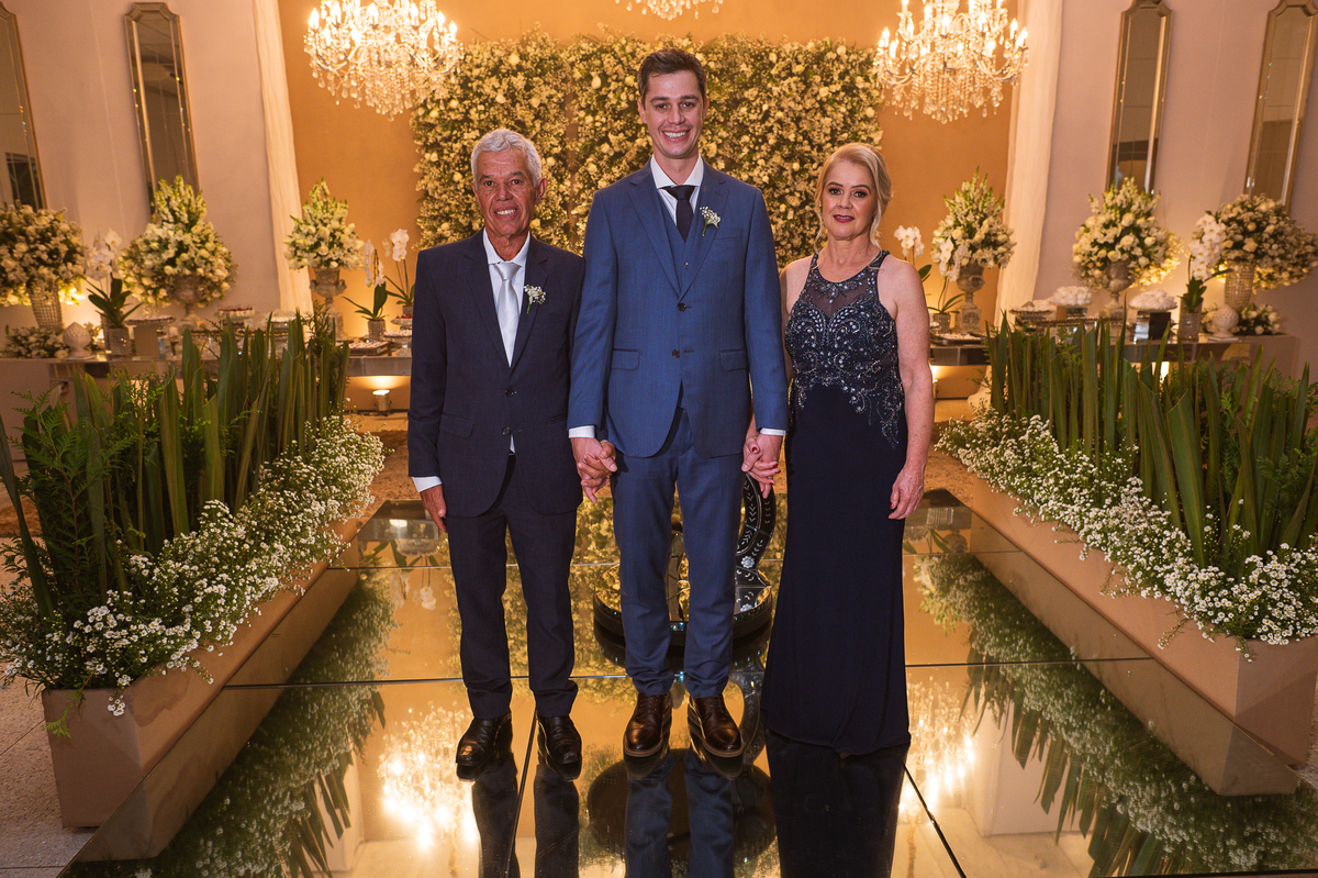 Os noivos escolheram o House Fest para recepcionar seus convidados. Lá chegando, a decoração era de cai o queixo. Neimar Decorações criou um verdadeiro palácio com a ornamentação recheada de flores naturais por todos os lados. Lustres faziam um corredor rumo à pista de dança e o local do bolo mais parecia um cenário de novela. Já na porta, os convidados eram recepcionados pelo grupo Akazu. Os noivos foram recebidos com muita festa, ao som do saxofone que os acompanhou até a pista de dança. Os padrinhos já estavam posicionados aguardando. A primeira dança dos recém-casados aconteceu ali mesmo. Com muita alegria, eles prepararam uma dança toda especial. Após a dança, brindaram com todos os padrinhos e madrinhas.