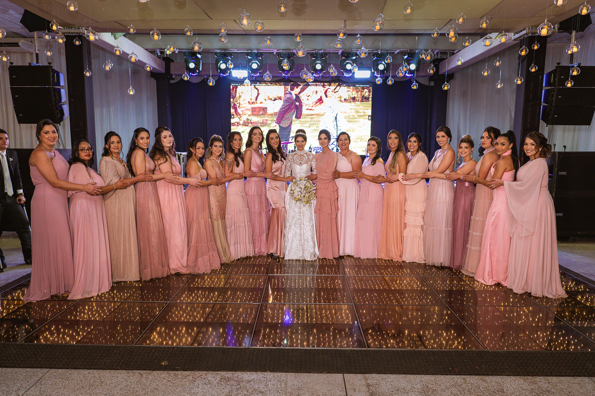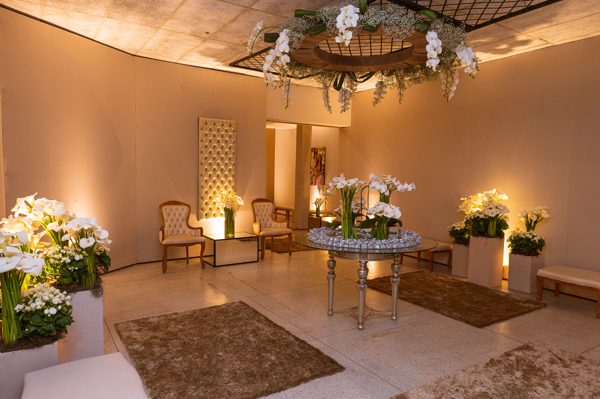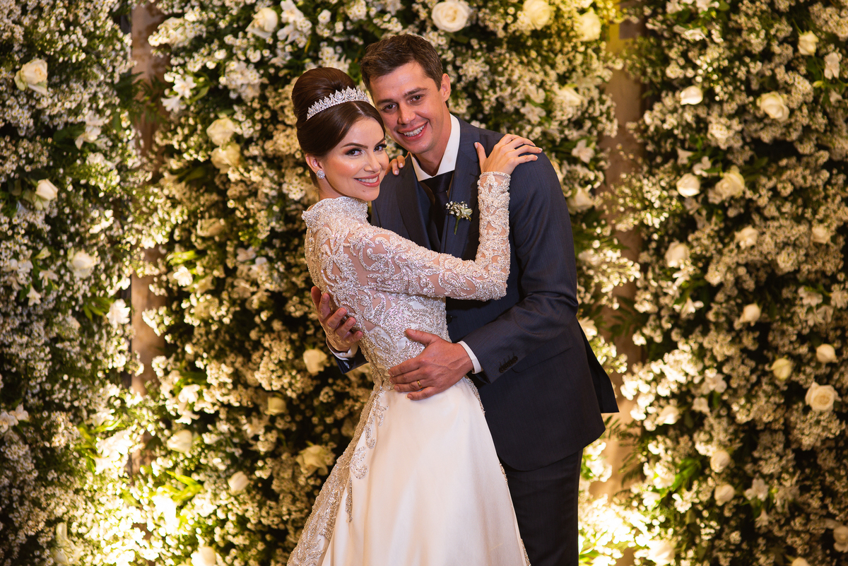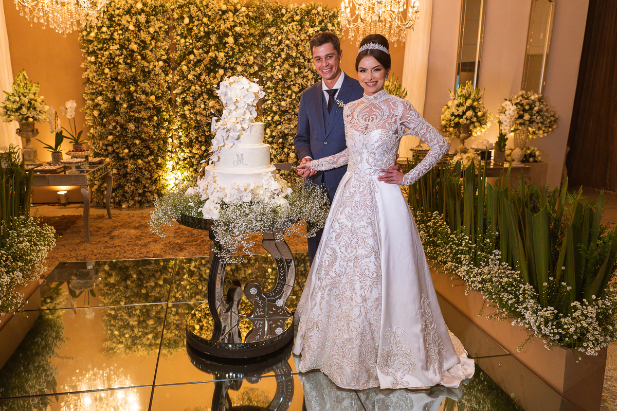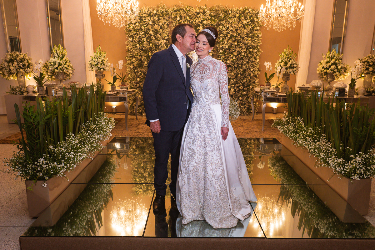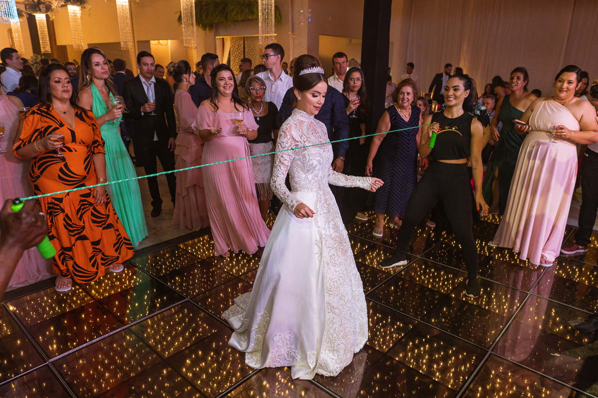 Os noivos escolheram o House Fest para recepcionar seus convidados. Lá chegando, a decoração era de cai o queixo. Neimar Decorações criou um verdadeiro palácio com a ornamentação recheada de flores naturais por todos os lados. Lustres faziam um corredor rumo à pista de dança e o local do bolo mais parecia um cenário de novela. Já na porta, os convidados eram recepcionados pelo grupo Akazu. Os noivos foram recebidos com muita festa, ao som do saxofone que os acompanhou até a pista de dança. Os padrinhos já estavam posicionados aguardando. A primeira dança dos recém-casados aconteceu ali mesmo. Com muita alegria, eles prepararam uma dança toda especial. Após a dança, brindaram com todos os padrinhos e madrinhas.