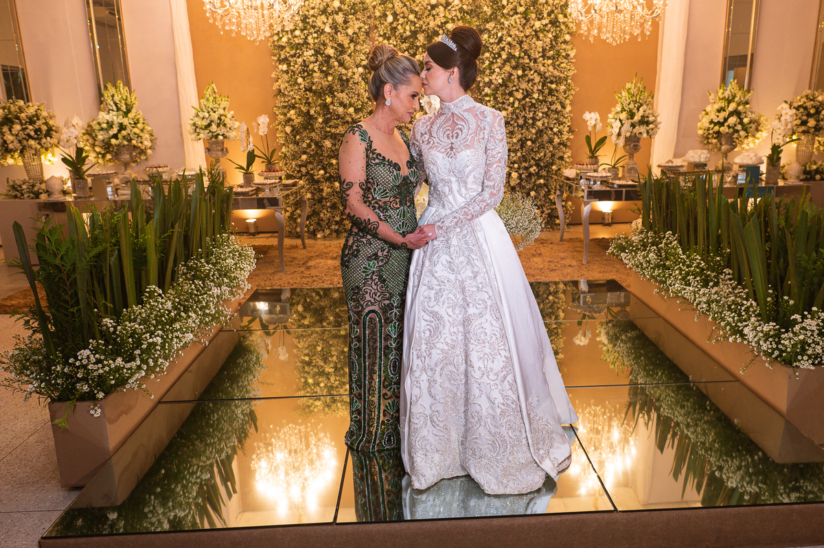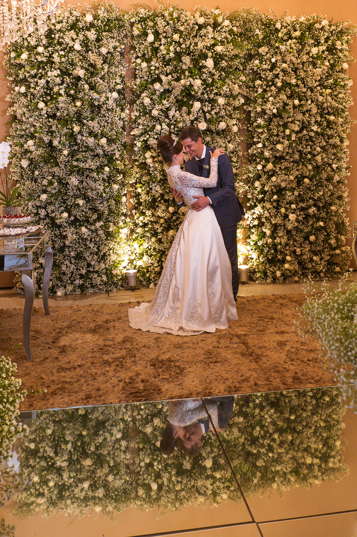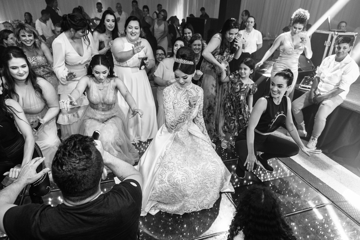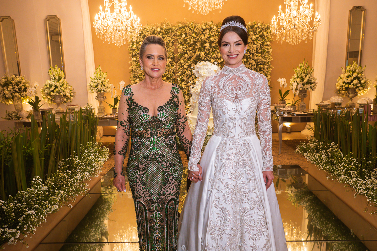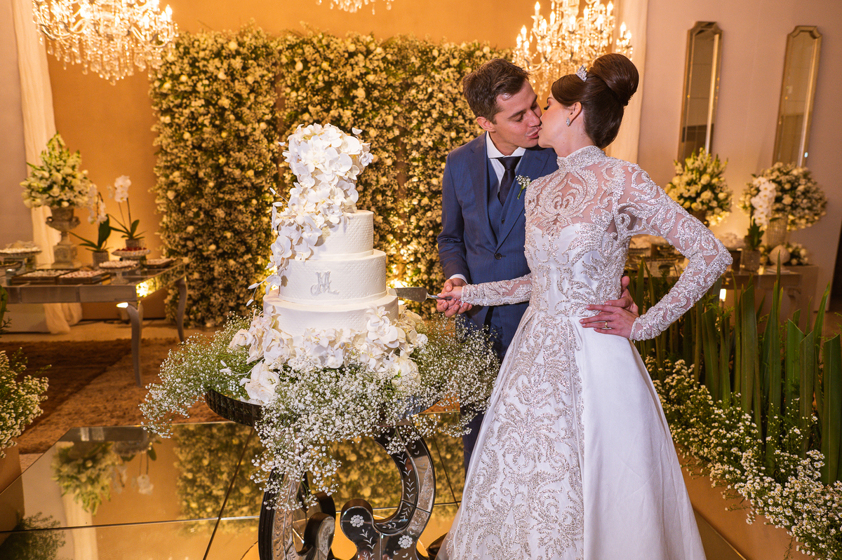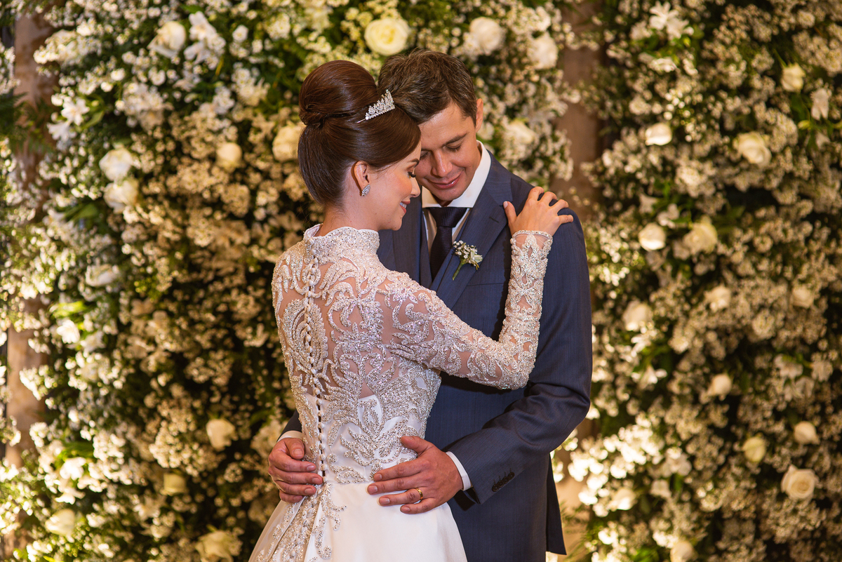 Os noivos escolheram o House Fest para recepcionar seus convidados. Lá chegando, a decoração era de cai o queixo. Neimar Decorações criou um verdadeiro palácio com a ornamentação recheada de flores naturais por todos os lados. Lustres faziam um corredor rumo à pista de dança e o local do bolo mais parecia um cenário de novela. Já na porta, os convidados eram recepcionados pelo grupo Akazu. Os noivos foram recebidos com muita festa, ao som do saxofone que os acompanhou até a pista de dança. Os padrinhos já estavam posicionados aguardando. A primeira dança dos recém-casados aconteceu ali mesmo. Com muita alegria, eles prepararam uma dança toda especial. Após a dança, brindaram com todos os padrinhos e madrinhas.