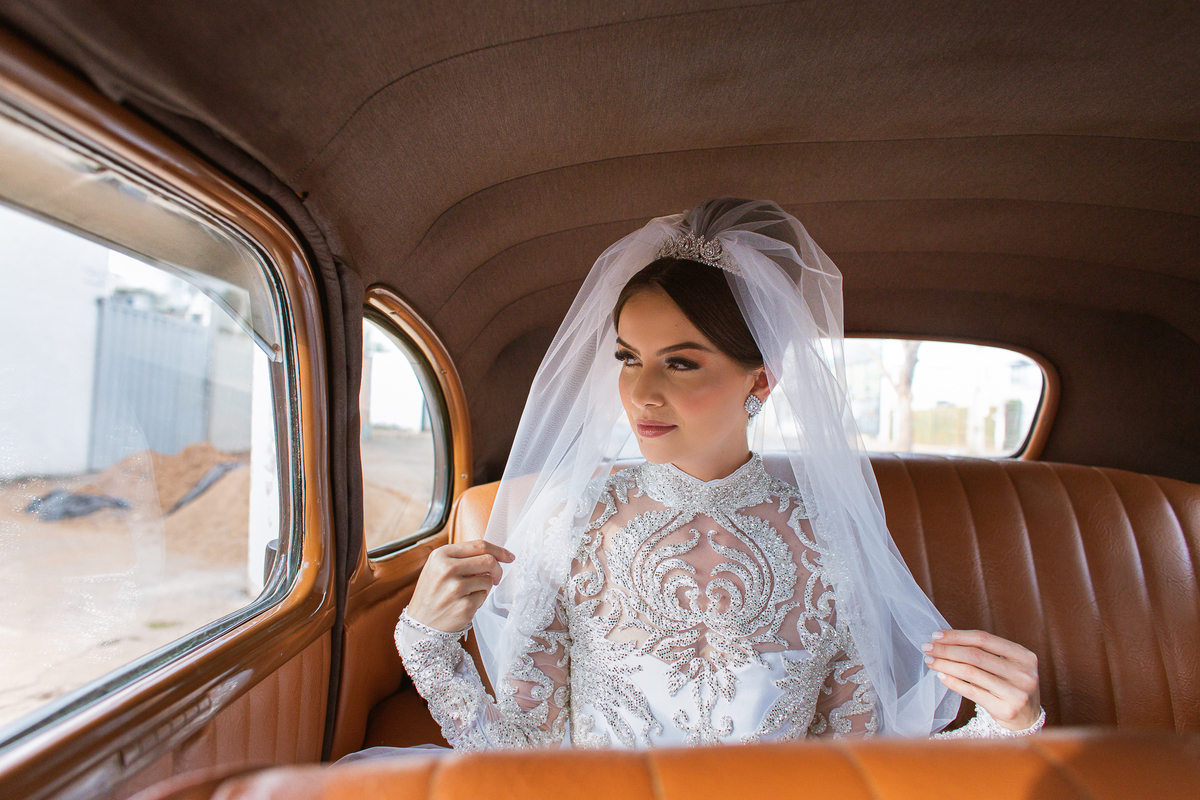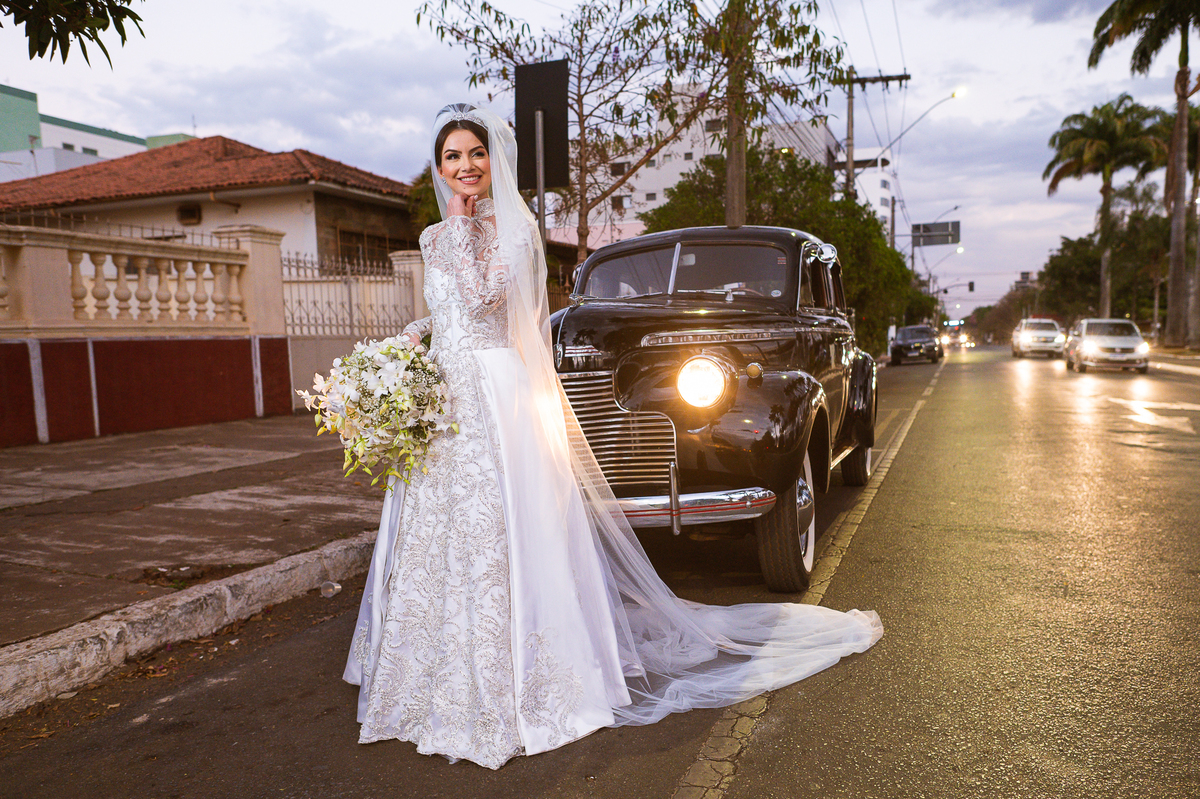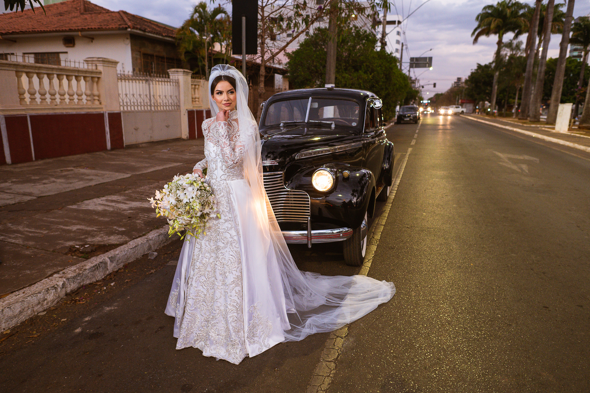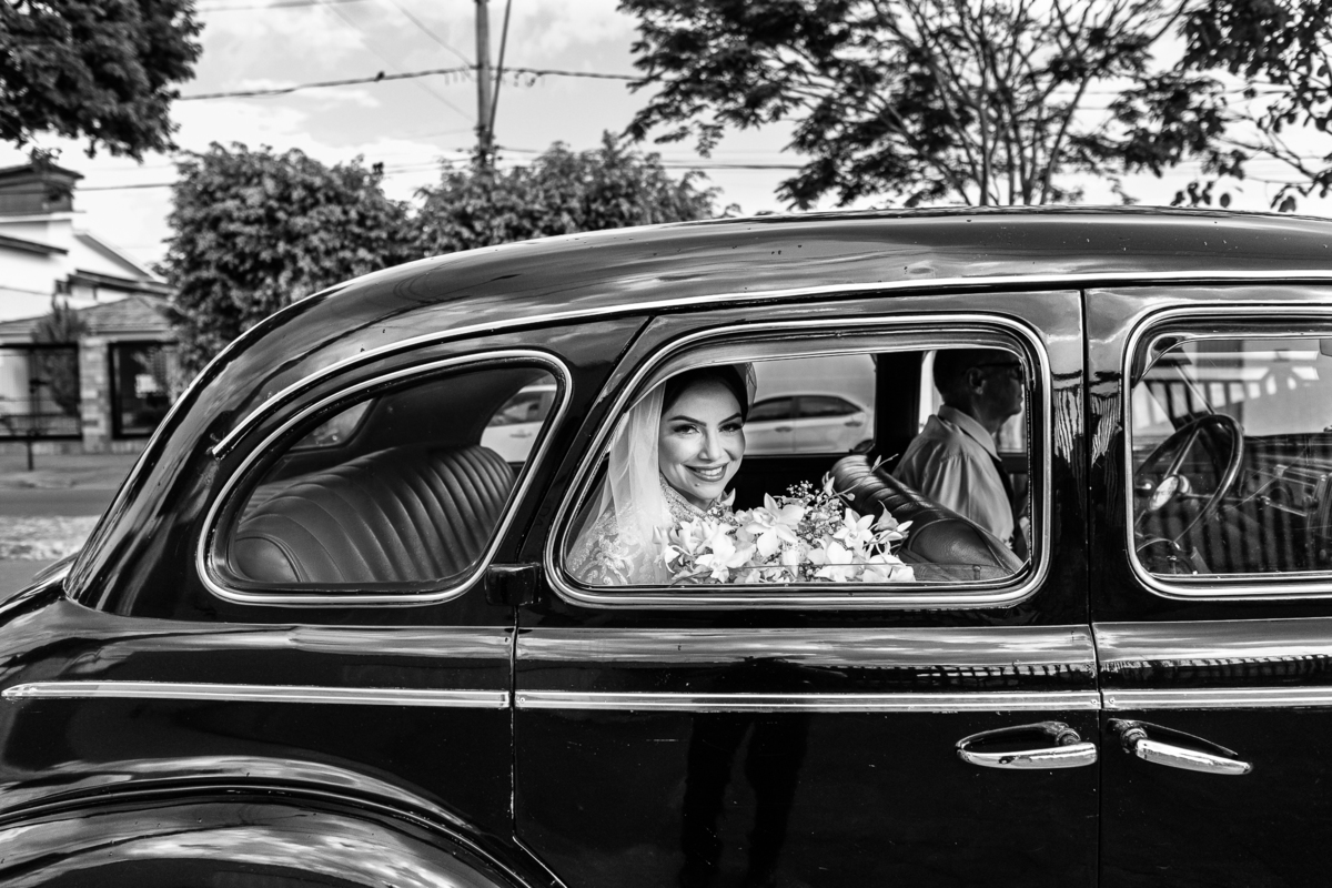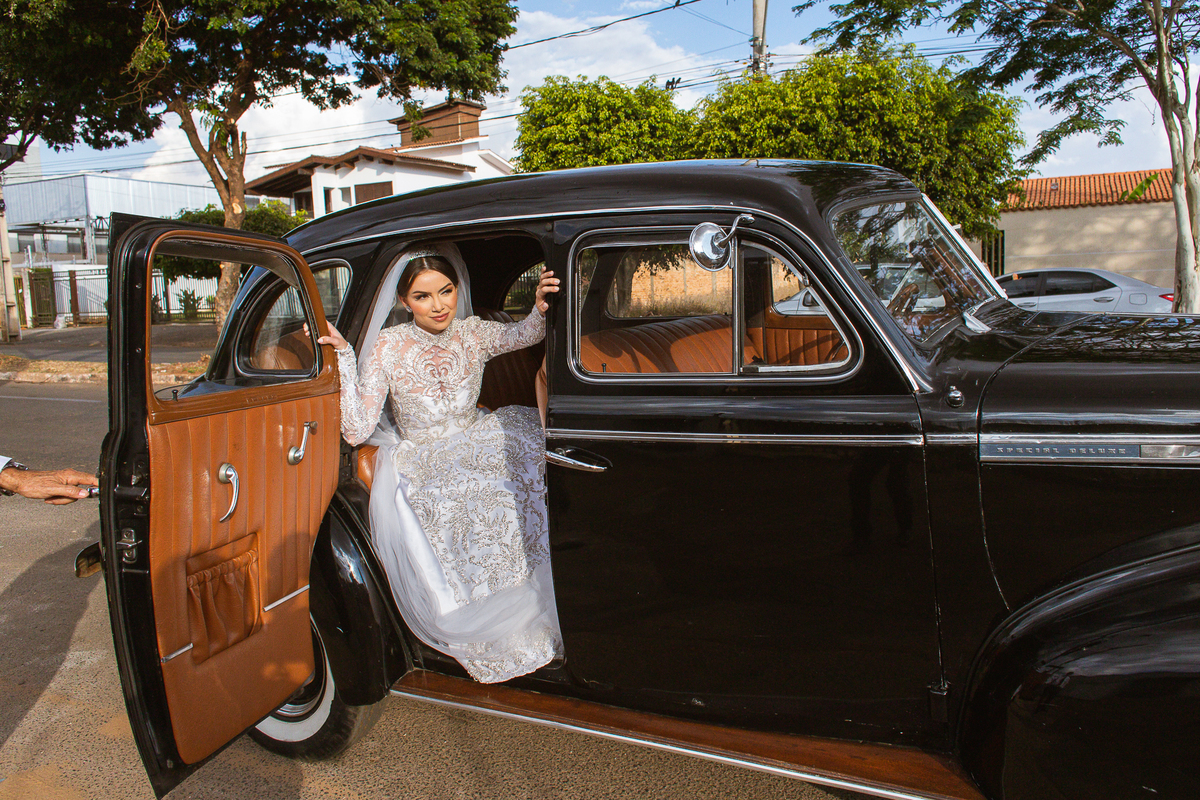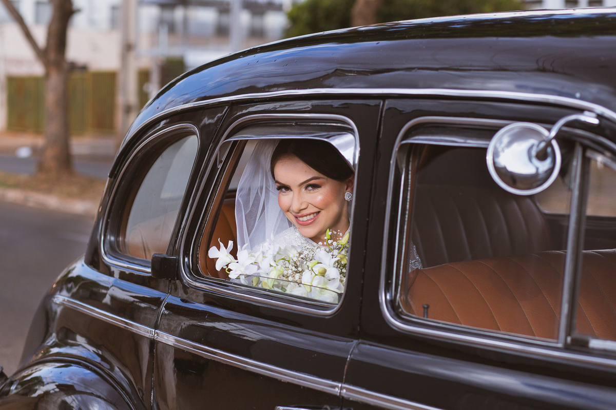 Ariella estava com a make e o penteados prontos, faltava apenas o vestido. Quando me chamaram para finalizar as fotos, fiquei emocionado com tanta beleza. Nós que acompanhamos os noivos desde os primeiros passos do casamento, aquele momento ali é muito especial. Ver todo o processo sendo finalizado e a noiva ali prontinha e maravilhosa é tocante. Fizemos o ensaio final e partimos para a Igreja. Do lado de fora do salão, um Chevrolet 1940 já esperava a noiva. Eles desfilaram pela cidade até a Igreja dos Capuchinhos e por onde passaram chamaram a atenção de todos que olhavam e admiravam a beleza do carro e também da noiva.