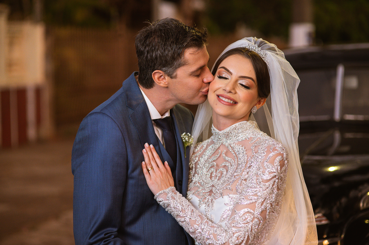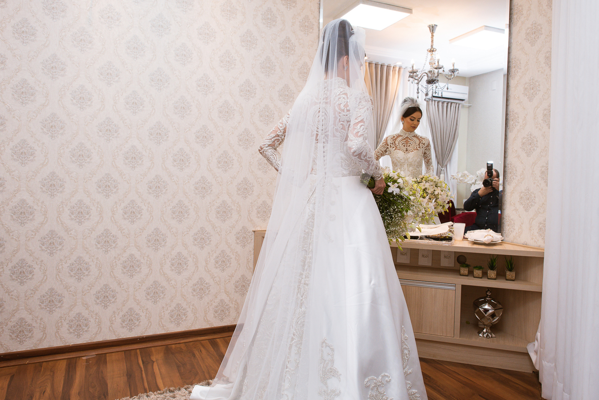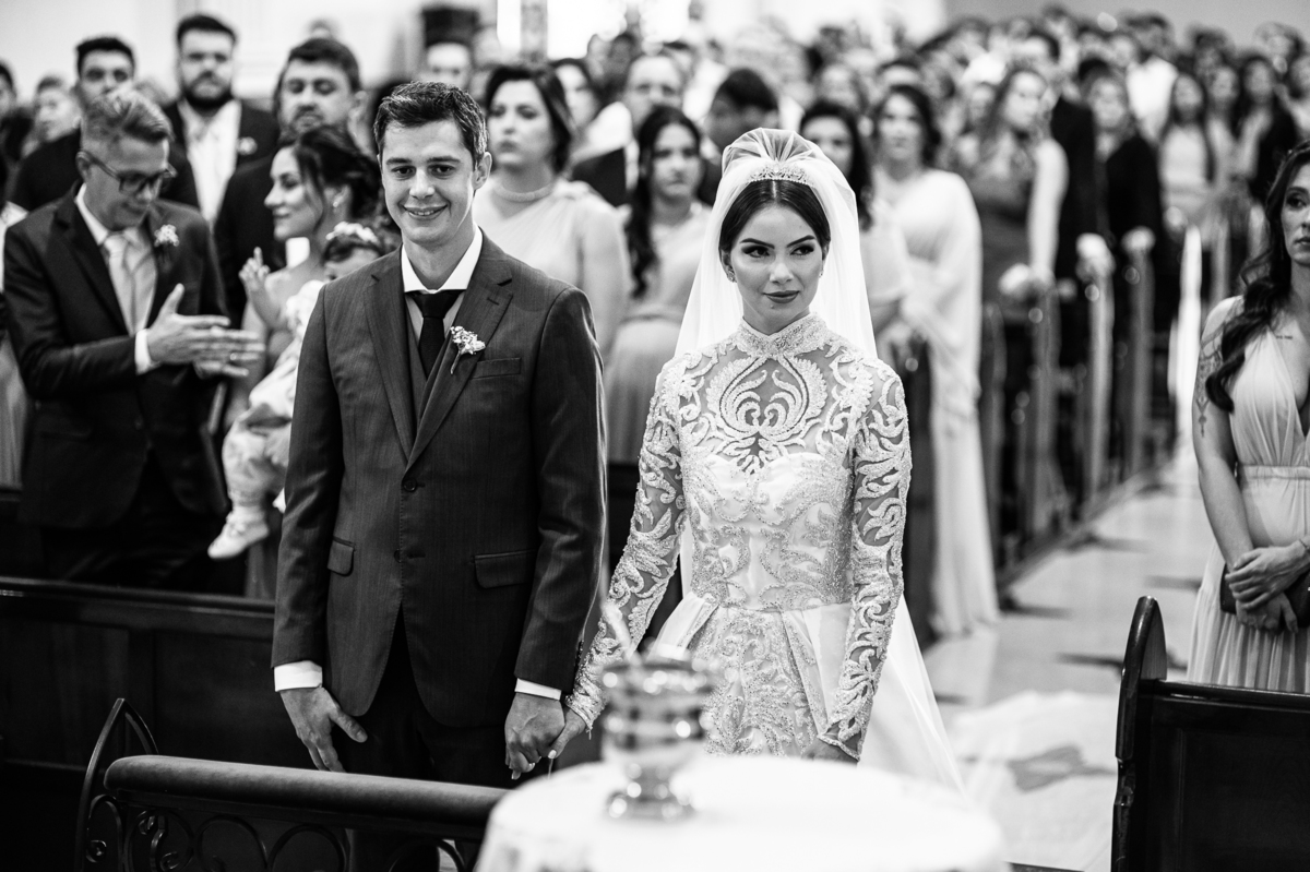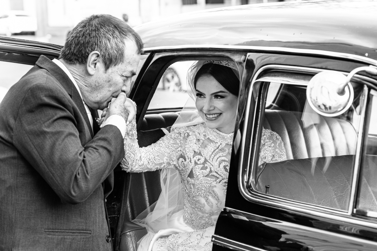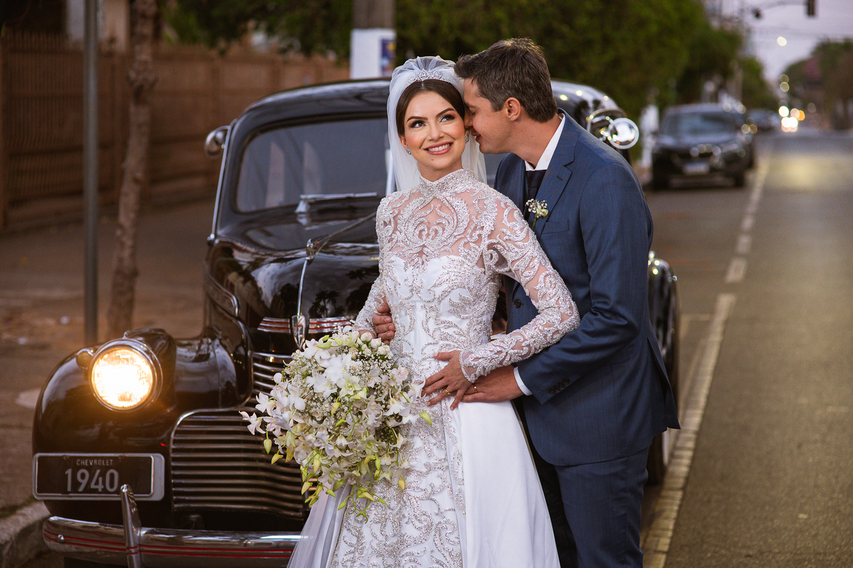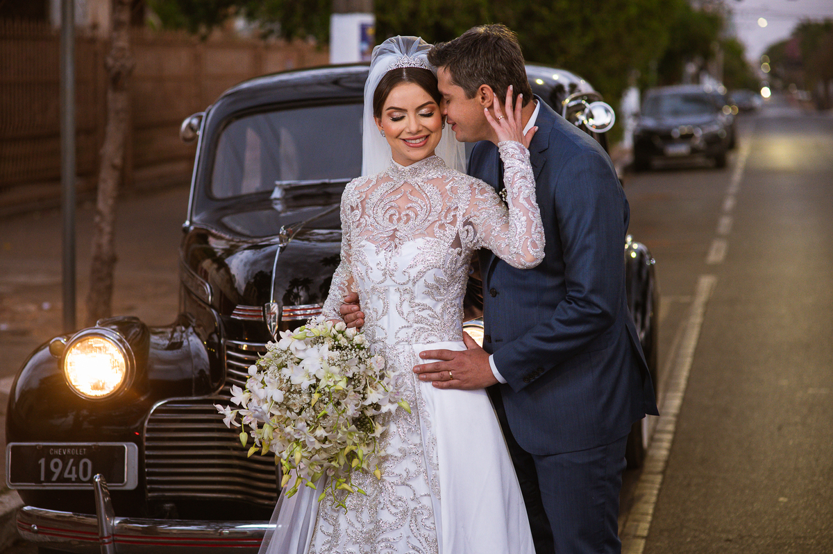 Ariella estava com a make e o penteados prontos, faltava apenas o vestido. Quando me chamaram para finalizar as fotos, fiquei emocionado com tanta beleza. Nós que acompanhamos os noivos desde os primeiros passos do casamento, aquele momento ali é muito especial. Ver todo o processo sendo finalizado e a noiva ali prontinha e maravilhosa é tocante. Fizemos o ensaio final e partimos para a Igreja. Do lado de fora do salão, um Chevrolet 1940 já esperava a noiva. Eles desfilaram pela cidade até a Igreja dos Capuchinhos e por onde passaram chamaram a atenção de todos que olhavam e admiravam a beleza do carro e também da noiva.