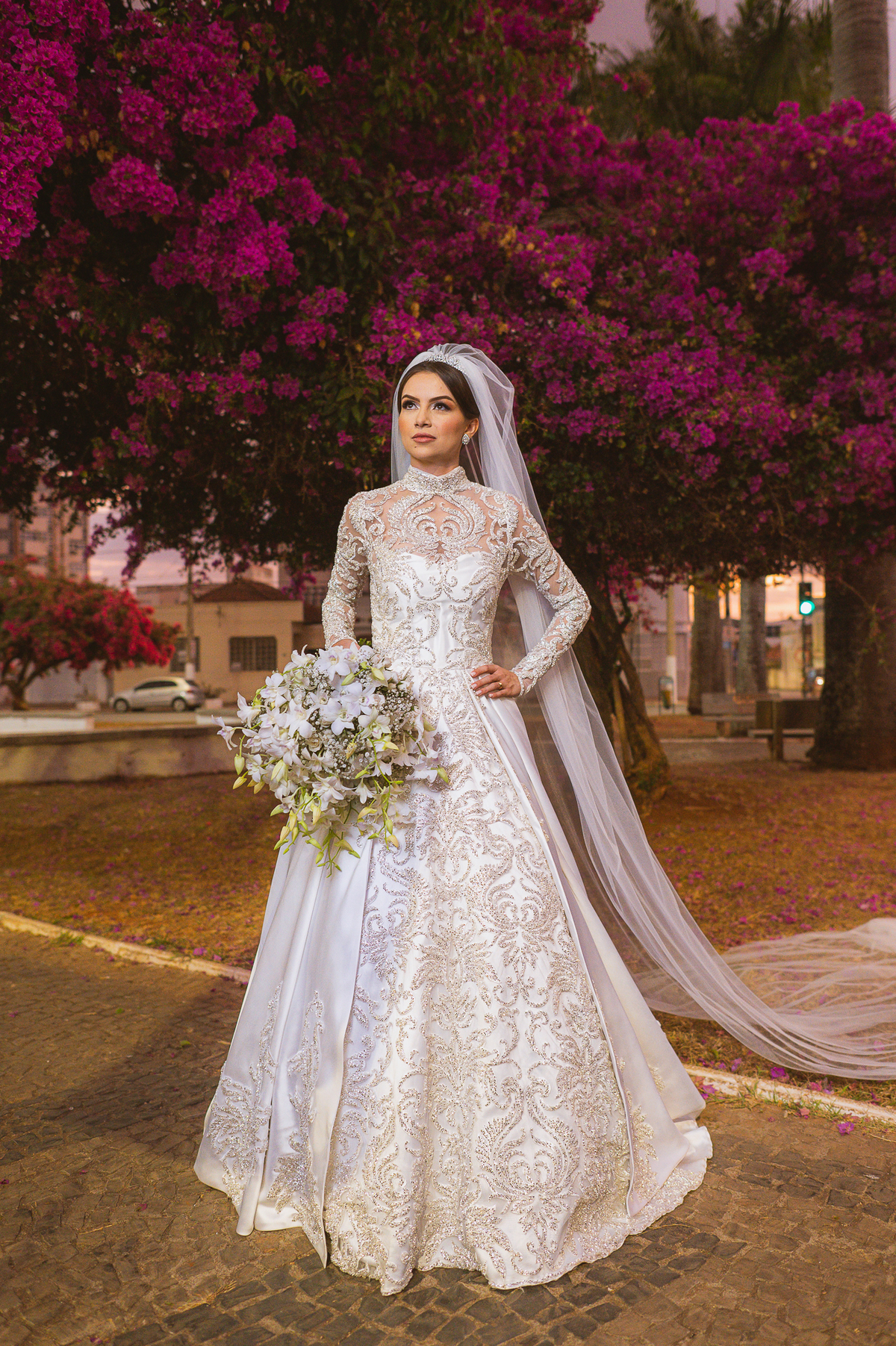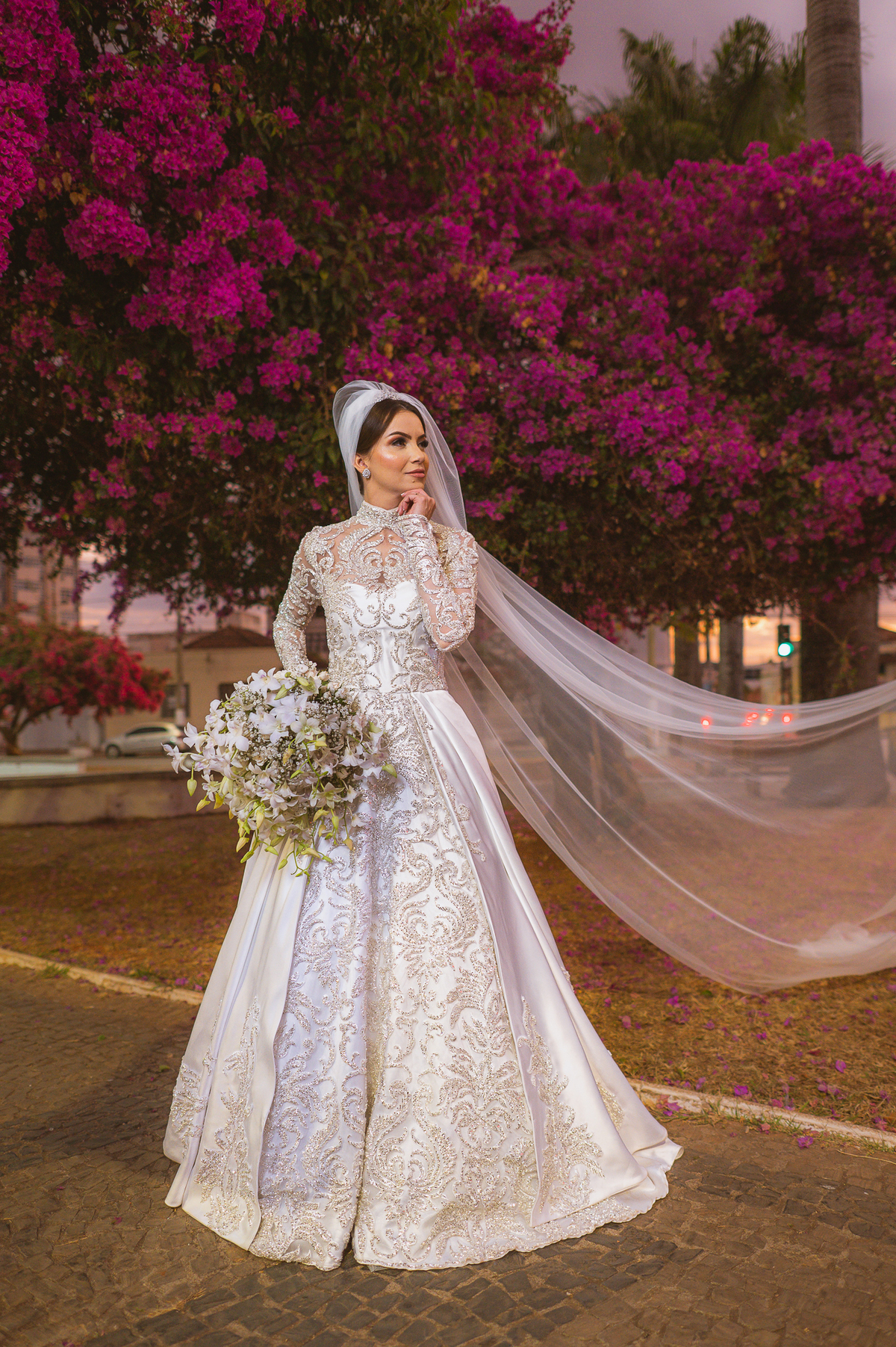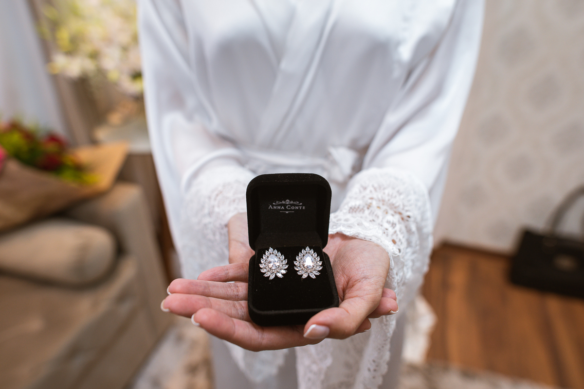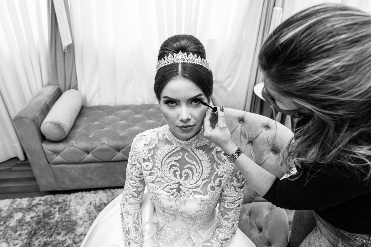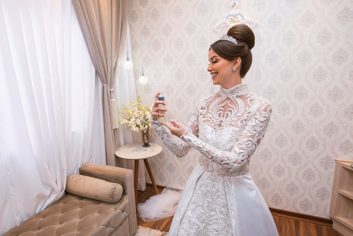Ariella estava com a make e o penteados prontos, faltava apenas o vestido. Quando me chamaram para finalizar as fotos, fiquei emocionado com tanta beleza. Nós que acompanhamos os noivos desde os primeiros passos do casamento, aquele momento ali é muito especial. Ver todo o processo sendo finalizado e a noiva ali prontinha e maravilhosa é tocante. Fizemos o ensaio final e partimos para a Igreja. Do lado de fora do salão, um Chevrolet 1940 já esperava a noiva. Eles desfilaram pela cidade até a Igreja dos Capuchinhos e por onde passaram chamaram a atenção de todos que olhavam e admiravam a beleza do carro e também da noiva.