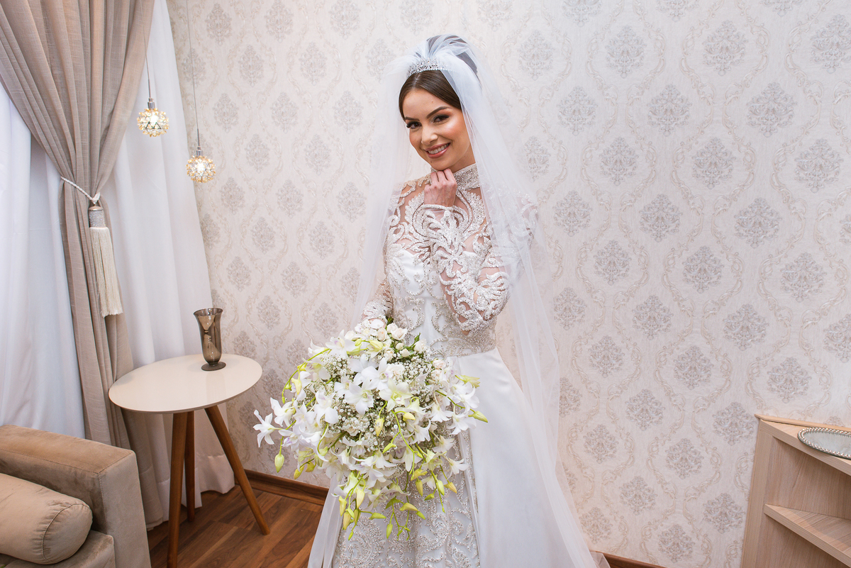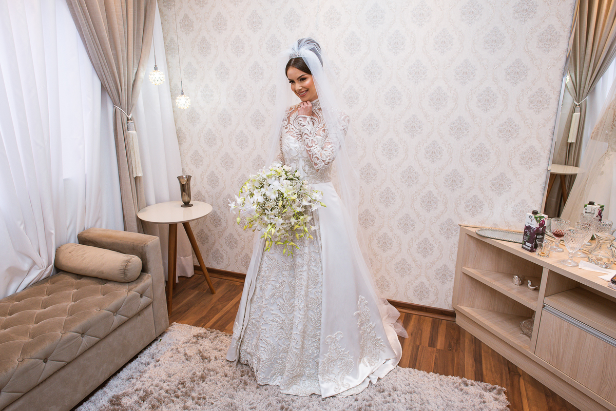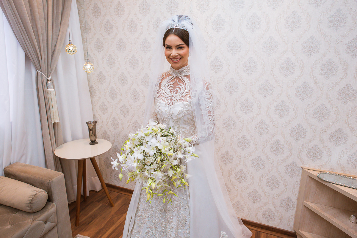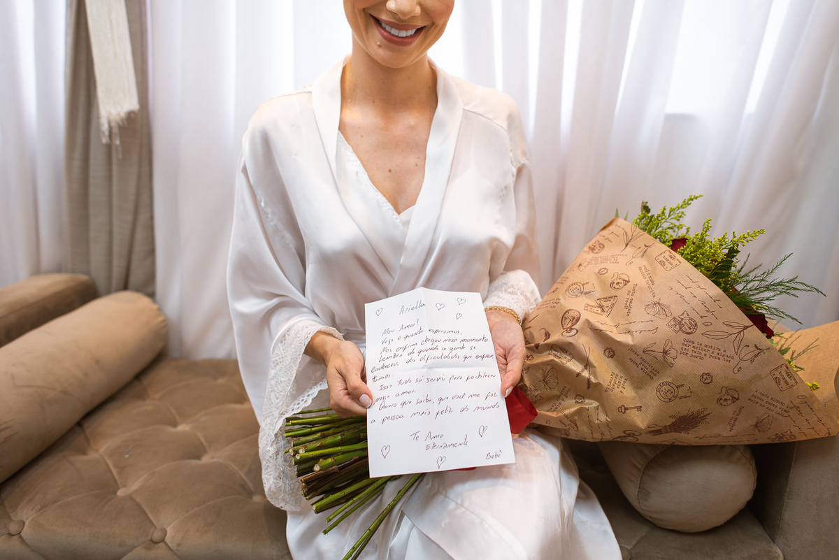 As madrinhas estavam loucas para ver o vestido mas a mamãe da noiva fez suspense sobre ele e elas só puderam conferir toda a beleza da noiva na entrada da cerimônia. Ariella recebeu um lindo buquê de rosas que a fez sorrir e se emocionar muito. Ao ler o cartão, as lágrimas foram inevitáveis. Depois das flores enviadas pelo noivo, foi a vez de receber o próprio buquê que ela carregaria durante sua caminhada. E foi outra surpresa linda! Os olhinhos até brilharam! Depois, as madrinhas se reuniram para juntas brindar com a noiva. Elas se divertiram muito e brindaram comemorando aquele momento super especial. A mãe da noiva até tentou falar algo pra ela, mas a voz embargada quase a impediu de falar. Com um forte abraço, Ariella agradeceu as palavras e o carinho de sua mãe.