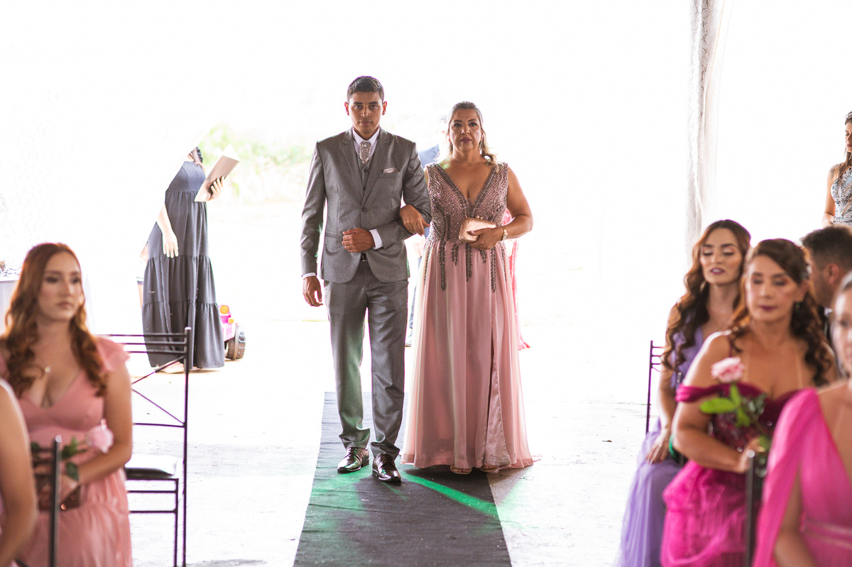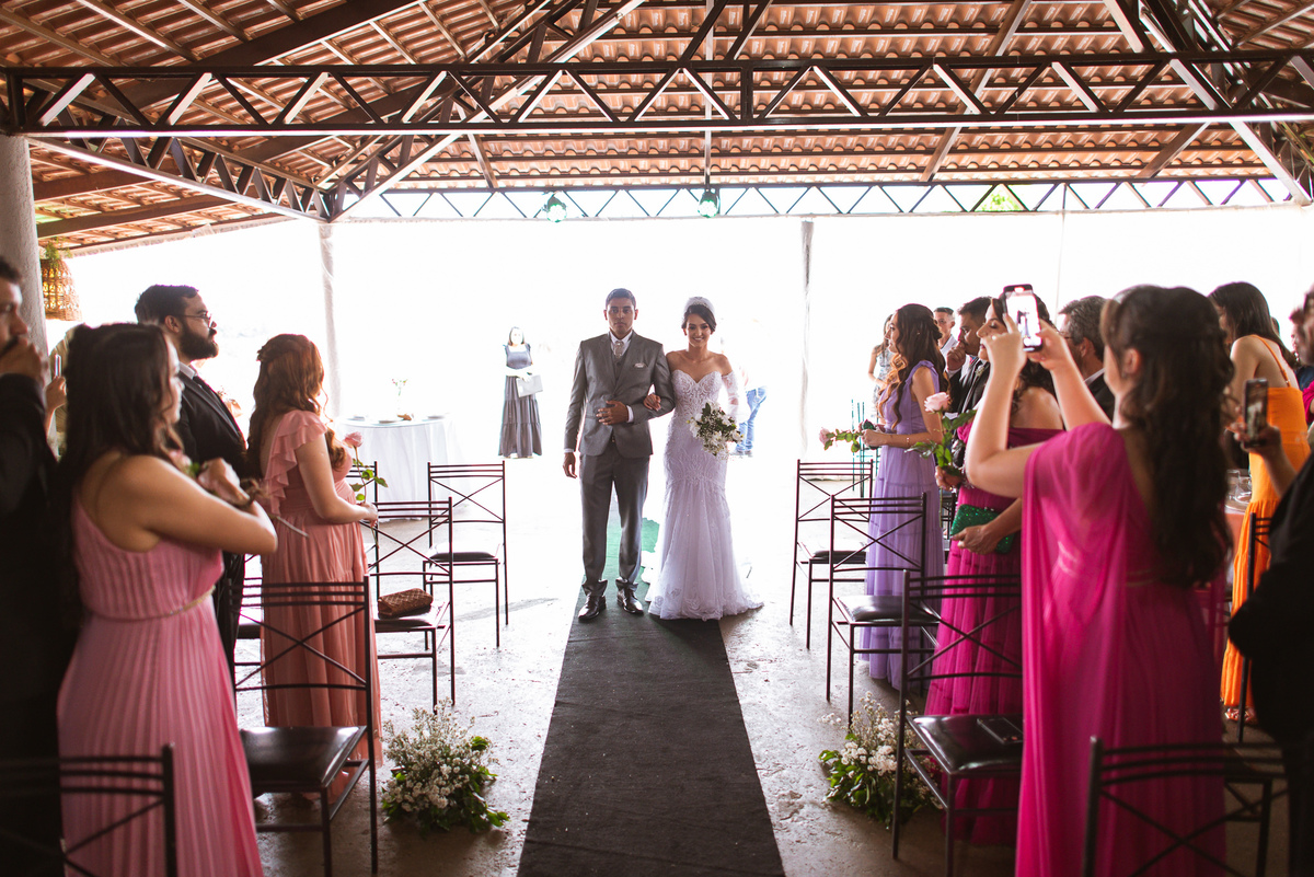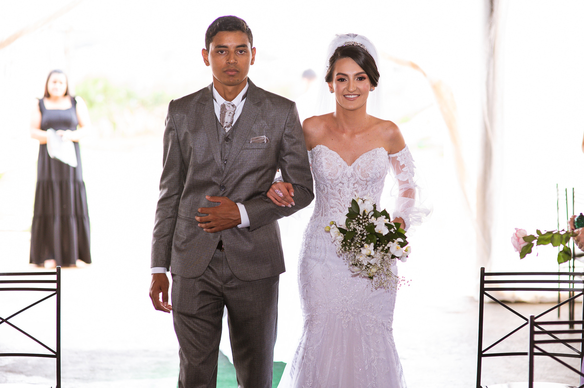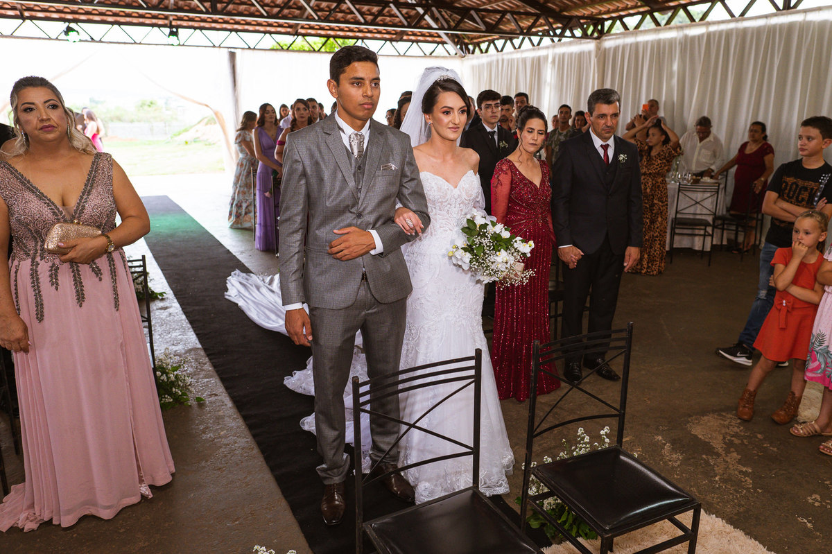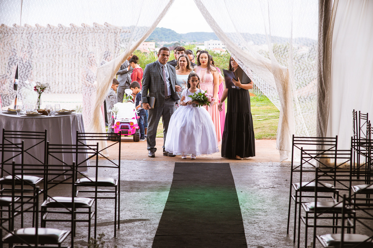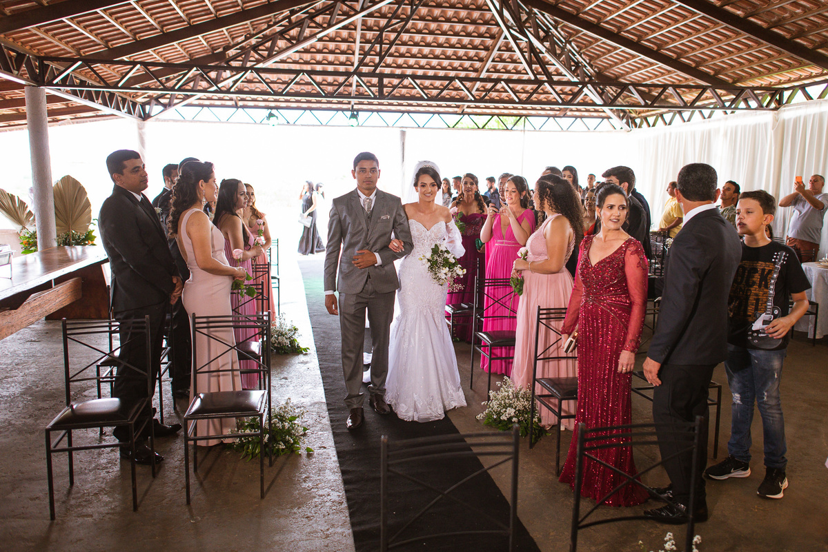 Os convidados estavam todos preparados e a fila dos padrinhos organizada. O céu estava maravilhoso e a tarde dizia que tudo seria perfeito. Camila chegou no local, fizemos algumas fotos tradicionais ali no carro e fomos para a cerimônia. Weverson já estava apostos, aguardando o início também. Os músicos estavam preparados e a celebração teve seu início assim que o Pastor celebrante fez sua entrada juntamente com sua esposa. Os padrinhos entraram logo após e fizeram seu desfile. Logo após foi a vez de Weverson adentrar. Sorridente e de braços dados com sua mãe, o noivo caminhou até o altar e ali ficou aguardando finalmente a entrada de sua futura esposa.