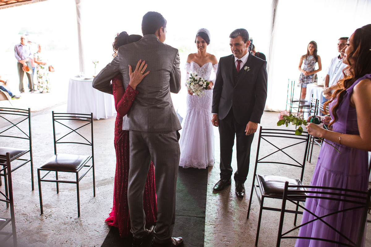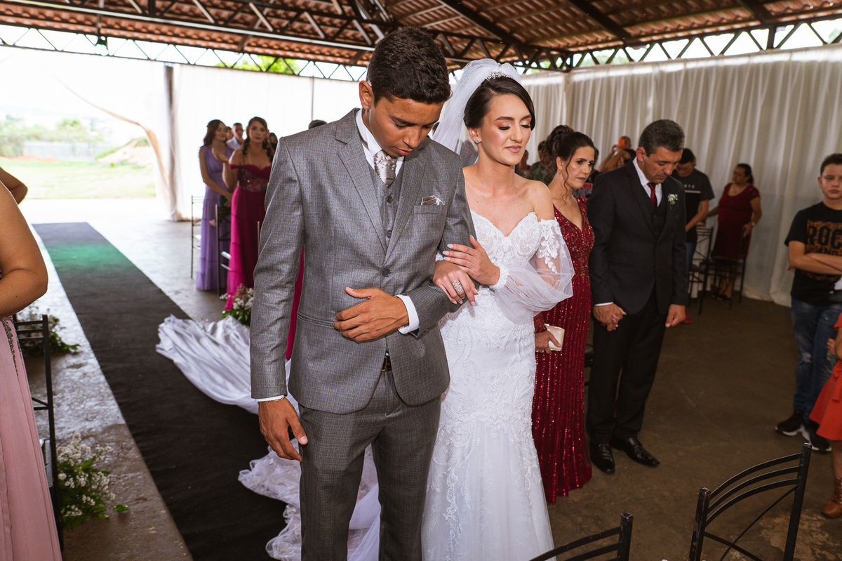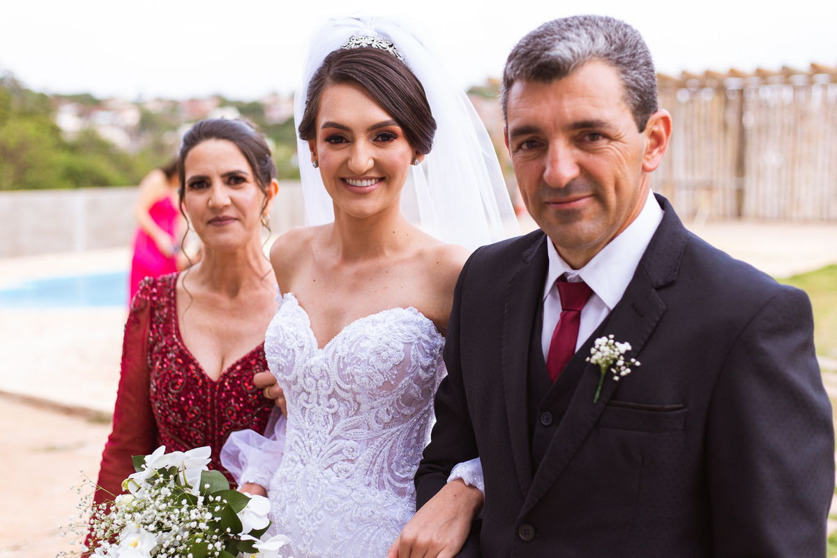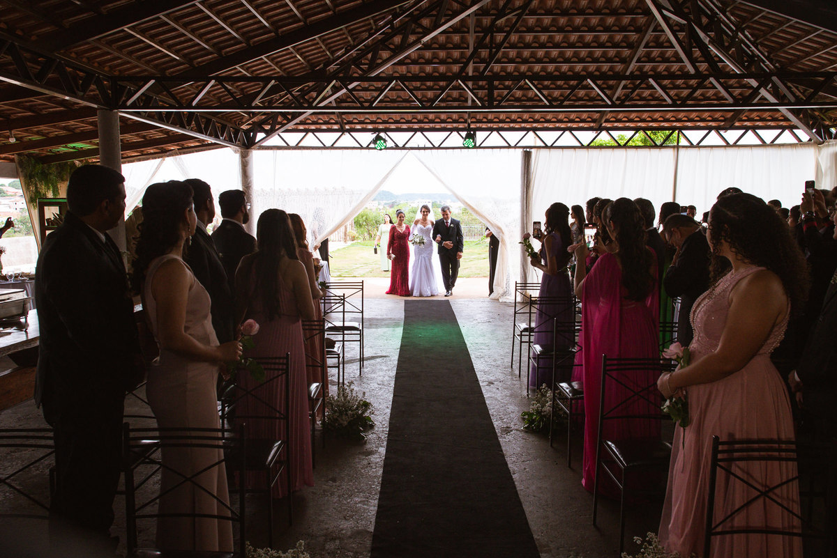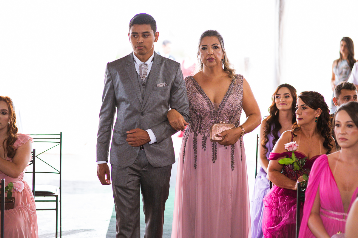 Os convidados estavam todos preparados e a fila dos padrinhos organizada. O céu estava maravilhoso e a tarde dizia que tudo seria perfeito. Camila chegou no local, fizemos algumas fotos tradicionais ali no carro e fomos para a cerimônia. Weverson já estava apostos, aguardando o início também. Os músicos estavam preparados e a celebração teve seu início assim que o Pastor celebrante fez sua entrada juntamente com sua esposa. Os padrinhos entraram logo após e fizeram seu desfile. Logo após foi a vez de Weverson adentrar. Sorridente e de braços dados com sua mãe, o noivo caminhou até o altar e ali ficou aguardando finalmente a entrada de sua futura esposa.