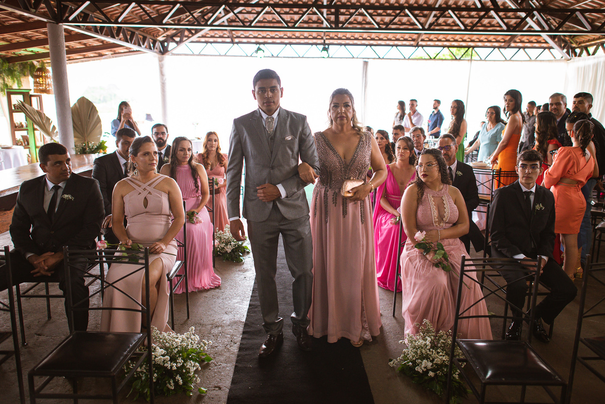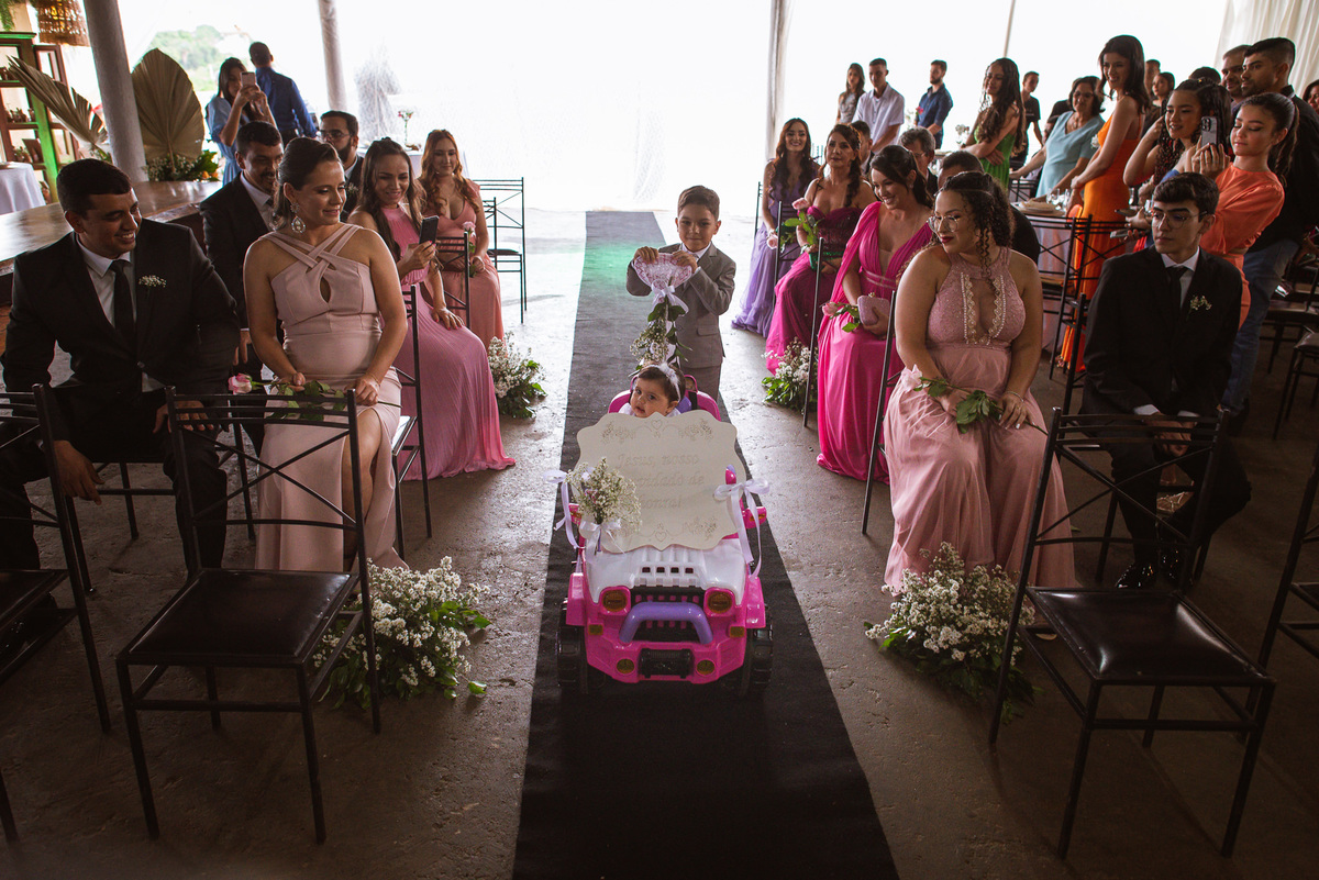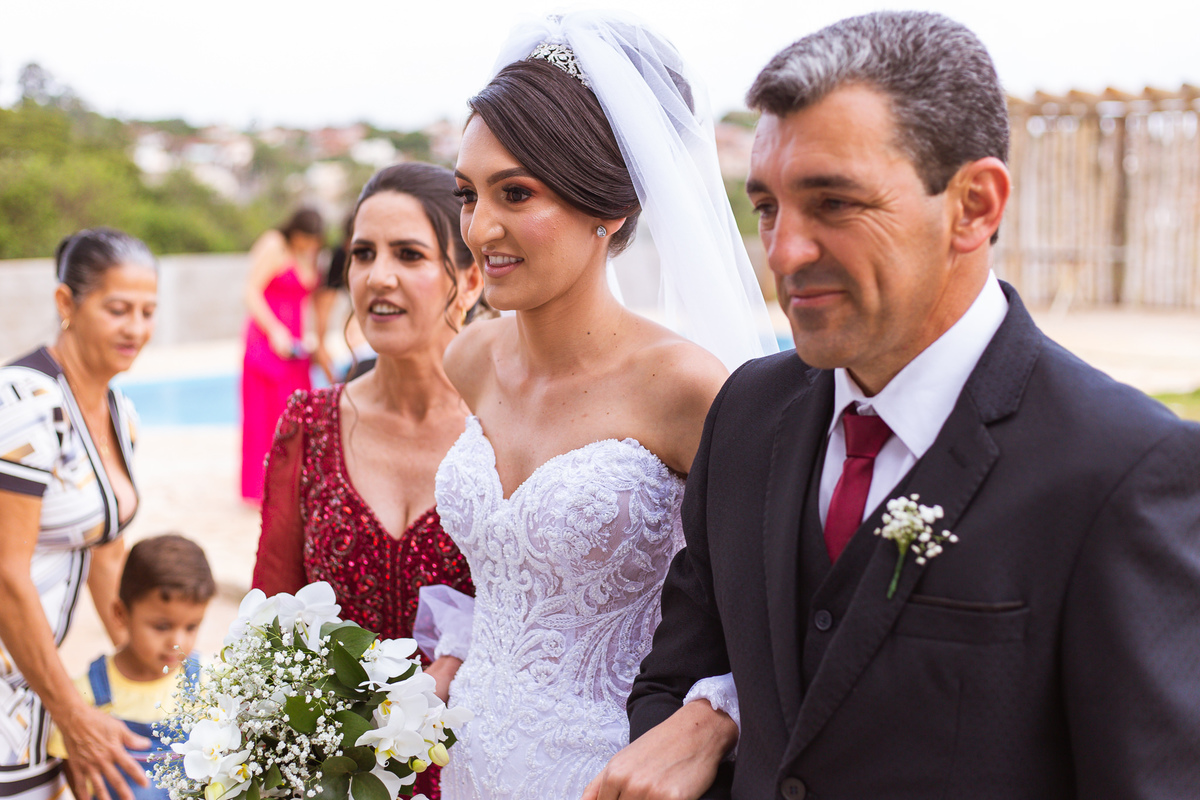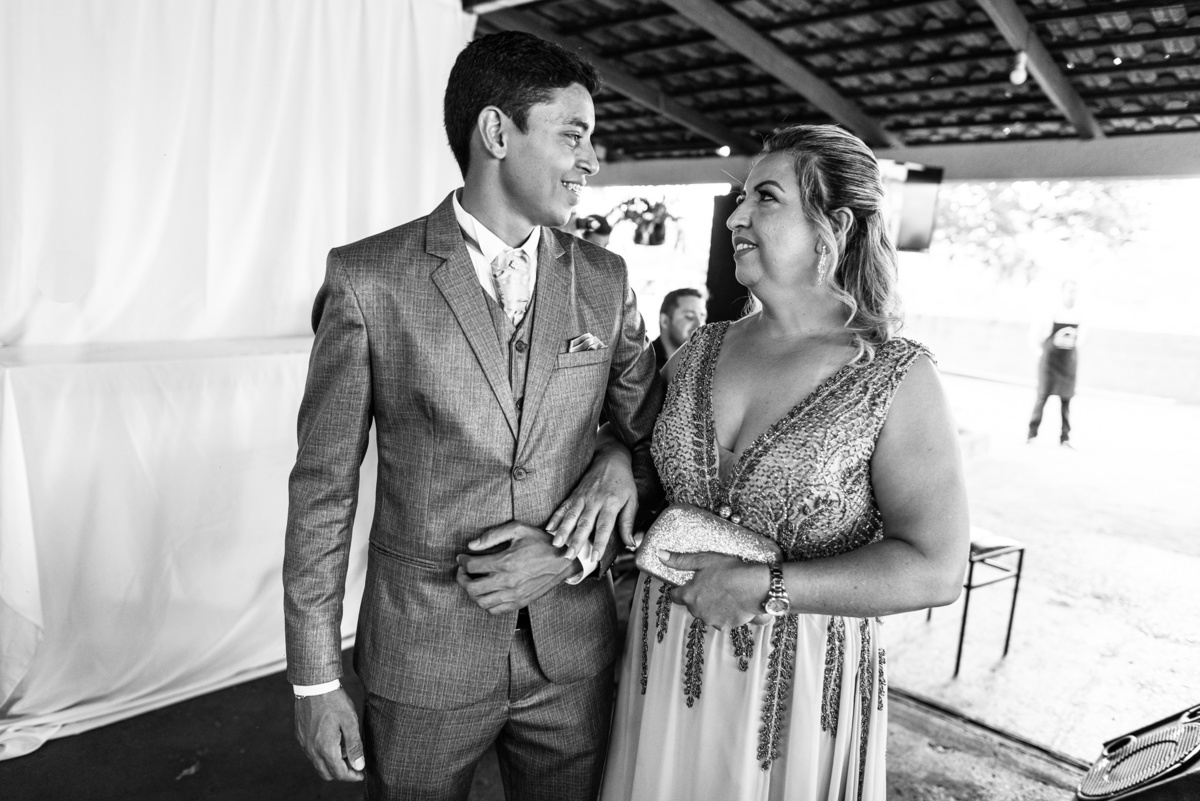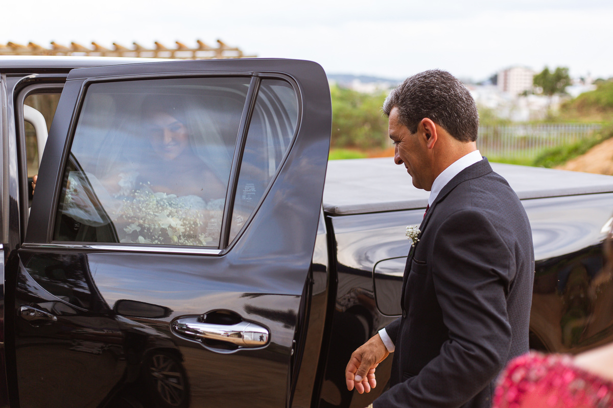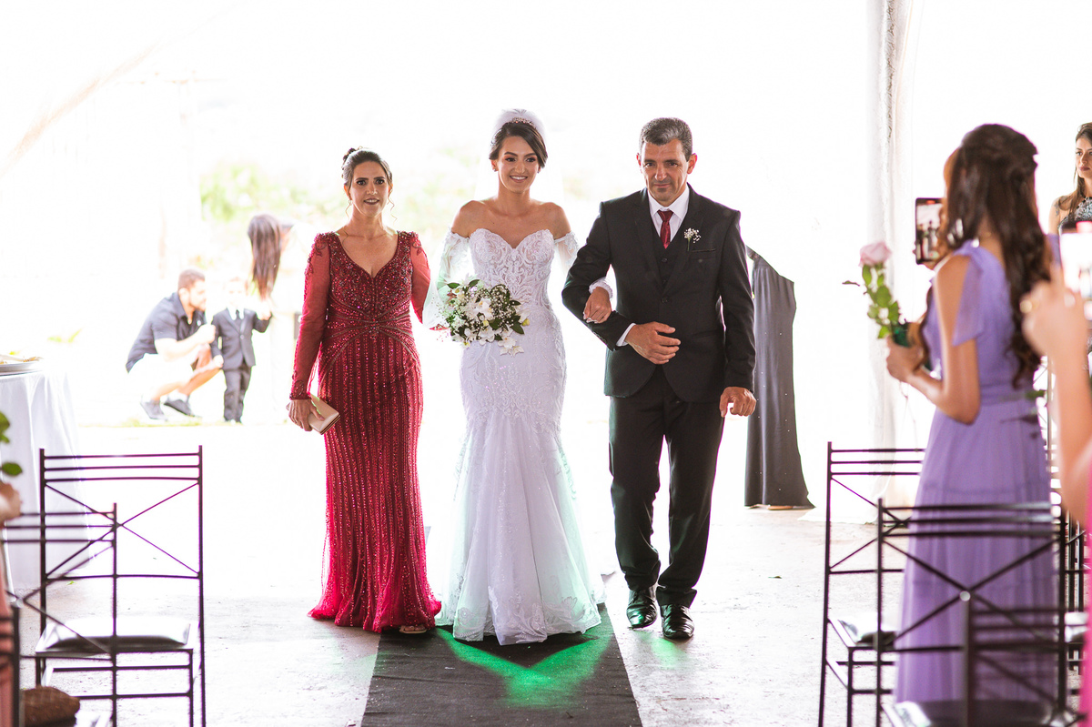 Os convidados estavam todos preparados e a fila dos padrinhos organizada. O céu estava maravilhoso e a tarde dizia que tudo seria perfeito. Camila chegou no local, fizemos algumas fotos tradicionais ali no carro e fomos para a cerimônia. Weverson já estava apostos, aguardando o início também. Os músicos estavam preparados e a celebração teve seu início assim que o Pastor celebrante fez sua entrada juntamente com sua esposa. Os padrinhos entraram logo após e fizeram seu desfile. Logo após foi a vez de Weverson adentrar. Sorridente e de braços dados com sua mãe, o noivo caminhou até o altar e ali ficou aguardando finalmente a entrada de sua futura esposa.