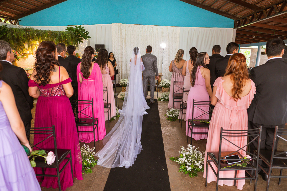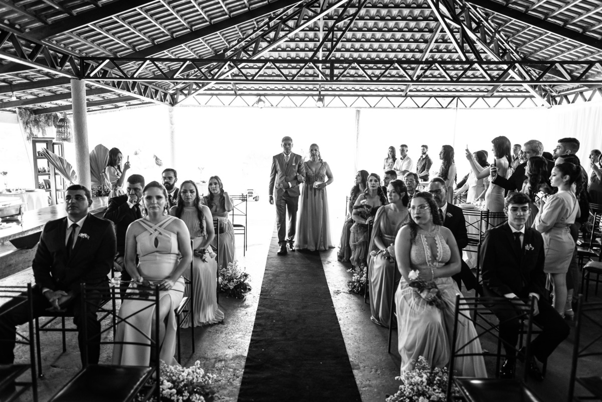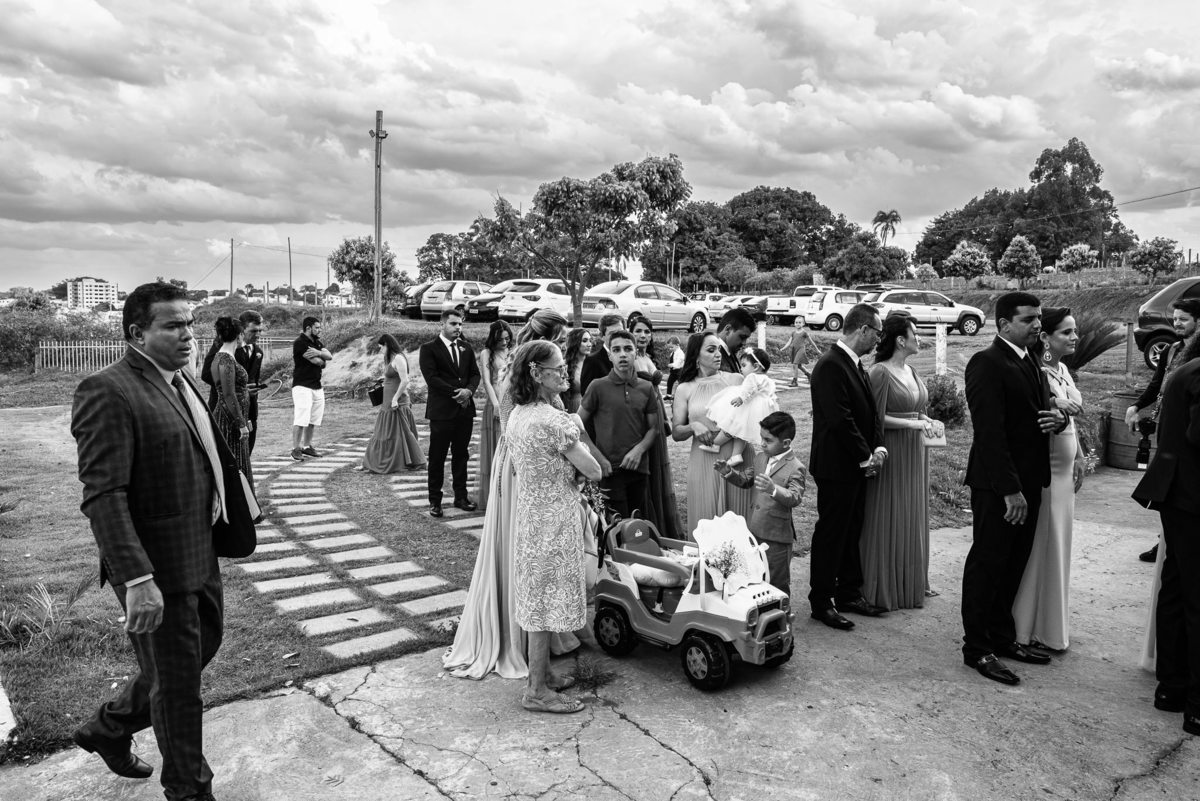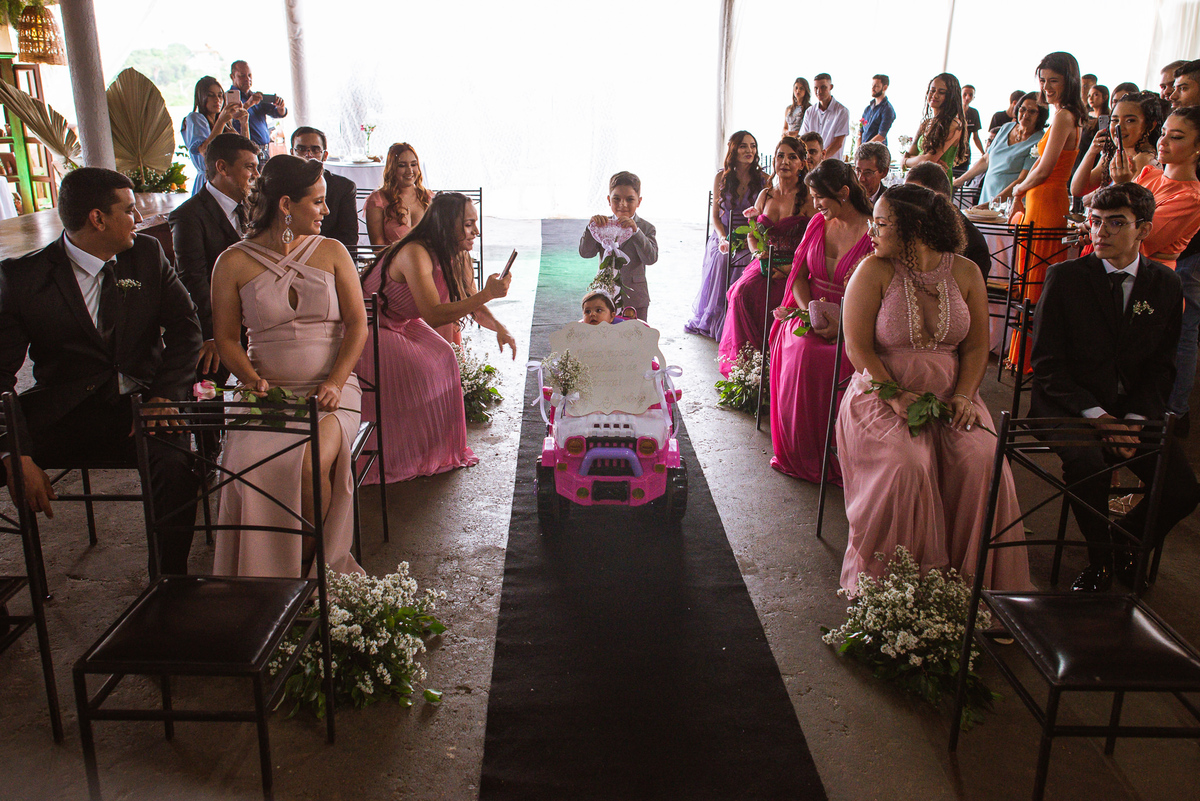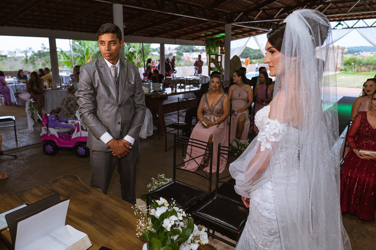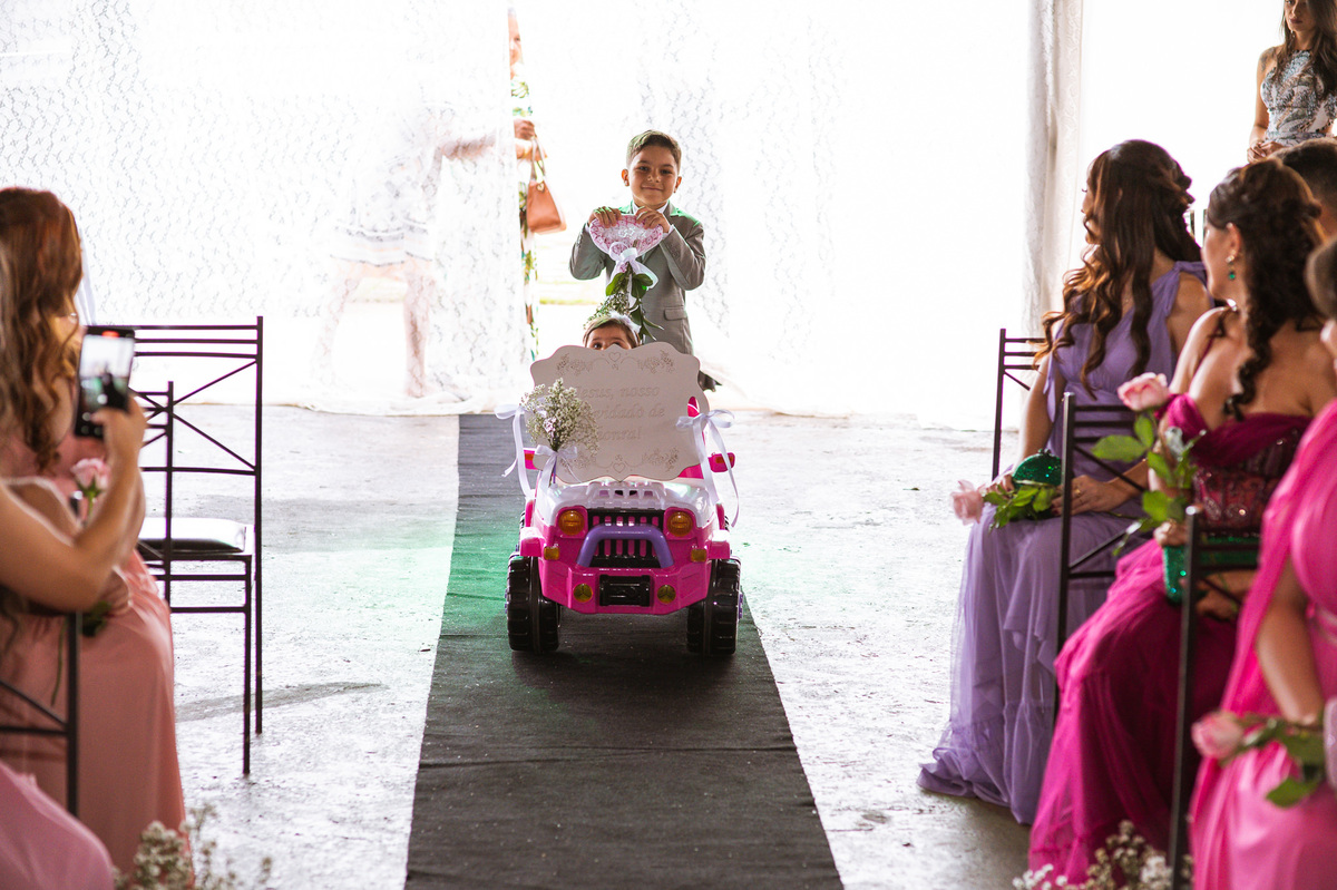 Os convidados estavam todos preparados e a fila dos padrinhos organizada. O céu estava maravilhoso e a tarde dizia que tudo seria perfeito. Camila chegou no local, fizemos algumas fotos tradicionais ali no carro e fomos para a cerimônia. Weverson já estava apostos, aguardando o início também. Os músicos estavam preparados e a celebração teve seu início assim que o Pastor celebrante fez sua entrada juntamente com sua esposa. Os padrinhos entraram logo após e fizeram seu desfile. Logo após foi a vez de Weverson adentrar. Sorridente e de braços dados com sua mãe, o noivo caminhou até o altar e ali ficou aguardando finalmente a entrada de sua futura esposa.