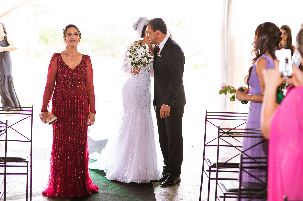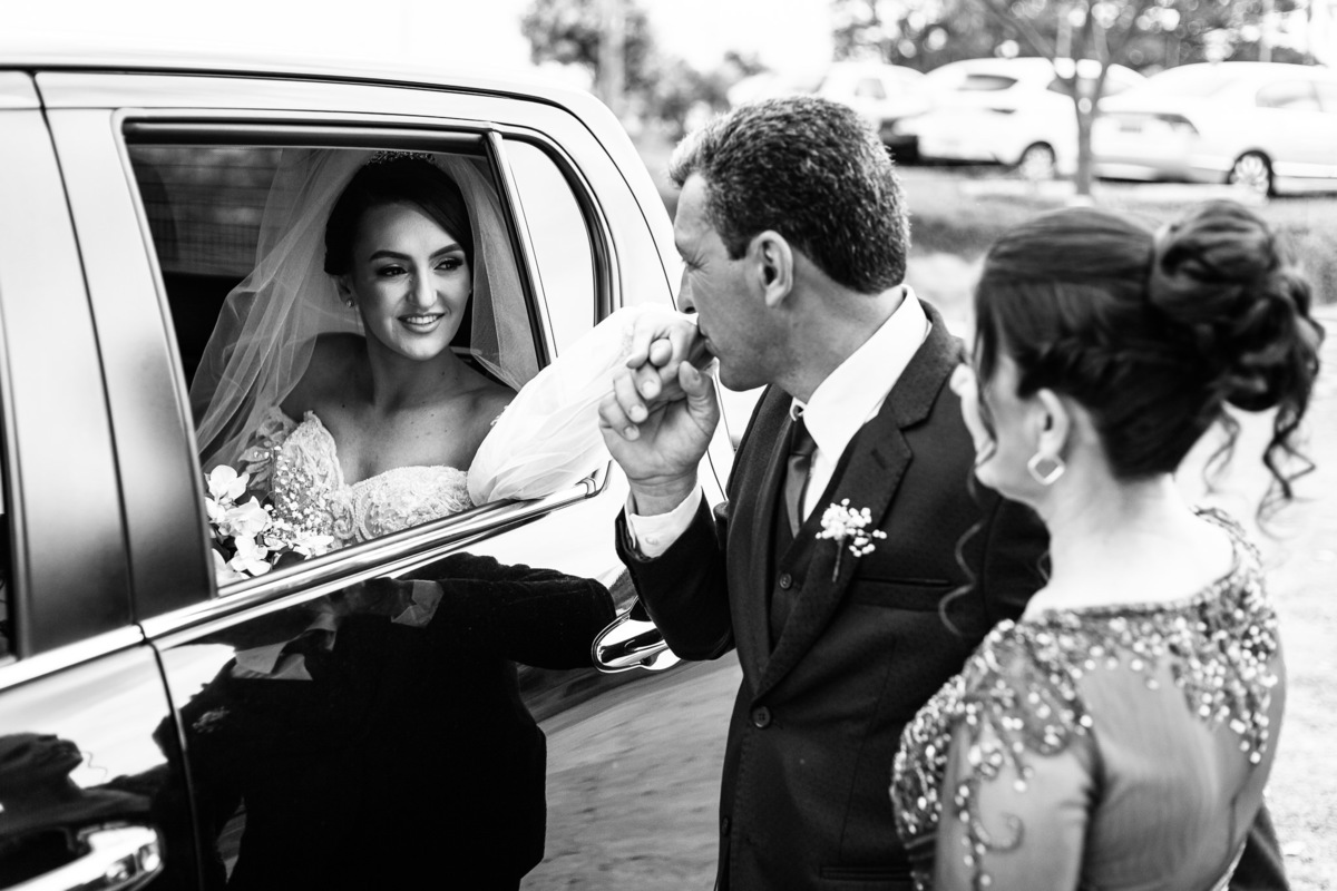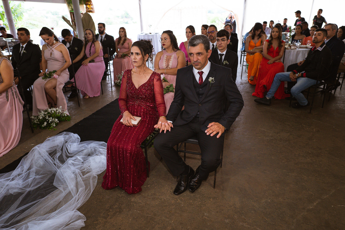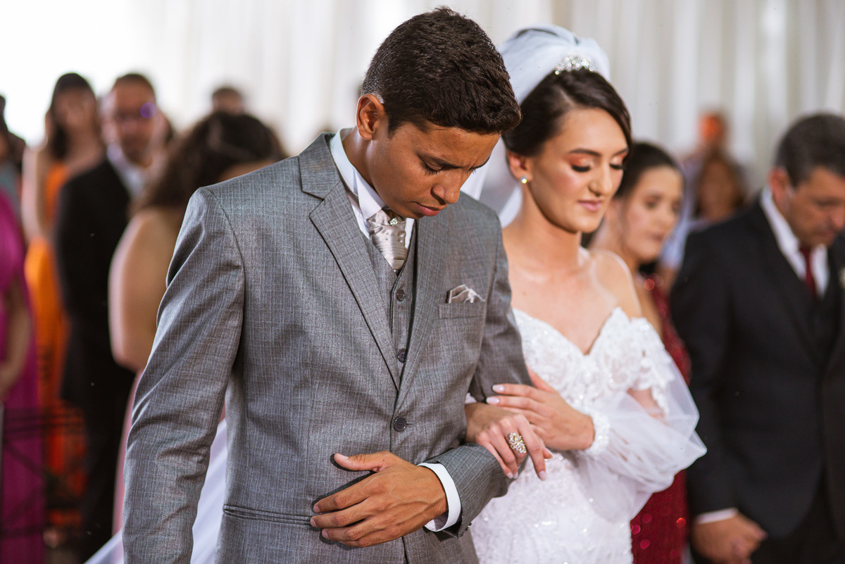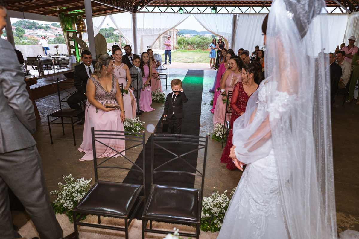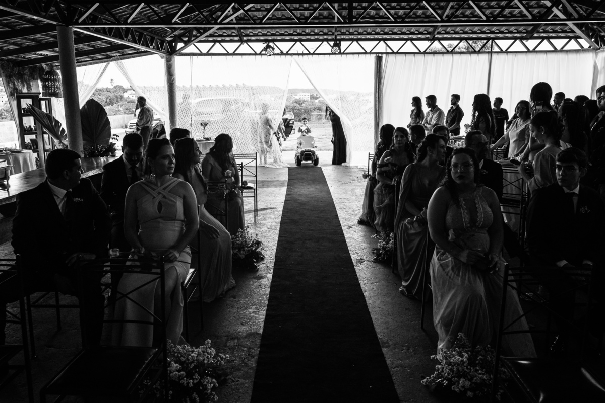 Os convidados estavam todos preparados e a fila dos padrinhos organizada. O céu estava maravilhoso e a tarde dizia que tudo seria perfeito. Camila chegou no local, fizemos algumas fotos tradicionais ali no carro e fomos para a cerimônia. Weverson já estava apostos, aguardando o início também. Os músicos estavam preparados e a celebração teve seu início assim que o Pastor celebrante fez sua entrada juntamente com sua esposa. Os padrinhos entraram logo após e fizeram seu desfile. Logo após foi a vez de Weverson adentrar. Sorridente e de braços dados com sua mãe, o noivo caminhou até o altar e ali ficou aguardando finalmente a entrada de sua futura esposa.