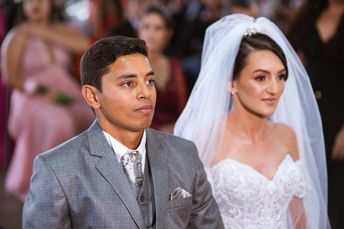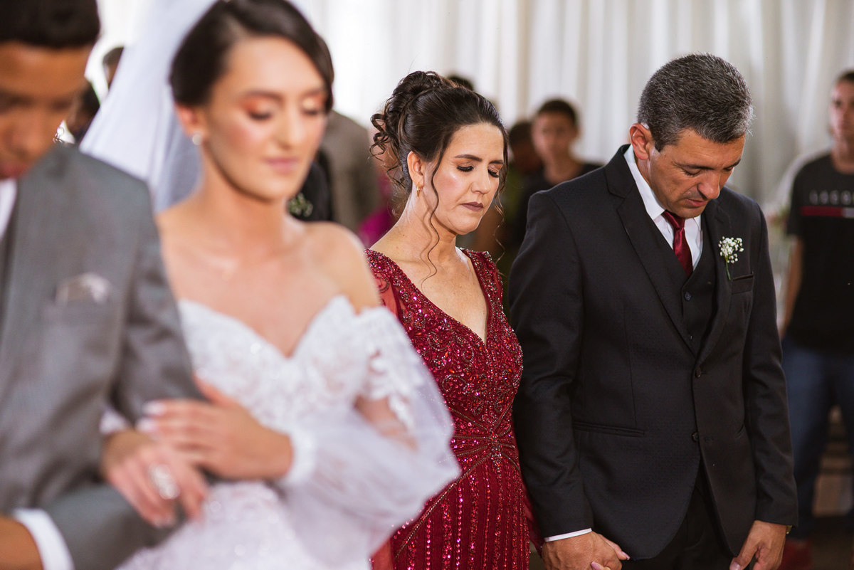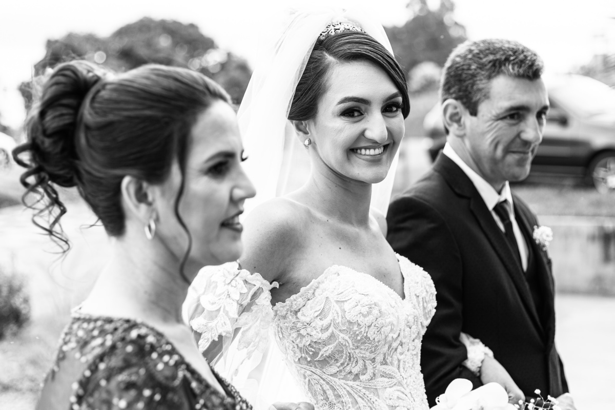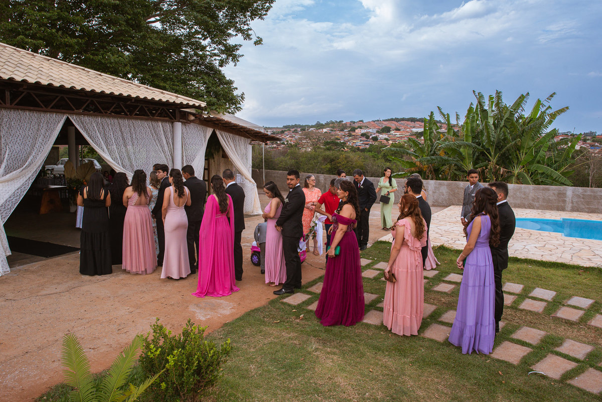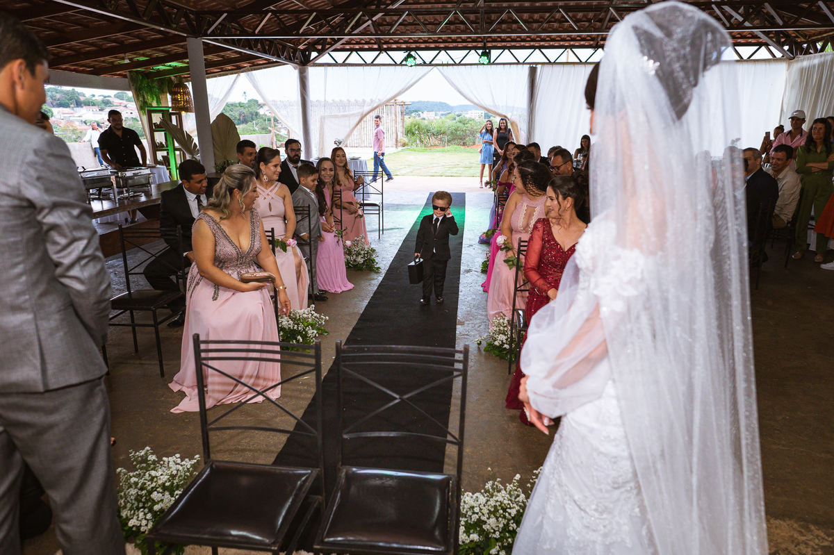 Os convidados estavam todos preparados e a fila dos padrinhos organizada. O céu estava maravilhoso e a tarde dizia que tudo seria perfeito. Camila chegou no local, fizemos algumas fotos tradicionais ali no carro e fomos para a cerimônia. Weverson já estava apostos, aguardando o início também. Os músicos estavam preparados e a celebração teve seu início assim que o Pastor celebrante fez sua entrada juntamente com sua esposa. Os padrinhos entraram logo após e fizeram seu desfile. Logo após foi a vez de Weverson adentrar. Sorridente e de braços dados com sua mãe, o noivo caminhou até o altar e ali ficou aguardando finalmente a entrada de sua futura esposa.