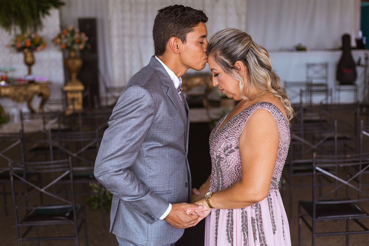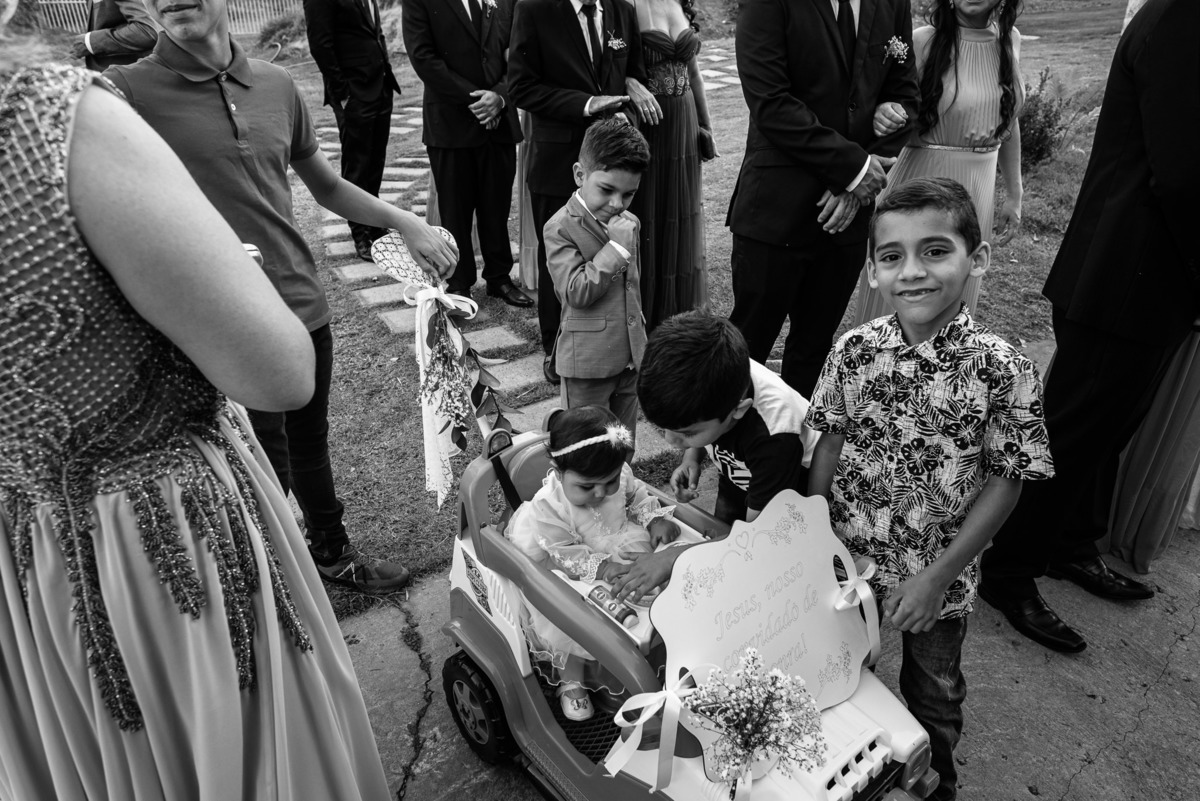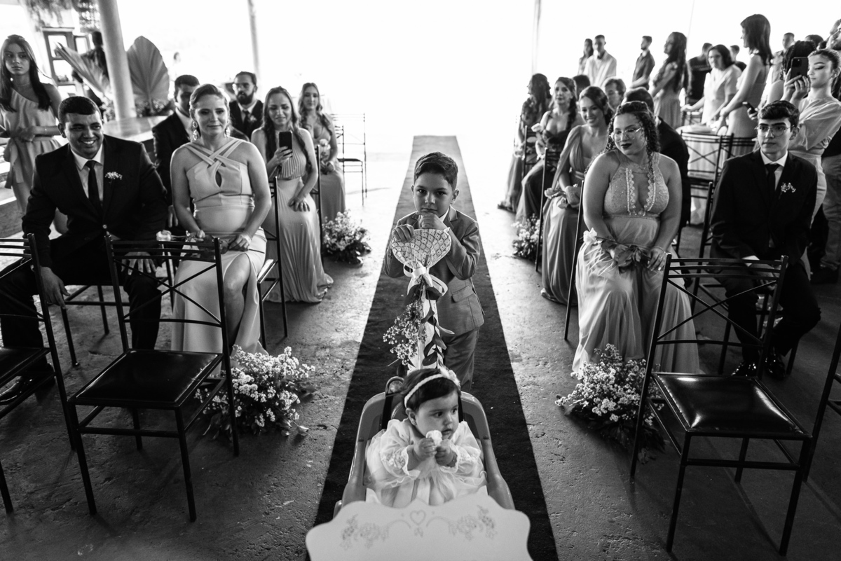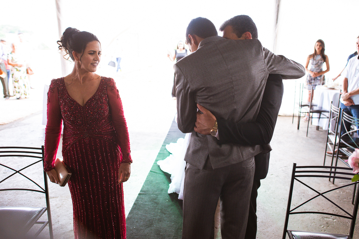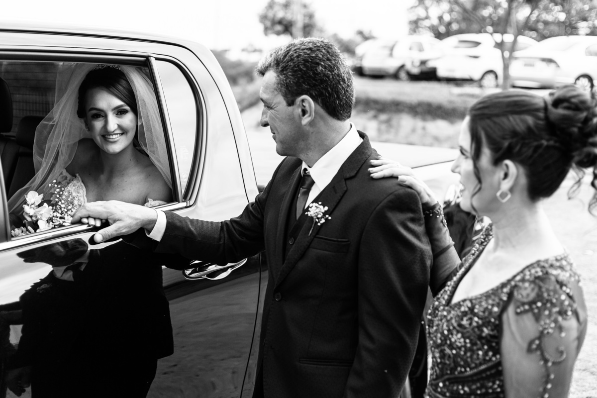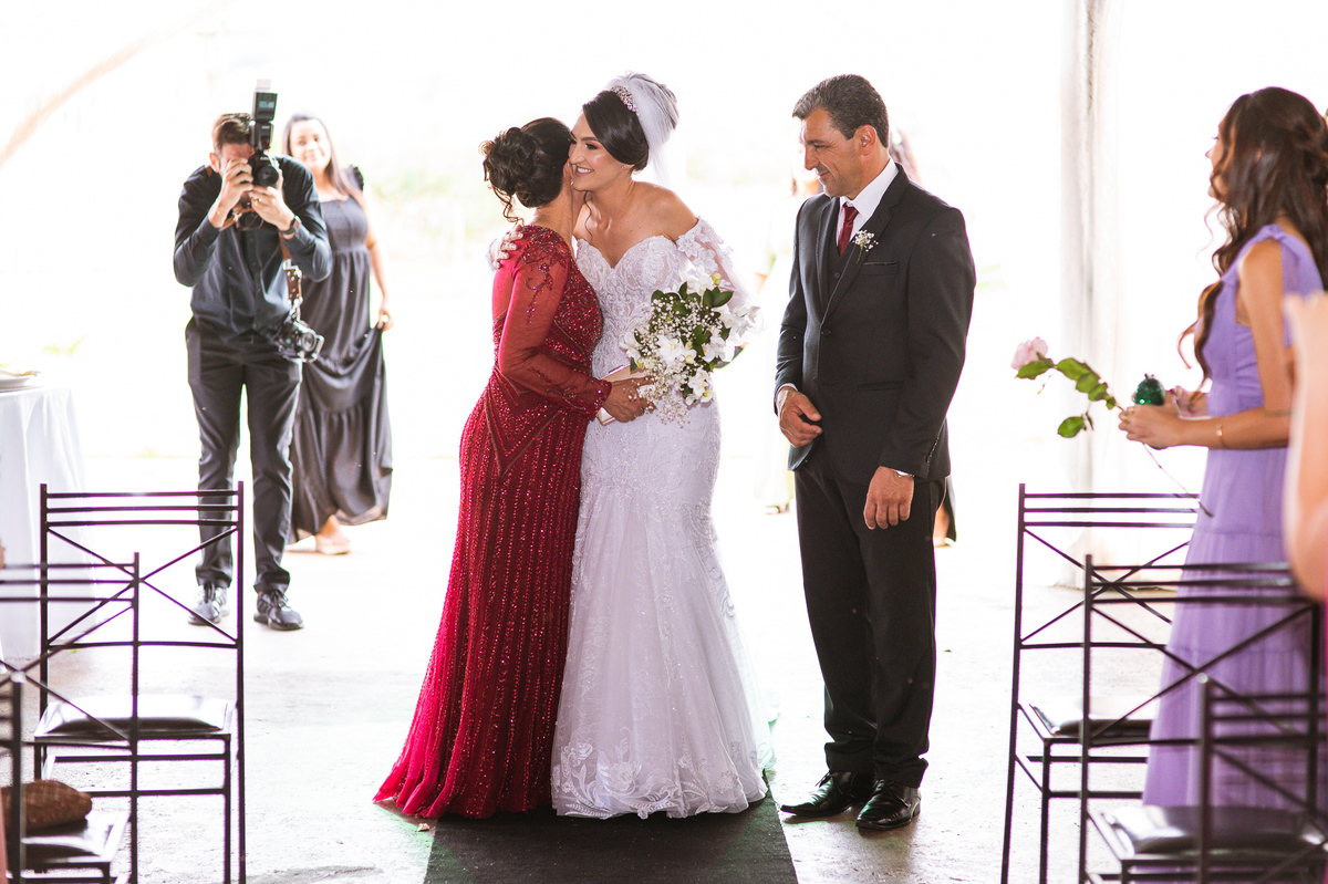 Os convidados estavam todos preparados e a fila dos padrinhos organizada. O céu estava maravilhoso e a tarde dizia que tudo seria perfeito. Camila chegou no local, fizemos algumas fotos tradicionais ali no carro e fomos para a cerimônia. Weverson já estava apostos, aguardando o início também. Os músicos estavam preparados e a celebração teve seu início assim que o Pastor celebrante fez sua entrada juntamente com sua esposa. Os padrinhos entraram logo após e fizeram seu desfile. Logo após foi a vez de Weverson adentrar. Sorridente e de braços dados com sua mãe, o noivo caminhou até o altar e ali ficou aguardando finalmente a entrada de sua futura esposa.