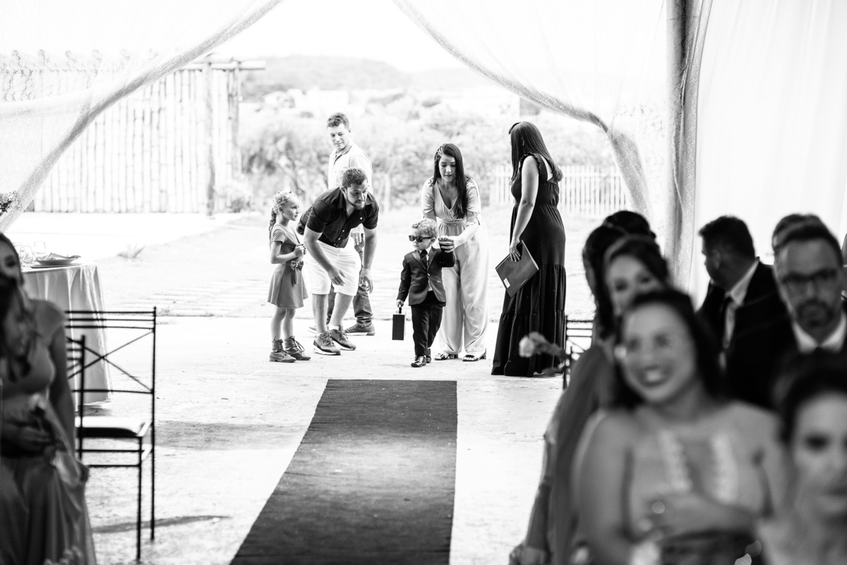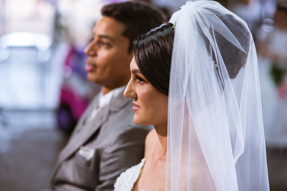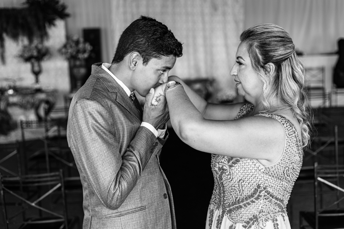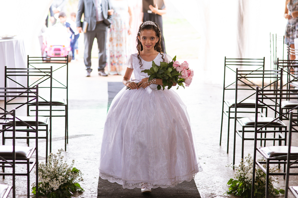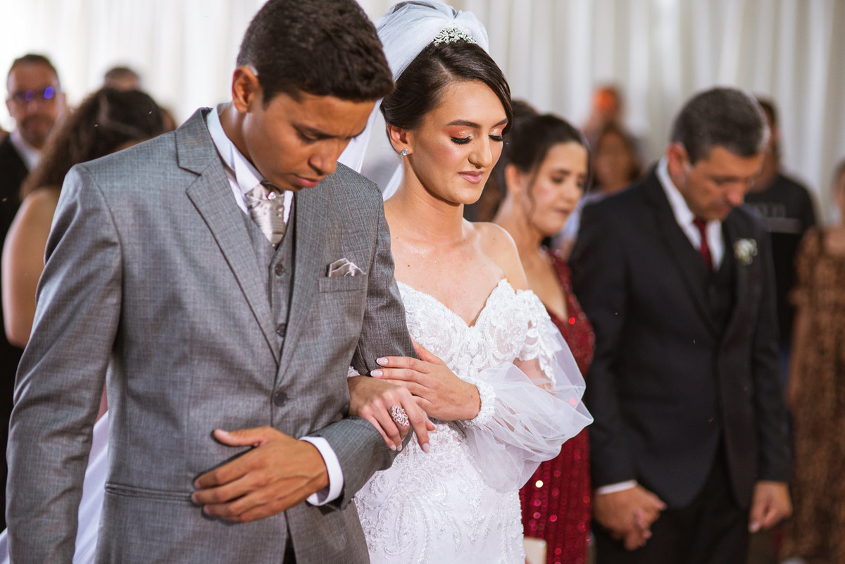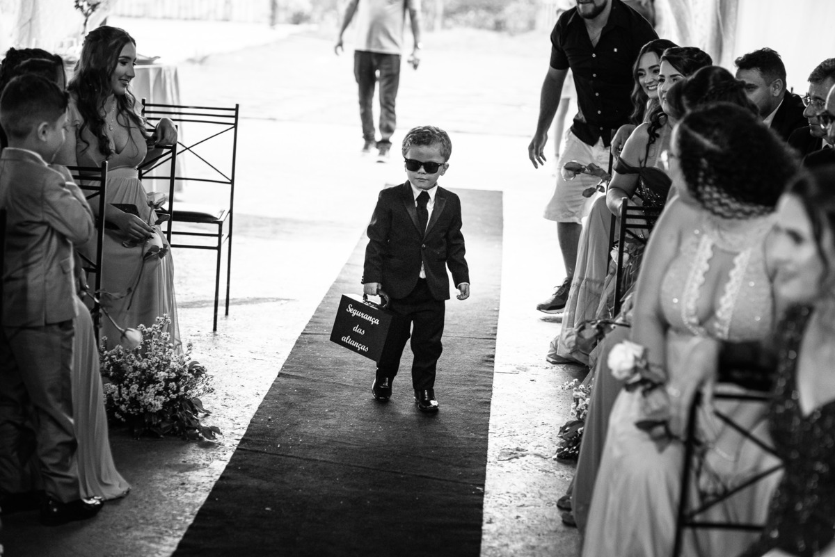 Os convidados estavam todos preparados e a fila dos padrinhos organizada. O céu estava maravilhoso e a tarde dizia que tudo seria perfeito. Camila chegou no local, fizemos algumas fotos tradicionais ali no carro e fomos para a cerimônia. Weverson já estava apostos, aguardando o início também. Os músicos estavam preparados e a celebração teve seu início assim que o Pastor celebrante fez sua entrada juntamente com sua esposa. Os padrinhos entraram logo após e fizeram seu desfile. Logo após foi a vez de Weverson adentrar. Sorridente e de braços dados com sua mãe, o noivo caminhou até o altar e ali ficou aguardando finalmente a entrada de sua futura esposa.