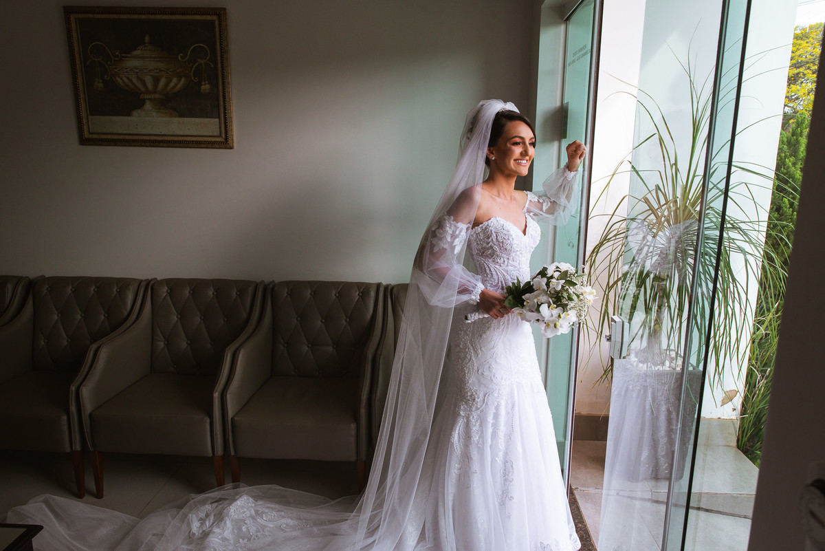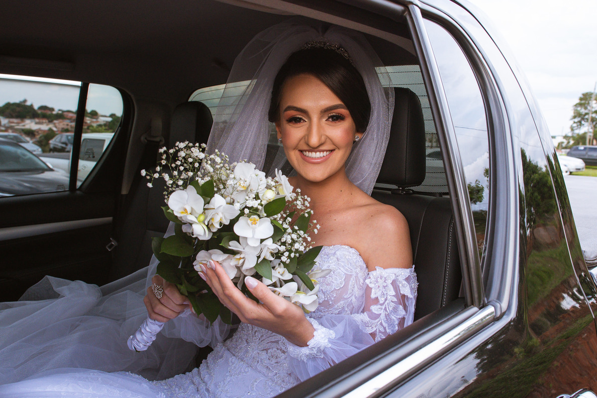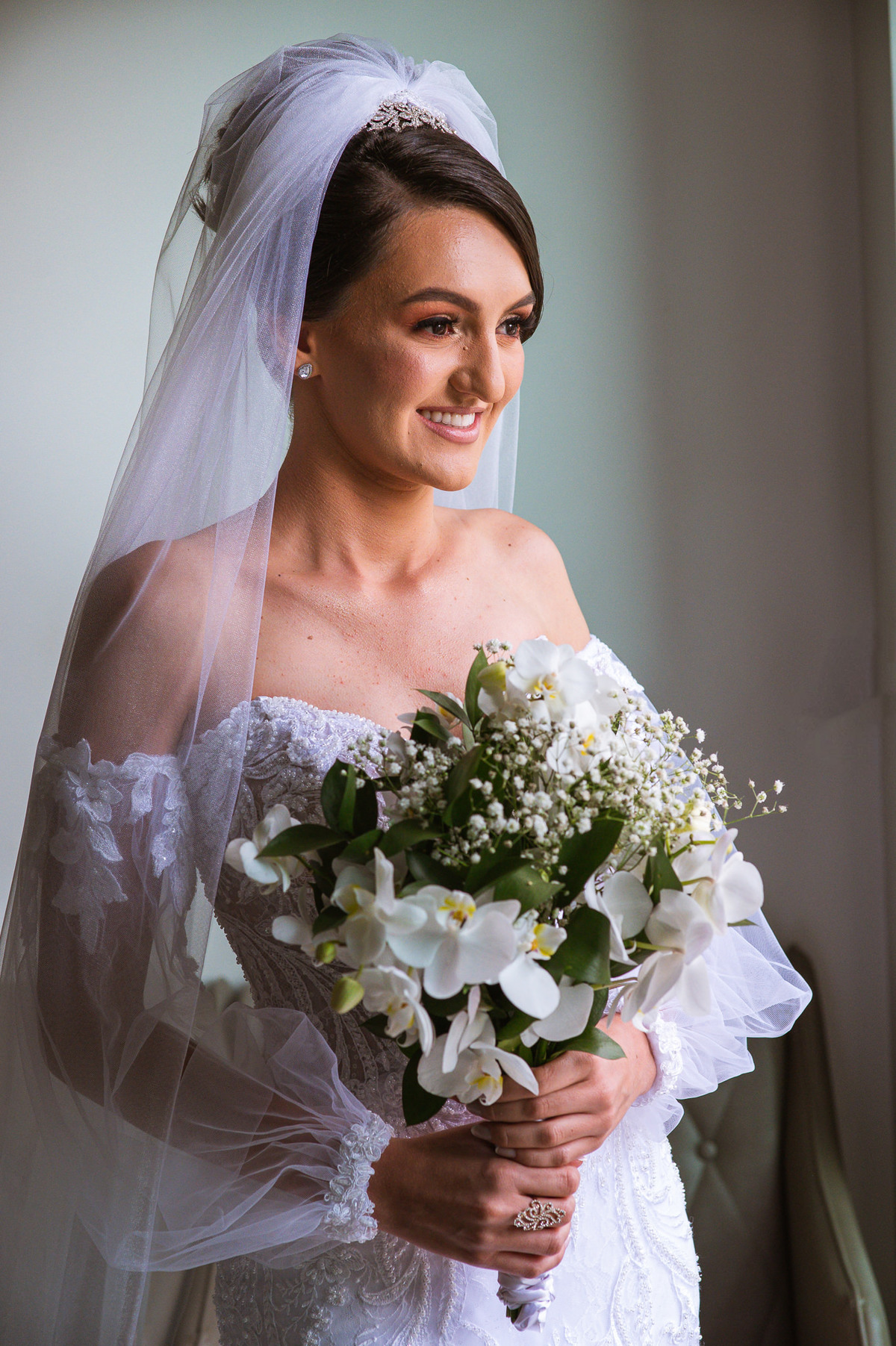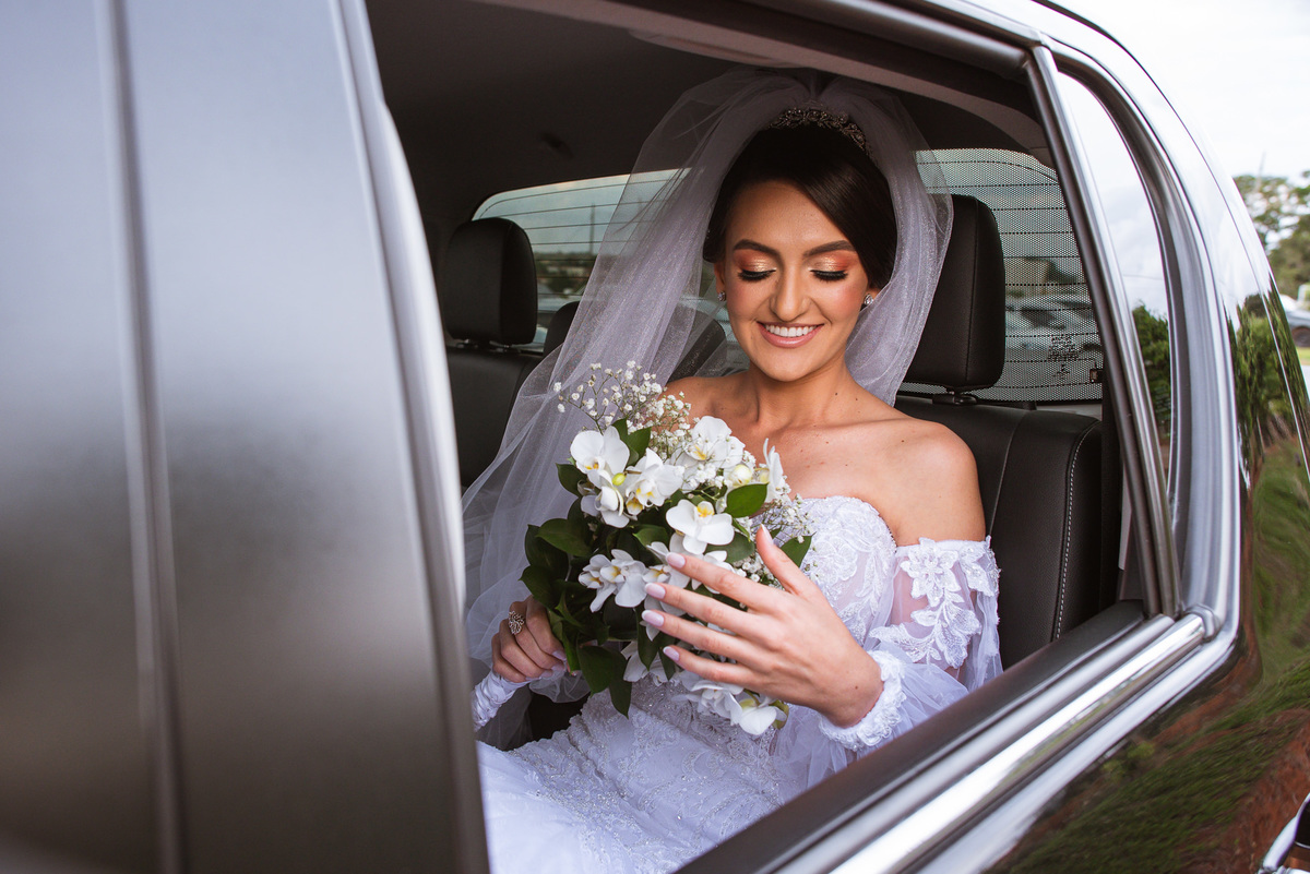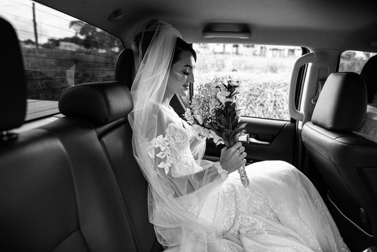 Agora com a produção completa, Camila estava pronta para colocar seu vestido maravilhoso. Em poucos minutos, ela surgiu deslumbrante com toda a produção finalizada e o vestido nos trinques. Passou seu perfume, colocou o véu e estava ali prontinha para casar. Fizemos uma mini sessão de fotos dela enquanto seu motorista chegava e conseguimos várias fotos lindas. Nessa hora o sorriso da noiva estava de canto a canto do rosto, misturando felicidade e anseio pelo seu momento de brilhar. Enfim, sua carruagem chegou e partimos para a cerimônia.